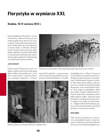 Florystyka w wymiarze XXL Kraków, 10-12 czerwca 2013 r. Studia podyplomowe Florystyka w naszym Uniwersytecie z roku na rok cieszą się coraz większą popularnością, obecnie trwa czwarta edycja, w której mam przyjemność uczestniczyć. Każdy zgodzi się ze stwierdzeniem, że kwiaty budzą w człowieku szlachetne uczucia, kształcą zmysł artystyczny, pobudzając wyobraźnię i wszystkie zmysły. Studia na tym kierunku umożliwiają nam samorealizację, poprzez połączenie osobistych pasji oraz zainteresowań z pracą zawodową. „COŚ Z NICZEGO” Każde warsztaty florystyczne są inne, wyjątkowe i pełne nowych wyzwań. Florystyka ślubna, żałobna, bożonarodzeniowa – to już dla nas żadna nowość i tajemnica! Zazwyczaj aranżujemy kompozycje z kwiatów Duża forma na konstrukcji z żebrowanego drutu, pędy roślin umieszczono w słoikach uprawianych specjalnie z przeznaczaniem na kwiat cięty, które specjalnie dla nas są kupowane na krakowskiej giełdzie, a nierzadko przyjeżdżają prosto z Alsmeer. Uczymy się też oszczędności i szacunku do materiału roślinnego. Czasami tworzymy „coś z niczego”, często wykorzystujemy nietypowe materiały. Takie zajęcia przeżywaliśmy w pierwszy czerwcowy weekend. Tematem były obiekty florystyczne, zwane inaczej dużymi formami. Tutaj osiąga się spektakularne efekty przy niezbyt wysokich nakładach finansowych na zakup roślin, a kompozycje zawsze budzą ogromny podziw. Zniszczone przez burzę drzewo, zeschnięte kwiatostany, kwiaty z ogrodu, trawy z łąki, stare słoiki, druciane – najlepiej zardzewiałe konstrukcje, gruba rura, która została po budowie nowej hali sportowej – tutaj nic się nie marnuje. DUŻE FORMY Wykorzystaliśmy stare skrzynki i doniczki z ubiegłego wieku 48 Takie elementy konstrukcyjne w towarzystwie różnorodnych kwiatów i innych elementów roślinnych, można było podziwiać (10-12 czerwca) na Wydziale Ogrodniczym. nie tylko nauka Po zajęciach, podczas których powstało 10 ogromnych prac, zdecydowaliśmy się na pokazanie ich w ramach wystawy Florystyka w rozmiarze XXL. Konar spalonego drzewa użyty w kompozycji dwóch studentek wyglądał naprawdę zadziwiająco, a przecież wydawałoby się, że już do niczego się nie nada. Do słoików nalano wody i umieszczono w nich kwiaty. Nie zmarnowały się nawet stare drewniane skrzynki, spękane gliniane donice, ani zardzewiałe ramy. Mogliśmy dać się ponieść wyobraźni i korzystać ze wszystkiego. Ogrom kwiatów sprowadzonych na zajęcia można było dodatkowo uzupełnić kwiatami i zielenią z kolekcji Katedry Roślin Ozdobnych (przy której studia działają). Połączenie świetnych pomysłów, jakie ukształtowały się w naszych głowach, z niebywałą ilością materiału florystycznego, doprowadziły do powstania wspaniałych prac, które budziły podziw pracowników i studentów Ogrodnictwa, Sztuki Ogrodowej i Architektury Krajobrazu oraz zwiedzających przybyłych na Wydział Ogrodniczy. Ale przecież to nie tylko zasługa zdolnych studentów, lecz również prowadzących, którzy poświęcają nam całą swoją uwagę i dają cenne wskazówki. Rozwój zdolności manualnych, poczucia estetyki, kształtowanie wyobraźni i zmysłu artystycznego to priorytet. Przy okazji towarzysząca nauce świetna atmosfera na zajęciach motywuje do podjęcia wyzwania, jakim jest nauka na tym kierunku. Wszystkich miłośników florystyki zapraszamy 20 września do Centrum Dopisała pogoda… część prac powstawała pod gołym niebem Handlowego Bonarka, gdzie odbędzie się egzamin praktyczny z florystyki (z udziałem publiczności), a następnie na 2-dniową wystawę naszych prac (to będzie już kolejny, czwarty Festiwal Kwiatów). Kwiaty to nasza pasja…! Uczestnicy warsztatów prowadzonych pod kierunkiem Moniki Kudłacz – wicemistrzyni Polski we florystyce 2012 (czwarta z prawej w dolnym rzędzie) 49 Opracowanie: Agata Sikora tegoroczna słuchaczka Florystyki i absolwentka Sztuki Ogrodowej Wydziału Ogrodniczego