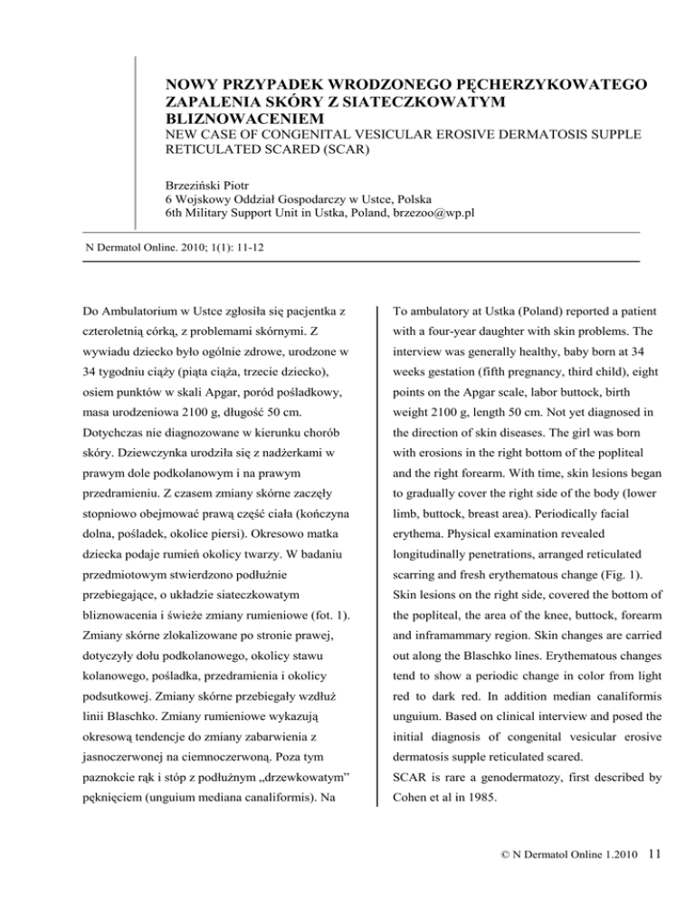 NOWY PRZYPADEK WRODZONEGO PĘCHERZYKOWATEGO ZAPALENIA SKÓRY Z SIATECZKOWATYM BLIZNOWACENIEM NEW CASE OF CONGENITAL VESICULAR EROSIVE DERMATOSIS SUPPLE RETICULATED SCARED (SCAR) Brzeziński Piotr 6 Wojskowy Oddział Gospodarczy w Ustce, Polska 6th Military Support Unit in Ustka, Poland, [email protected] N Dermatol Online. 2010; 1(1): 11-12 Do Ambulatorium w Ustce zgłosiła się pacjentka z To ambulatory at Ustka (Poland) reported a patient czteroletnią córką, z problemami skórnymi. Z with a four-year daughter with skin problems. The wywiadu dziecko było ogólnie zdrowe, urodzone w interview was generally healthy, baby born at 34 34 tygodniu ciąŜy (piąta ciąŜa, trzecie dziecko), weeks gestation (fifth pregnancy, third child), eight osiem punktów w skali Apgar, poród pośladkowy, points on the Apgar scale, labor buttock, birth masa urodzeniowa 2100 g, długość 50 cm. weight 2100 g, length 50 cm. Not yet diagnosed in Dotychczas nie diagnozowane w kierunku chorób the direction of skin diseases. The girl was born skóry. Dziewczynka urodziła się z nadŜerkami w with erosions in the right bottom of the popliteal prawym dole podkolanowym i na prawym and the right forearm. With time, skin lesions began przedramieniu. Z czasem zmiany skórne zaczęły to gradually cover the right side of the body (lower stopniowo obejmować prawą część ciała (kończyna limb, buttock, breast area). Periodically facial dolna, pośladek, okolice piersi). Okresowo matka erythema. Physical examination revealed dziecka podaje rumień okolicy twarzy. W badaniu longitudinally penetrations, arranged reticulated przedmiotowym stwierdzono podłuŜnie scarring and fresh erythematous change (Fig. 1). przebiegające, o układzie siateczkowatym Skin lesions on the right side, covered the bottom of bliznowacenia i świeŜe zmiany rumieniowe (fot. 1). the popliteal, the area of the knee, buttock, forearm Zmiany skórne zlokalizowane po stronie prawej, and inframammary region. Skin changes are carried dotyczyły dołu podkolanowego, okolicy stawu out along the Blaschko lines. Erythematous changes kolanowego, pośladka, przedramienia i okolicy tend to show a periodic change in color from light podsutkowej. Zmiany skórne przebiegały wzdłuŜ red to dark red. In addition median canaliformis linii Blaschko. Zmiany rumieniowe wykazują unguium. Based on clinical interview and posed the okresową tendencje do zmiany zabarwienia z initial diagnosis of congenital vesicular erosive jasnoczerwonej na ciemnoczerwoną. Poza tym dermatosis supple reticulated scared. paznokcie rąk i stóp z podłuŜnym „drzewkowatym” SCAR is rare a genodermatozy, first described by pęknięciem (unguium mediana canaliformis). Na Cohen et al in 1985. © N Dermatol Online 1.2010 11 podstawie wywiadu oraz obrazu klinicznego It is characterized by blisters and erosions at birth, postawiono wstępne rozpoznanie wrodzonego which heal relatively quickly, creating evenly pęcherzykowego i nadŜerkowego zapalenia skóry z reticulate scars. To date, 17 cases of the disease siateczkowatym bliznowaceniem. (data from Pubmed database.) Due to the lack of Jednostka określana jako SCAR jest rzadką specialized diagnostic patient was submitted to the genodermatozą, po raz pierwszy opisaną przez Department of Dermatology. Cohena i wsp. w 1985 roku. Charakteryzuje się nadŜerkami i pęcherzami po urodzeniu, które goją się stosunkowo szybko, tworząc równomiernie, siateczkowate blizny. Dotychczas opisano 17 przypadków tego schorzenia (dane z bazy Pubmed). Ze względu na brak moŜliwości specjalistycznej diagnostyki pacjentkę przekazano do Kliniki Dermatologicznej. Fot. 1. Zmiany rumieniowe i siateczkowate bliznowacenie na przedramieniu Ryc. 1. Erythematous and reticulate scarring on the forearm 12 © N Dermatol Online 1.2010