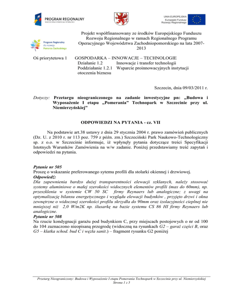 Projekt współfinansowany ze środków Europejskiego Funduszu Rozwoju Regionalnego w ramach Regionalnego Programu Operacyjnego Województwa Zachodniopomorskiego na lata 20072013 Oś priorytetowa 1 GOSPODARKA – INNOWACJE – TECHNOLOGIE Działanie 1.2 Innowacje i transfer technologii Poddziałanie 1.2.1 Wsparcie proinnowacyjnych instytucji otoczenia biznesu Szczecin, dnia 09/03/2011 r. Dotyczy: Przetargu nieograniczonego na zadanie inwestycyjne pn: „Budowa i Wyposażenie I etapu „Pomerania” Technopark w Szczecinie przy ul. Niemierzyńskiej” ODPOWIEDZI NA PYTANIA - cz. VII Na podstawie art.38 ustawy z dnia 29 stycznia 2004 r. prawo zamówień publicznych (Dz. U. z 2010 r. nr 113 poz. 759 z późn. zm.) Szczeciński Park Naukowo-Technologiczny sp. z o.o. w Szczecinie informuje, iż wpłynęły pytania dotyczące treści Specyfikacji Istotnych Warunków Zamówienia na w/w zadanie. Poniżej przedstawiamy treść zapytań i odpowiedzi na pytania. Pytanie nr 505 Proszę o wskazanie preferowanego sytemu profili dla stolarki okiennej i drzwiowej. Odpowiedź: Dla zapewnienia bardzo dużej transparentności elewacji szklanych, należy stosować systemy aluminiowe o małej szerokości widocznych elementów profili (max do 60mm), np. przeszklenia w systemie CW 50 SC firmy Reynaers lub analogiczne; z uwagi na optymalizację bilansu energetycznego i wyglądu elewacji budynków , przyjęto drzwi i okna zewnętrzne o widocznej szerokości profilu skrzydła do 90mm oraz izolacyjności cieplnej nie mniejszej niż 2,0 W/m2K np. ślusarkę na bazie systemu CS 86 HI firmy Reynaers lub analogiczne. Pytanie nr 508 Na rzucie kondygnacji garażu pod budynkiem C, przy miejscach postojowych o nr od 100 do 104 zaznaczono nieopisaną przegrodę (widoczną na rysunkach G2 – garaż części B, oraz G5 – klatka schod. bud C i węzła sanit.) – fragment rysunku G2 poniżej Przetarg Nieograniczony: Budowa i Wyposażenie I etapu Pomerania Technopark w Szczecinie przy ul. Niemierzyńskiej Strona 1 z 5 Proszę o odpowiedź czy wskazana przegroda wchodzi w zakres wyceny? Jeżeli tak, to proszę o określenie z jakiego materiału należy ją wykonać, określić sposób montażu, przykładowego producenta itp. Odpowiedź: Wygrodzenie ciągu pieszego w garażu wykonać należy z pasa blachy aluminiowej perforowanej gr. 1,5mm, o szerokości 2m, mocowanego do słupków stalowych (przekrój kwadratowy 50x50mm) przykręcanych do posadzki i stropu, rozmieszczonych w odstępach co 60cm; blacha o perforacji z oczek kwadratowych 8/12mm (np. firmy Mevaco), malowana na kolor zielony, montowana na wys. 20cm nad posadzką. Pytanie nr 511 Proszę o wskazanie odporności ogniowej następujących drzwi D27, D32, DG6, DG8, gdyż istnieje rozbieżność pomiędzy częścią rysunkową architektury a zestawieniem stolarki i ślusarki drzwiowej. Odpowiedź: Drzwi D27, D32 oraz DG6 posiadają odporność ogniową EI30 , natomiast drzwi sanitarne DG8 nie posiadają odporności ogniowej. Pytanie nr 513 Dot. Odpowiedzi nr 497 i 498: W udostępnionej dokumentacji nie ma rysunków konstrukcyjnych ścian attyk B-2 i C-2, brak też zestawień stali dla tych elementów – prosimy o uzupełnienie. Odpowiedź: Przetarg Nieograniczony: Budowa i Wyposażenie I etapu Pomerania Technopark w Szczecinie przy ul. Niemierzyńskiej Strona 2 z 5 Attyka B-2 jest narysowana z podciągiem nż.B-7.3 i 7.4 Rys. 116/KW. Attyka C-2 jest narysowana z podciągiem nż. C-7.3 i 7.4 Rys. 134/KW. Pytanie nr 514 Na kondygnacji pierwszego piętra w budynku B opisano 2 okna O6 o wymiarach 125x250, oraz 5 okien O6 o wymiarach 125x200. Proszę o odpowiedź, które wytyczne uznać za właściwie do wyceny? Odpowiedź: Wszystkie okna O6 powinny mieć wysokość 250cm (zgodnie z zestawieniem ślusarki jest ich 7 na kondygnacji pierwszego piętra w budynku B). Pytanie nr 520 Dokumentacja rysunkowa projektu wykonawczego branży architektonicznej nie wskazuje dokładnie sposobu obróbki powierzchni poziomych ścian attyk, dla budynku A, B oraz C. Proszę o potwierdzenie informacji, iż w wycenie należy uwzględnić obróbkę ścian attyki w postaci blachy cynkowo-tytanowej, montowanej poprzez płytę OSB o gr.2cm, do zagruntowanej i odizolowanej przeciwwilgociowo ściany: - szerokość blachy cynkowo-tytanowej po rozwinięciu ~80cm, - szerokość płyty OSB (szerokość ściany attyki łącznie z dociepleniem powiększona o 2cm) ~48cm. Odpowiedź: Zgodnie z projektem, obróbki blacharskie (również na szczycie ścian attykowych) wykonać należy z blachy aluminiowej gr. 0,7 mm w kolorze grafitowym (w kolorze okładziny elewacyjnej), zgodnie z zasadami wiedzy technicznej i sztuką budowlaną. Pytanie nr 521 Proszę o potwierdzanie informacji, iż w wycenie należy uwzględnić obróbkę pionowych powierzchni attyk w postaci 8cm warstwy polistyrenu ekstradowanego. Odpowiedź: Pionowe ściany attyk (od strony dachów) docieplić należy styropianem gr.8cm. Pytanie nr 522 Zgodnie z dokumentacją wykonawczą branży architektonicznej, na stropodachu budynku A, (rys. A4, rys. A10A) przewidziano systemową obudowę z płyt warstwowych. Proszę o wskazanie gdzie w dokumentacji ”PW inst. wody lodowej” znajduje się dokładna specyfikacja danej obudowy. Proszę o udostępnienie dokumentacji odnośnie danych Przetarg Nieograniczony: Budowa i Wyposażenie I etapu Pomerania Technopark w Szczecinie przy ul. Niemierzyńskiej Strona 3 z 5 przegród o: - dane techniczne (wymagania wytrzymałościowe, termiczne itp.), - dane montażowe (projekt ewentualnej podkonstrukcji oraz sposób zamocowania do płyty stropodachu), - dane geometryczne (grubość płyty, wysokości poszczególnych zabudów przez które nie przebiega przekrój). Proszę o wskazanie układu warstw posadzkowych przewidzianych na obszarach wykreślonych przez systemową obudowę z płyt warstwowych. Odpowiedź: Do obudowy instalacji wody lodowej na dachu nalezy zastosować kontenery modułowe składane z płyt warstwow