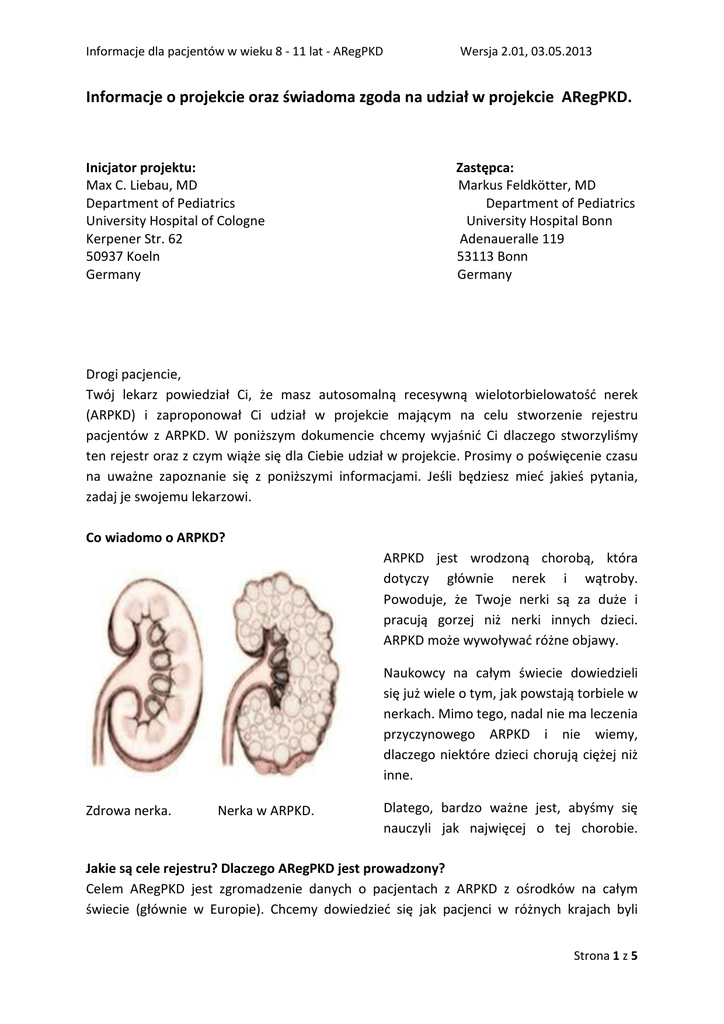 Informacje dla pacjentów w wieku 8 - 11 lat - ARegPKD Wersja 2.01, 03.05.2013 Informacje o projekcie oraz świadoma zgoda na udział w projekcie ARegPKD. Inicjator projektu: Max C. Liebau, MD Department of Pediatrics University Hospital of Cologne Kerpener Str. 62 50937 Koeln Germany Zastępca: Markus Feldkötter, MD Department of Pediatrics University Hospital Bonn Adenaueralle 119 53113 Bonn Germany Drogi pacjencie, Twój lekarz powiedział Ci, że masz autosomalną recesywną wielotorbielowatość nerek (ARPKD) i zaproponował Ci udział w projekcie mającym na celu stworzenie rejestru pacjentów z ARPKD. W poniższym dokumencie chcemy wyjaśnić Ci dlaczego stworzyliśmy ten rejestr oraz z czym wiąże się dla Ciebie udział w projekcie. Prosimy o poświęcenie czasu na uważne zapoznanie się z poniższymi informacjami. Jeśli będziesz mieć jakieś pytania, zadaj je swojemu lekarzowi. Co wiadomo o ARPKD? ARPKD jest wrodzoną chorobą, która dotyczy głównie nerek i wątroby. Powoduje, że Twoje nerki są za duże i pracują gorzej niż nerki innych dzieci. ARPKD może wywoływać różne objawy. Naukowcy na całym świecie dowiedzieli się już wiele o tym, jak powstają torbiele w nerkach. Mimo tego, nadal nie ma leczenia przyczynowego ARPKD i nie wiemy, dlaczego niektóre dzieci chorują ciężej niż inne. Zdrowa nerka. Nerka w ARPKD. Dlatego, bardzo ważne jest, abyśmy się nauczyli jak najwięcej o tej chorobie. Jakie są cele rejestru? Dlaczego ARegPKD jest prowadzony? Celem ARegPKD jest zgromadzenie danych o pacjentach z ARPKD z ośrodków na całym świecie (głównie w Europie). Chcemy dowiedzieć się jak pacjenci w różnych krajach byli Strona 1 z 5 Informacje dla pacjentów w wieku 8 - 11 lat - ARegPKD Wersja 2.01, 03.05.2013 leczeni i czy to leczenie było skuteczne. Chcemy także poszukać wrodzonych przyczyn łagodniejszego lub cięższego przebiegu ARPKD. Ponieważ ARPKD występuje rzadko, każdy lekarz ma tylko kilku pacjentów z tą chorobą. Dlatego też, chcemy zebrać dane z różnych ośrodków w jeden centralny rejestr. Z tego powodu rejestr jest wspierany m.in. przez Niemieckie Towarzystwo Nefrologii Dziecięcej (GPN- German Pediatric Nephrology Association). Kto może wziąć udział w rejestrze? Jak dołączyć do rejestru? Tylko lekarze mogą dodawać dane do ARegPKD. Nie musisz wprowadzać danych samodzielnie. Każdy pacjent z ARPKD może wziąć udział w ARegPKD. Lekarz będzie mógł dodać Twoje dane do rejestru, tylko wtedy, gdy się na to zgodzisz. Kto nie może wziąć udziału w rejestrze? Pacjenci, u których rozpoznano inną postać torbielowatości nerek (nie ARPKD), nie mogą wziąć udziału w projekcie. Jak rejestr jest prowadzony? Jakie dane są gromadzone? Jakie badania będą wykonywane? Jeśli Ty i Twoi rodzice wyrazicie zgodę, lekarz będzie mógł umieścić informacje o przebiegu Twojej choroby w bazie danych. Twoje imię i nazwisko oraz adres nie zostaną zapisane. Te dane będą zastąpione kodem (np. Harry Potter z Kolonii -> 01-13). Tylko Twój lekarz będzie znał ten kod. Co roku, Twój lekarz będzie dodawał informacje o tym, jak się czujesz. Informacje o przechowywaniu materiału biologicznego. Jak próbki materiału biologicznego będą pozyskiwane? Co się będzie działo z tymi próbkami? Jeśli podczas wizyty kontrolnej będą wykonywane rutynowe badania laboratoryjne, to przy tej samej okazji zostanie pobrana dodatkowa próbka krwi. Ilość krwi potrzebna do badania to 5 – 30ml. Raz w roku będziemy w ten sposób pobierać 2-10ml krwi. Z tych próbek krwi możemy uzyskać Twój materiał genetyczny. Będą to robić nasi partnerzy: Prof. Dr C. Bergmann z Instytutu Bionaukowego Diagnostyki Medycznej, Laboratorium Centrum Genetyki Człowieka w Ingelheim w Niemczech oraz Prof. Dr K. Zerres ze Szpitala Uniwersyteckiego w Aachen, Instytutu Genetyki Człowieka w Aachen w Niemczech. Jeśli będziesz mieć wykonaną biopsję, to chcielibyśmy otrzymać fragment bioptatu do analizy oraz na potrzeby dalszych badań nad chorobą. ARegPKD umożliwia ocenę mikroskopową uzyskanego materiału przez osobę, która bardzo dużo wie o ARPKD. Tą osobą jest Prof. Dr R. Büttner z Instytutu Patologii Szpitala Uniwersyteckiego w Kolonii. Strona 2 z 5 Informacje dla pacjentów w wieku 8 - 11 lat - ARegPKD Wersja 2.01, 03.05.2013 Chcemy zbierać próbki krwi i inne próbki od naszych pacjentów i przechowywać je w tak zwanych „biobankach”. Z tych próbek może być m.in. wyizolowany materiał genetyczny, który także będzie przechowywany. Jeśli się zgodzisz, próbki będą użyte tylko i wyłącznie do badań naukowych nad torbielowatością nerek. Czy jakiekolwiek dodatkowe badania lub konsultacje będą przeprowadzane na potrzeby ARegPKD? Nie. Wasz lekarz wprowadzi dane do rejestru. Nie będzie żadnych dodatkowych badań i hospitalizacji, które w innych okolicznościach (bez udziału w projekcie) nie byłyby przeprowadzone. Co istotne, nie będzie dodatkowych pobrań krwi. Jakie ryzyko jest związane z udziałem w ARegPKD? ARegPKD jest badaniem rejestracyjnym. W ramach ARegPKD gromadzone będą już uzyskane dane. Nie będzie zmian w leczeniu. Nie będzie dodatkowych pobrań krwi, ale małe próbki krwi będą gromadzone dla ARegPKD przy okazji innych pobrań. Jakie są korzyści dla pacjenta i dla lekarza z udziału w rejestrze? Jakie są koszty? Czy uczestnik otrzyma wynagrodzenie? Nie będzie bezpośrednich korzyści dla Ciebie z udziału w projekcie. Potencjalnie, wszyscy pacjenci z ARegPKD mogą odnieść korzyść z wyników projektu badawczego. Nie będzie żadnych kosztów dla uczestników projektu. Nie będzie żadnego wynagrodzenia dla uczestników projektu. Co się będzie działo z moimi danymi? Wszystkie dane i wyniki będą poufne, nie będziemy o nich z nikim rozmawiać. Pod koniec projektu napiszemy artykuł, w którym przedstawimy jego wyniki, ale tak, aby żaden pacjent nie mógł być rozpoznany. 