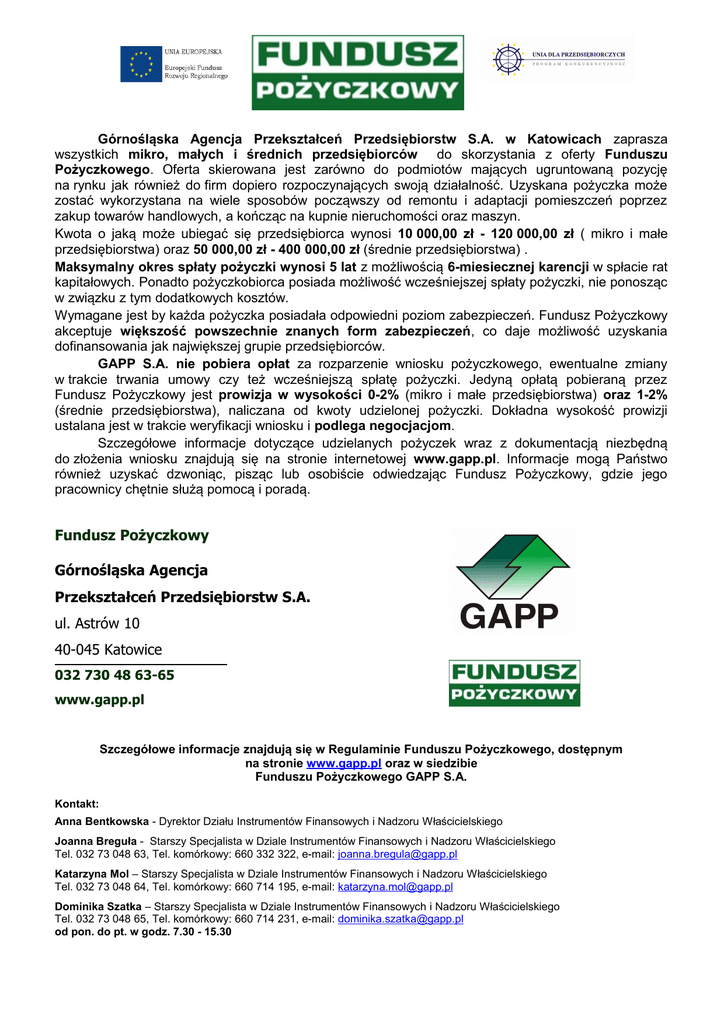 Górnośląska Agencja Przekształceń Przedsiębiorstw S.A. w Katowicach zaprasza wszystkich mikro, małych i średnich przedsiębiorców do skorzystania z oferty Funduszu Pożyczkowego. Oferta skierowana jest zarówno do podmiotów mających ugruntowaną pozycję na rynku jak również do firm dopiero rozpoczynających swoją działalność. Uzyskana pożyczka może zostać wykorzystana na wiele sposobów począwszy od remontu i adaptacji pomieszczeń poprzez zakup towarów handlowych, a kończąc na kupnie nieruchomości oraz maszyn. Kwota o jaką może ubiegać się przedsiębiorca wynosi 10 000,00 zł - 120 000,00 zł ( mikro i małe przedsiębiorstwa) oraz 50 000,00 zł - 400 000,00 zł (średnie przedsiębiorstwa) . Maksymalny okres spłaty pożyczki wynosi 5 lat z możliwością 6-miesiecznej karencji w spłacie rat kapitałowych. Ponadto pożyczkobiorca posiada możliwość wcześniejszej spłaty pożyczki, nie ponosząc w związku z tym dodatkowych kosztów. Wymagane jest by każda pożyczka posiadała odpowiedni poziom zabezpieczeń. Fundusz Pożyczkowy akceptuje większość powszechnie znanych form zabezpieczeń, co daje możliwość uzyskania dofinansowania jak największej grupie przedsiębiorców. GAPP S.A. nie pobiera opłat za rozparzenie wniosku pożyczkowego, ewentualne zmiany w trakcie trwania umowy czy też wcześniejszą spłatę pożyczki. Jedyną opłatą pobieraną przez Fundusz Pożyczkowy jest prowizja w wysokości 0-2% (mikro i małe przedsiębiorstwa) oraz 1-2% (średnie przedsiębiorstwa), naliczana od kwoty udzielonej pożyczki. Dokładna wysokość prowizji ustalana jest w trakcie weryfikacji wniosku i podlega negocjacjom. Szczegółowe informacje dotyczące udzielanych pożyczek wraz z dokumentacją niezbędną do złożenia wniosku znajdują się na stronie internetowej www.gapp.pl. Informacje mogą Państwo również uzyskać dzwoniąc, pisząc lub osobiście odwiedzając Fundusz Pożyczkowy, gdzie jego pracownicy chętnie służą pomocą i poradą. Fundusz Pożyczkowy Górnośląska Agencja Przekształceń Przedsiębiorstw S.A. ul. Astrów 10 40-045 Katowice 032 730 48 63-65 www.gapp.pl Szczegółowe informacje znajdują się w Regulaminie Funduszu Pożyczkowego, dostępnym na stronie www.gapp.pl oraz w siedzibie Funduszu Pożyczkowego GAPP S.A. Kontakt: Anna Bentkowska - Dyrektor Działu Instrumentów Finansowych i Nadzoru Właścicielskiego Joanna Breguła - Starszy Specjalista w Dziale Instrumentów Finansowych i Nadzoru Właścicielskiego Tel. 032 73 048 63, Tel. komórkowy: 660 332 322, e-mail: [email protected] Katarzyna Mol – Starszy Specjalista w Dziale Instrumentów Finansowych i Nadzoru Właścicielskiego Tel. 032 73 048 64, Tel. komórkowy: 660 714 195, e-mail: [email protected] Dominika Szatka – Starszy Specjalista w Dziale Instrumentów Finansowych i Nadzoru Właścicielskiego Tel. 032 73 048 65, Tel. komórkowy: 660 714 231, e-mail: [email protected] od pon. do pt. w godz. 7.30 - 15.30