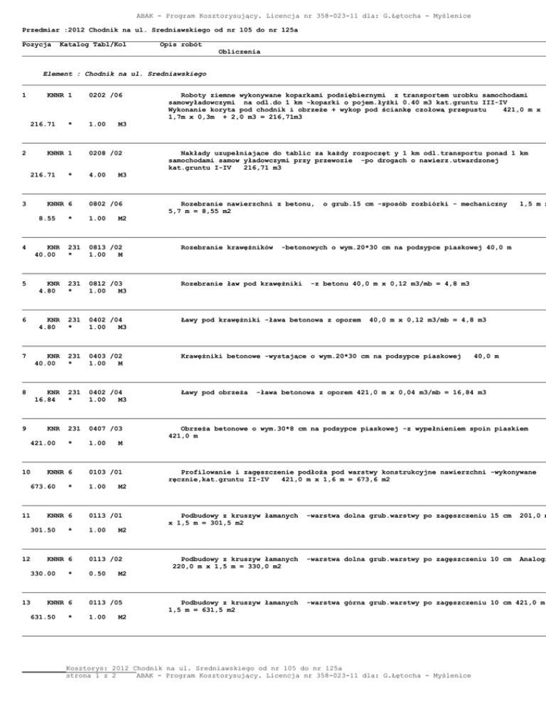 ABAK - Program Kosztorysujący. Licencja nr 358-023-11 dla: G.Łętocha - Myślenice Przedmiar :2012 Chodnik na ul. Sredniawskiego od nr 105 do nr 125a Pozycja Katalog Tabl/Kol Opis robót Obliczenia Element : Chodnik na ul. Sredniawskiego 1 KNNR 1 216.71 2 * KNNR 1 216.71 3 * KNNR 6 8.55 0202 /06 1.00 M3 0208 /02 4.00 1.00 Nakłady uzupełniające do tablic za każdy rozpoczęt y 1 km odl.transportu ponad 1 km samochodami samow yładowczymi przy przewozie -po drogach o nawierz.utwardzonej kat.gruntu I-IV 216,71 m3 M3 0802 /06 * Roboty ziemne wykonywane koparkami podsiębiernymi z transportem urobku samochodami samowyładowczymi na odl.do 1 km -koparki o pojem.łyżki 0.40 m3 kat.gruntu III-IV Wykonanie koryta pod chodnik i obrzeże + wykop pod ściankę czołową przepustu 421,0 m x 1,7m x 0,3m + 2,0 m3 = 216,71m3 Rozebranie nawierzchni z betonu, 5,7 m = 8,55 m2 o grub.15 cm -sposób rozbiórki - mechaniczny M2 4 KNR 40.00 231 * 0813 /02 1.00 M Rozebranie krawężników 5 KNR 4.80 231 * 0812 /03 1.00 M3 Rozebranie ław pod krawężniki 6 KNR 4.80 231 * 0402 /04 1.00 M3 Ławy pod krawężniki -ława betonowa z oporem 7 KNR 40.00 231 * 0403 /02 1.00 M Krawężniki betonowe -wystające o wym.20*30 cm na podsypce piaskowej 8 KNR 16.84 231 * 0402 /04 1.00 M3 Ławy pod obrzeża 9 KNR 231 0407 /03 * 1.00 421.00 10 KNNR 6 673.60 11 KNNR 6 301.50 12 * KNNR 6 330.00 13 * * KNNR 6 631.50 * 40,0 m -ława betonowa z oporem 421,0 m x 0,04 m3/mb = 16,84 m3 Obrzeża betonowe o wym.30*8 cm na podsypce piaskowej -z wypełnieniem spoin piaskiem 421,0 m Profilowanie i zagęszczenie podłoża pod warstwy konstrukcyjne nawierzchni -wykonywane ręcznie,kat.gruntu II-IV 421,0 m x 1,6 m = 673,6 m2 Podbudowy z kruszyw łamanych x 1,5 m = 301,5 m2 -warstwa dolna grub.warstwy po zagęszczeniu 15 cm 201,0 m Podbudowy z kruszyw łamanych 220,0 m x 1,5 m = 330,0 m2 -warstwa dolna grub.warstwy po zagęszczeniu 10 cm Analogi M2 0113 /05 1.00 40,0 m x 0,12 m3/mb = 4,8 m3 M2 0113 /02 0.50 -z betonu 40,0 m x 0,12 m3/mb = 4,8 m3 M2 0113 /01 1.00 -betonowych o wym.20*30 cm na podsypce piaskowej 40,0 m M 0103 /01 1.00 1,5 m x Podbudowy z kruszyw łamanych 1,5 m = 631,5 m2 -warstwa górna grub.warstwy po zagęszczeniu 10 cm 421,0 m M2 Kosztorys: 2012 Chodnik na ul. Sredniawskiego od nr 105 do nr 125a strona 1 z 2 ABAK - Program Kosztorysujący. Licencja nr 358-023-11 dla: G.Łętocha - Myślenice ABAK - Program Kosztorysujący. Licencja nr 358-023-11 dla: G.Łętocha - Myślenice Przedmiar :2012 Chodnik na ul. Sredniawskiego od nr 105 do nr 125a Pozycja Katalog Tabl/Kol Opis robót Obliczenia 14 KNNR 6 330.00 15 * KNNR 6 301.50 0502 /01 1.00 Chodniki z kostki brukowej betonowej z wypełnieneim spoin piaskiem -kostka szara grub.6 cm na podsypce piaskowej 220,0 m x 1,5 m = 330,0 m2 M2 0502 /04 Chodniki z kostki brukowej betonowej z wypełnieneim spoin piaskiem -kostka ko0lorowa grub.8 cm na podsypce piaskowej 201,0 m x 1,5 m = 301,5 m2 * 1.00 233 0606 /01 3.00 * 1.00 KNR 0.15 233 * 0702 /01 1.00 MG(T) Montaż 18 KNNR 1 210.50 * 0501 /01 1.00 M2 Ręczne plantowanie pow.gruntu rodzimego -kat.gruntu I-III 19 KNNR 1 3.00 * 0103 /01 1.00 SZT Ścinanie drzew piłą mechaniczną -średn.drzew 10-15 cm 20 KNNR 1 16 17 KNR 3.00 * M2 scianka dł. M3 0104 /01 1.00 Obudowy wlotów (wylotów) prefabrykowanych przepustów drogowych rurowych 4,0m, szerokości 30 cm i wysokości 2,5 m = 3,0 m3 poręczy mostowych odcinki proste ( wraz z materiałem ) 150 kg 421,0 m x 0,5 m = 210,5 m2 3 szt. Karczowanie pni koparką podsiębierną w gruntach o normalnej wilgotności -kat.gruntu I-II średn.pni 10-15 cm 3 szt. SZT Razem: Chodnik na ul. Sredniawskiego Kosztorys: 2012 Chodnik na ul. Sredniawskiego od nr 105 do nr 125a strona 2 z 2 ABAK - Program Kosztorysujący. Licencja nr 358-023-11 dla: G.Łętocha - Myślenice