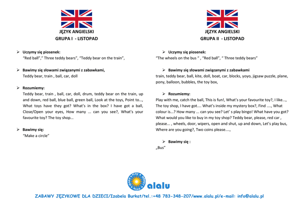 JĘZYK ANGIELSKI GRUPA I - LISTOPAD JĘZYK ANGIELSKI GRUPA II - LISTOPAD Uczymy się piosenek: “Red ball”,” Three teddy bears”, “Teddy bear on the train”, Uczymy się piosenek: “The wheels on the bus “ , “Red ball”, “ Three teddy bears” Bawimy się słowami związanymi z zabawkami, Teddy bear, train , ball, car, doll Bawimy się słowami związanymi z zabawkami train, teddy bear, ball, kite, doll, boat, car, blocks, yoyo, jigsaw puzzle, plane, pony, balloon, bubbles, the toy box, Rozumiemy: Teddy bear, train , ball, car, doll, drum, teddy bear on the train, up and down, red ball, blue ball, green ball, Look at the toys, Point to…, What toys have they got? What’s in the box? I have got a ball, Close/Open your eyes, How many ... can you see?, What’s your favourite toy? The toy shop... Bawimy się: “Make a circle” Rozumiemy: Play with me, catch the ball, This is fun!, What’s your favourite toy?, I like..., The toy shop, I have got.... What’s inside my mystery box?, Find ...., What colour is...? How many ... can you see? Let’ s play bingo! What have you got? What would you like to buy in my toy shop? Teddy bear, please, red car , please... , wheels, door, wipers, open and shut, up and down, Let’s play bus, Where are you going?, Two coins please...., Bawimy się : „Bus” ZABAWY JĘZYKOWE DLA DZIECI/Izabela Burkat/tel.:+48 783-348-207/www.alalu.pl/e-mail: [email protected] JĘZYK ANGIELSKI GRUPA III – LISTOPAD Uczymy się piosenek: “Red ball”, “ Three teddy bears”, The wheels on the bus”, “The shapes song”, Bawimy się słowami związanymi z zabawkami: car, doll, teddy bear, boat, kite, yo-yo, drum, airplane, ball, truck, blocks, tablets, games, robots, jumping rope, rocking horse, toy box, Rozumiemy: Look , what’s this? Is it...? yes no, What have you got? Find a(train) in this picture, Which toy is good for Pluto?, What a mess!, shapes circle, square, triangle, rectangle, Name and colour these shapes, What shapes can you see? I’ve got a (ball). I’ve got a (blue) (ball). It’s (black). This is my (ball), What would you like to buy in my toy shop, Blue car, please, big doll , please... Bawimy się : „The toy shop” Story time: A classic Disney story - “Pinocchio” ZABAWY JĘZYKOWE DLA DZIECI/Izabela Burkat/tel.:+48 783-348-207/www.alalu.pl/e-mail: [email protected]