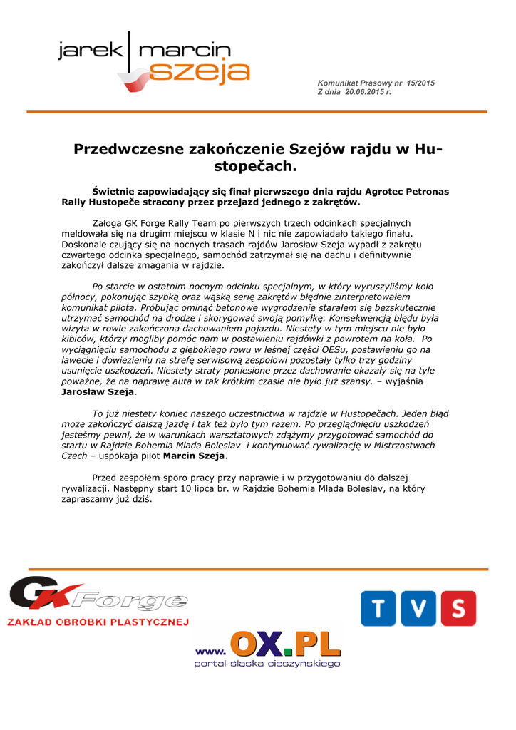 eed6 Komunikat Prasowy nr 15/2015 Z dnia 20.06.2015 r. Przedwczesne zakończenie Szejów rajdu w Hustopečach. Świetnie zapowiadający się finał pierwszego dnia rajdu Agrotec Petronas Rally Hustopeče stracony przez przejazd jednego z zakrętów. Załoga GK Forge Rally Team po pierwszych trzech odcinkach specjalnych meldowała się na drugim miejscu w klasie N i nic nie zapowiadało takiego finału. Doskonale czujący się na nocnych trasach rajdów Jarosław Szeja wypadł z zakrętu czwartego odcinka specjalnego, samochód zatrzymał się na dachu i definitywnie zakończył dalsze zmagania w rajdzie. Po starcie w ostatnim nocnym odcinku specjalnym, w który wyruszyliśmy koło północy, pokonując szybką oraz wąską serię zakrętów błędnie zinterpretowałem komunikat pilota. Próbując ominąć betonowe wygrodzenie starałem się bezskutecznie utrzymać samochód na drodze i skorygować swoją pomyłkę. Konsekwencją błędu była wizyta w rowie zakończona dachowaniem pojazdu. Niestety w tym miejscu nie było kibiców, którzy mogliby pomóc nam w postawieniu rajdówki z powrotem na koła. Po wyciągnięciu samochodu z głębokiego rowu w leśnej części OESu, postawieniu go na lawecie i dowiezieniu na strefę serwisową zespołowi pozostały tylko trzy godziny usunięcie uszkodzeń. Niestety straty poniesione przez dachowanie okazały się na tyle poważne, że na naprawę auta w tak krótkim czasie nie było już szansy. – wyjaśnia Jarosław Szeja. To już niestety koniec naszego uczestnictwa w rajdzie w Hustopečach. Jeden błąd może zakończyć dalszą jazdę i tak też było tym razem. Po przeglądnięciu uszkodzeń jesteśmy pewni, że w warunkach warsztatowych zdążymy przygotować samochód do startu w Rajdzie Bohemia Mlada Boleslav i kontynuować rywalizację w Mistrzostwach Czech – uspokaja pilot Marcin Szeja. Przed zespołem sporo pracy przy naprawie i w przygotowaniu do dalszej rywalizacji. Następny start 10 lipca br. w Rajdzie Bohemia Mlada Boleslav, na który zapraszamy już dziś.