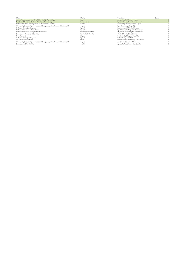 Szkoła Liceum Akademickie w Zespole Szkół im. Macieja Płażyńskiego Zespół Szkół Rolniczych Centrum Kształcenia Praktycznego Publiczne Katolickie Gimnazjum im. Św. Kazimierza w Gdańsku III Liceum Ogólnokształcące z Oddziałami Dwujęzycznymi im. Marynarki Wojennej RP Społeczne Gimnazjum Językowe Publiczne Gimnazjum w Pszczółkach Publiczne Gimnazjum w Zespole Szkół w Pączewie Gimnazjum w Kamienicy Królewskiej Technikum nr 1 Społeczne Gimnazjum Językowe Gimnazjum Nr 1 w Sztumie III Liceum Ogólnokształcące z Oddziałami Dwujęzycznymi im. Marynarki Wojennej RP Gimnazjum nr 19 w Gdańsku Miasto Puck Bolesławowo Gdańsk Gdynia Lębork Pszczółki Skórcz (Pączewo 123) Kamienica Królewska Słupsk Lębork Sztum Gdynia Gdańsk Uczestnicy Adrian Kościk,Aleksandra Budzisz Ryszard Narloch,Dominik Dzwonkowski Zuzanna Dąbrowska,Weronika Łąpieś Igor Kaczmarczyk,Kinga Zając Paulina Adamiak,Monika Niedziela Iga Mikołajczuk,Małgorzata Dombrowska Magdalena Żurek,Magdalena Laskowska Oliwia Zblewska,Oliwia Jelińska Dominika Gądek,Agata Hostyńska Izabela Kulig,Anna Wojtaś Kamila Kosmowska,Patrycja Rozwadowska Jakub Boros,Stanisław Wilemborek Agnieszka Pereć,Sandra Kaszubowska Ocena 25 22 21 20 20 19 18 18 18 17 16 16 15