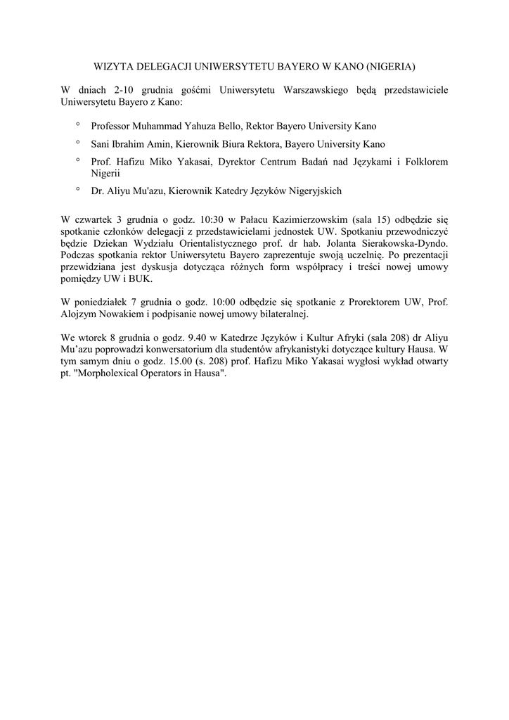 WIZYTA DELEGACJI UNIWERSYTETU BAYERO W KANO (NIGERIA) W dniach 2-10 grudnia gośćmi Uniwersytetu Warszawskiego będą przedstawiciele Uniwersytetu Bayero z Kano: Professor Muhammad Yahuza Bello, Rektor Bayero University Kano Sani Ibrahim Amin, Kierownik Biura Rektora, Bayero University Kano Prof. Hafizu Miko Yakasai, Dyrektor Centrum Badań nad Językami i Folklorem Nigerii Dr. Aliyu Mu'azu, Kierownik Katedry Języków Nigeryjskich W czwartek 3 grudnia o godz. 10:30 w Pałacu Kazimierzowskim (sala 15) odbędzie się spotkanie członków delegacji z przedstawicielami jednostek UW. Spotkaniu przewodniczyć będzie Dziekan Wydziału Orientalistycznego prof. dr hab. Jolanta Sierakowska-Dyndo. Podczas spotkania rektor Uniwersytetu Bayero zaprezentuje swoją uczelnię. Po prezentacji przewidziana jest dyskusja dotycząca różnych form współpracy i treści nowej umowy pomiędzy UW i BUK. W poniedziałek 7 grudnia o godz. 10:00 odbędzie się spotkanie z Prorektorem UW, Prof. Alojzym Nowakiem i podpisanie nowej umowy bilateralnej. We wtorek 8 grudnia o godz. 9.40 w Katedrze Języków i Kultur Afryki (sala 208) dr Aliyu Mu’azu poprowadzi konwersatorium dla studentów afrykanistyki dotyczące kultury Hausa. W tym samym dniu o godz. 15.00 (s. 208) prof. Hafizu Miko Yakasai wygłosi wykład otwarty pt. "Morpholexical Operators in Hausa".
