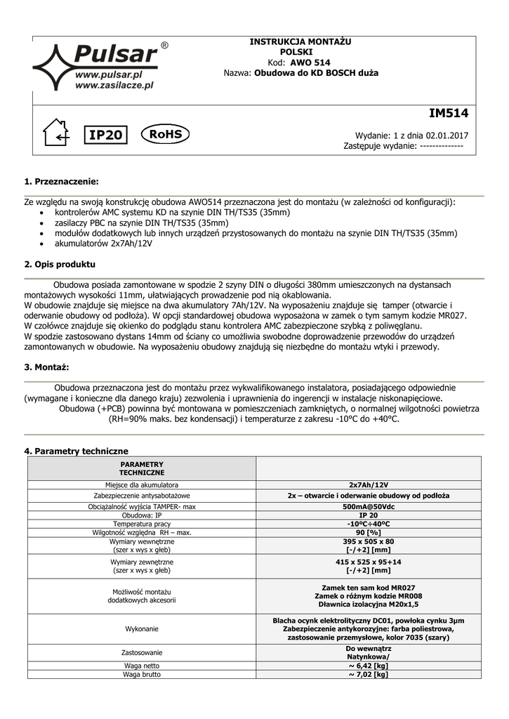 INSTRUKCJA MONTAŻU POLSKI Kod: AWO 514 Nazwa: Obudowa do KD BOSCH duża IM514 Wydanie: 1 z dnia 02.01.2017 Zastępuje wydanie: -------------- 1. Przeznaczenie: Ze względu na swoją konstrukcję obudowa AWO514 przeznaczona jest do montażu (w zależności od konfiguracji): kontrolerów AMC systemu KD na szynie DIN TH/TS35 (35mm) zasilaczy PBC na szynie DIN TH/TS35 (35mm) modułów dodatkowych lub innych urządzeń przystosowanych do montażu na szynie DIN TH/TS35 (35mm) akumulatorów 2x7Ah/12V 2. Opis produktu Obudowa posiada zamontowane w spodzie 2 szyny DIN o długości 380mm umieszczonych na dystansach montażowych wysokości 11mm, ułatwiających prowadzenie pod nią okablowania. W obudowie znajduje się miejsce na dwa akumulatory 7Ah/12V. Na wyposażeniu znajduje się tamper (otwarcie i oderwanie obudowy od podłoża). W opcji standardowej obudowa wyposażona w zamek o tym samym kodzie MR027. W czołówce znajduje się okienko do podglądu stanu kontrolera AMC zabezpieczone szybką z poliwęglanu. W spodzie zastosowano dystans 14mm od ściany co umożliwia swobodne doprowadzenie przewodów do urządzeń zamontowanych w obudowie. Na wyposażeniu obudowy znajdują się niezbędne do montażu wtyki i przewody. 3. Montaż: Obudowa przeznaczona jest do montażu przez wykwalifikowanego instalatora, posiadającego odpowiednie (wymagane i konieczne dla danego kraju) zezwolenia i uprawnienia do ingerencji w instalacje niskonapięciowe. Obudowa (+PCB) powinna być montowana w pomieszczeniach zamkniętych, o normalnej wilgotności powietrza (RH=90% maks. bez kondensacji) i temperaturze z zakresu -10°C do +40°C. 4. Parametry techniczne PARAMETRY TECHNICZNE Miejsce dla akumulatora 2x7Ah/12V Zabezpieczenie antysabotażowe 2x – otwarcie i oderwanie obudowy od podłoża Obciążalność wyjścia TAMPER- max Obudowa: IP Temperatura pracy Wilgotność względna RH – max. Wymiary wewnętrzne (szer x wys x głeb) 500mA@50Vdc IP 20 -10ºC÷40ºC 90 [%] 395 x 505 x 80 [-/+2] [mm] Wymiary zewnętrzne (szer x wys x głeb) 415 x 525 x 95+14 [-/+2] [mm] Możliwość montażu dodatkowych akcesorii Zamek ten sam kod MR027 Zamek o różnym kodzie MR008 Dławnica izolacyjna M20x1,5 Wykonanie Blacha ocynk elektrolityczny DC01, powłoka cynku 3µm Zabezpieczenie antykorozyjne: farba poliestrowa, zastosowanie przemysłowe, kolor 7035 (szary) Zastosowanie Waga netto Waga brutto Do wewnątrz Natynkowa/ ~ 6,42 [kg] ~ 7,02 [kg] Ogólne warunki gwarancji Ogólne warunki gwarancji dostępne na stronie www.pulsar.pl ZOBACZ PRODUCENT / PRODUCER Pulsar Siedlec 150, 32-744 Łapczyca, Poland Tel. (+ 48) 14-610-19-40, Fax. (+ 48) 14-610-19-50 e-mail: [email protected], [email protected] http:// www.pulsar.pl, www.zasilacze.pl 2