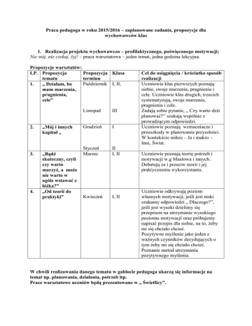 Praca pedagoga w roku 2015/2016 – zaplanowane zadania, propozycje dla wychowawców klas 1. Realizacja projektu wychowawczo – profilaktycznego, poświęconego motywacji; Nie stój, nie czekaj, żyj! – praca warsztatowa – jeden temat, jedna godzina lekcyjna. Propozycje warsztatów: LP. Propozycja Propozycja Klasa tematu terminu Październik I, II, 1. „ Działam, bo mam marzenia, pragnienia, cele” 2. 3. 4. „Mój i innych kapitał „ „Bądź skuteczny, czyli czy warto marzyć, a może nie warto w ogóle wstawać z łóżka?” „Od teorii do praktyki” Listopad III Grudzień I Styczeń Marzec II I, II Kwiecień I, II Cel do osiągnięcia / króciutko sposób realizacji Uczniowie klas pierwszych poznają siebie, swoje marzenia, pragnienia i cele. Uczniowie klas drugich, trzecich systematyzują, swoje marzenia, pragnienia i cele. Zadają sobie pytanie, „ Czy warto dziś planować?” szukają wspólnie z prowadzącym odpowiedzi. Uczniowie poznają wzmacniacze i przeszkody w planowaniu przyszłości. W kontekście mikro – Ja i makro – Inni, Świat. Uczniowie poznają teorię potrzeb i motywacji w.g Maslowa i innych . Debatują za i przeciw teorii i jej praktycznemu wykorzystaniu. Uczniowie odkrywają poziom własnych motywacji, jeśli jest niski szukamy odpowiedzi „ Dlaczego?”, jeśli jest wysoki dzielimy się przepisem na utrzymanie wysokiego poziomu motywacji oraz próbujemy napisać przepis dla siebie, na to, żeby mi się chciało chcieć. Pozytywne myślenie jako jeden z ważnych czynników decydujących o tym żeby mi się chciało chcieć. Poznanie metod utrzymania pozytywnego myślenia. W chwili realizowania danego tematu w gablocie pedagoga ukarzą się informacje na temat np. planowania, działania, potrzeb itp. Prace warsztatowe uczniów będą prezentowane w „ Świetlicy”. 2. Realizacja projektu z doradztwa edukacyjno – zawodowego; Uczeń w szkolnym systemie doradztwa edukacyjno – zawodowego. Projekt jest kontynuacją działań podjętych w roku ubiegłym. LP. Propozycja tematu 1. Karta kariery 2. Propozycja Klasa terminu Październik I Wiem, umiem, potrafię określić Luty siebie w różnych sferach życia (warsztat). I 3. Praca czyli co? Marzec I 4. Mój sposób na sukces Cz. I Mój sposób na sukces Cz. I Od decyzji do działania Listopad II Grudzień II Wrzesień IIILOP Od decyzji do działania Październik IIILOW 5. 6. 7. Cel do osiągnięcia / króciutko sposób realizacji Uczniowie wypełniają kartę kariery. W ten sposób poznają etap własnego rozwoju zawodowego. Pojęcie rozwoju zawodowego oraz refleksję na temat przyszłości, potrzeby planowania jej, przygotowania się do niej. My poznajemy kondycję rozwoju zawodowego ucznia. Karta kariery po klasie trzeciej podlega ewaluacji. Uczeń może prześledzić, jak zmieniły się jego zainteresowania czy wybory zawodowe. Uczniowie poznają różne sfery życia człowieka ( w kontekście ogólnorozwojowym i zawodowym). Wsparciem jest skrócony test Hollanda. Potrafią wyznaczyć swoją sferę. Uczniowie potrafią rozróżnić pracę, naukę, życie osobiste. Potrafią przełożyć posiadane wiadomości o sobie na temat projektowania siebie w pracy. Uczniowie potrafią określić czym jest sukces, wyznaczyć własny sukces, sposób dojścia do jego realizacji Uczniowie potrafią określić czym jest sukces, wyznaczyć własny sukces, sposób dojścia do jego realizacji Pomoc w wybraniu dalszej drogi edukacyjno – zawodowej. Kierunki i możliwości. Czyli poznanie dróg, którymi mogę pójść, chce pójść. Uświadomienie uczniowi, że za konkretnym wyborem stoi konkretne działonie. Motywacja do działania. Pomoc w wybraniu dalszej drogi edukacyjno – zawodowej. Kierunki i możliwości. Czyli poznanie dróg, którymi mogę pójść, chce pójść. Uświadomienie uczniowi, że za konkretnym wyborem stoi konkretne działonie. Motywacja do działania. 8. Kto za tobą stoi? Grudzień III 9. Co mi daje moc? Marzec III Uczeń staje przed trudnym wyborem edukacyjno – zawodowym. W tym wyborze nie jest sam. Poznaje swoich sprzymierzeńców. Moi sprzymierzeńcy w dojściu do planów. Uczeń potrafi ich znaleźć, wie gdzie i u kogo można pozyskać wsparcie realizując życiowe cele. Chce i potrafi skorzystać ze wsparcia. Jest otwarty, zmotywowany do dalszej edukacyjno – zawodowej wędrówki.