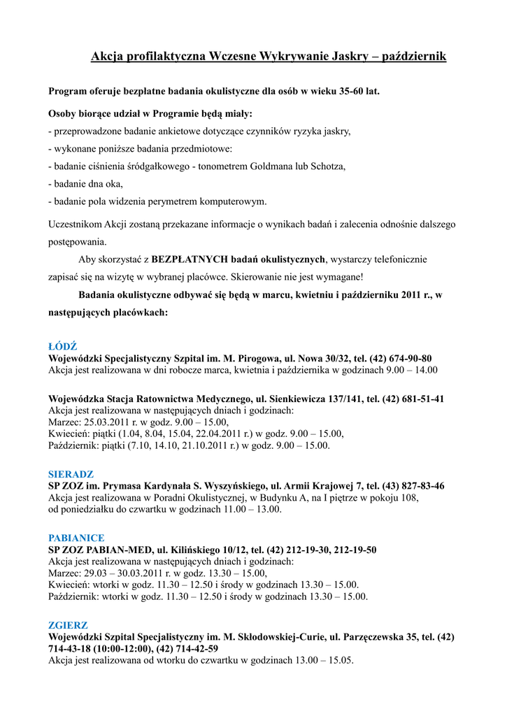 Akcja profilaktyczna Wczesne Wykrywanie Jaskry – październik Program oferuje bezpłatne badania okulistyczne dla osób w wieku 35-60 lat. Osoby biorące udział w Programie będą miały: - przeprowadzone badanie ankietowe dotyczące czynników ryzyka jaskry, - wykonane poniższe badania przedmiotowe: - badanie ciśnienia śródgałkowego - tonometrem Goldmana lub Schotza, - badanie dna oka, - badanie pola widzenia perymetrem komputerowym. Uczestnikom Akcji zostaną przekazane informacje o wynikach badań i zalecenia odnośnie dalszego postępowania. Aby skorzystać z BEZPŁATNYCH badań okulistycznych, wystarczy telefonicznie zapisać się na wizytę w wybranej placówce. Skierowanie nie jest wymagane! Badania okulistyczne odbywać się będą w marcu, kwietniu i październiku 2011 r., w następujących placówkach: ŁÓDŹ Wojewódzki Specjalistyczny Szpital im. M. Pirogowa, ul. Nowa 30/32, tel. (42) 674-90-80 Akcja jest realizowana w dni robocze marca, kwietnia i października w godzinach 9.00 – 14.00 Wojewódzka Stacja Ratownictwa Medycznego, ul. Sienkiewicza 137/141, tel. (42) 681-51-41 Akcja jest realizowana w następujących dniach i godzinach: Marzec: 25.03.2011 r. w godz. 9.00 – 15.00, Kwiecień: piątki (1.04, 8.04, 15.04, 22.04.2011 r.) w godz. 9.00 – 15.00, Październik: piątki (7.10, 14.10, 21.10.2011 r.) w godz. 9.00 – 15.00. SIERADZ SP ZOZ im. Prymasa Kardynała S. Wyszyńskiego, ul. Armii Krajowej 7, tel. (43) 827-83-46 Akcja jest realizowana w Poradni Okulistycznej, w Budynku A, na I piętrze w pokoju 108, od poniedziałku do czwartku w godzinach 11.00 – 13.00. PABIANICE SP ZOZ PABIAN-MED, ul. Kilińskiego 10/12, tel. (42) 212-19-30, 212-19-50 Akcja jest realizowana w następujących dniach i godzinach: Marzec: 29.03 – 30.03.2011 r. w godz. 13.30 – 15.00, Kwiecień: wtorki w godz. 11.30 – 12.50 i środy w godzinach 13.30 – 15.00. Październik: wtorki w godz. 11.30 – 12.50 i środy w godzinach 13.30 – 15.00. ZGIERZ Wojewódzki Szpital Specjalistyczny im. M. Skłodowskiej-Curie, ul. Parzęczewska 35, tel. (42) 714-43-18 (10:00-12:00), (42) 714-42-59 Akcja jest realizowana od wtorku do czwartku w godzinach 13.00 – 15.05. PIOTRKÓW TRYBUNALSKI Samodzielny Szpital Wojewódzki im. Mikołaja Kopernika, ul. Wolborska 76/78, tel. (44) 64804-82, 648-03-66 Akcja jest realizowana w następujących dniach i godzinach: Kwiecień: 10.04.2011 r. (niedziela) w godz. 8.00 – 16.00, Październik: 16.10.2011 r. (niedziela) w godz. 10.00 – 18.00. SKIERNIEWICE Wojewódzki Szpital Zespolony w Skierniewicach, ul. Sobieskiego 4, tel. (46) 834-07-63 (11:0015:00) Akcja jest realizowana w następujących dniach i godzinach: Marzec: 21.03 – 25.03.2011 r., 28.03 – 31.03.2011 r. w godz. 11.00 – 14.00, Kwiecień: 1.04.2011 r., 4.04-7.04.2011 r., 13.04 – 15.04.2011 r., 18.04 – 22.04.2011 r., 27.04 oraz 28.04.2011 r. w godz. 11.00 – 14.00. Październik: 3.10; 6.10; 10.10; 13.10; 17.10; 20.10.2011 r. w godz. 11.00 – 14.00. Termin wizyty będzie uzależniony od kolejności zapisów.