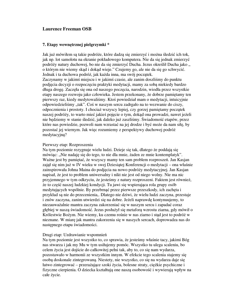Laurence Freeman OSB 7. Etapy wewnętrznej pielgrzymki * Jak już mówiłem są takie podróże, które dadzą się zmierzyć i można śledzić ich tok, jak np. lot samolotu na ekranie pokładowego komputera. Nie da się jednak zmierzyć podróży natury duchowej, bo nie da się zmierzyć Ducha. Jezus określił Ducha jako „ o którym nie wiemy skąd i dokąd wieje.” Czujemy go, ale nie da się go schwycić. Jednak i ta duchowa podróż, jak każda inna, ma swój początek. Zaczynamy w jakimś miejscu i w jakimś czasie, ale zanim doszliśmy do punktu podjęcia decyzji o rozpoczęciu praktyki medytacji, mamy za sobą niekiedy bardzo długa drogę. Zaczęła się ona od naszego poczęcia, narodzin, wiodła przez wszystkie etapy naszego rozwoju jako człowieka. Jestem przekonany, że dobrze pamiętamy ten pierwszy raz, kiedy medytowaliśmy. Ktoś powiedział mam o medytacji, intuicyjnie odpowiedzieliśmy „tak”. Coś w naszym sercu zadrgało na to wezwanie do ciszy, odpocznienia i prostoty. I chociaż wszyscy lepiej, czy gorzej pamiętamy początek naszej podróży, to warto mieć jakieś pojęcie o tym, dokąd ona prowadzi, nawet jeżeli nie będziemy w stanie śledzić, jak daleko już zaszliśmy. Świadomość etapów, przez które nas powiedzie, pozwoli nam wzrastać na jej drodze i być może da nam siłę, by pozostać jej wiernym. Jak więc rozumiemy z perspektywy duchowej podróż medytacyjną? Pierwszy etap: Rozproszenia Na tym poziomie rezygnuje wielu ludzi. Dzieje się tak, dlatego że poddają się mówiąc: „Nie nadaję się do tego, to nie dla mnie, żaden ze mnie kontemplatyk”. Ważne jest by pamiętać, że wszyscy mamy ten sam problem rozproszeń. Jan Kasjan zajął się nim już w IV wieku w swej Dziesiątej Konferencji o medytacji – ona właśnie zainspirowała Johna Maina do podjęcia na nowo podróży medytacyjnej. Jan Kasjan napisał, że jest to problem uniwersalny i nikt nie jest od niego wolny. Nie ma nic przyjemnego w tym odkryciu, że jesteśmy z natury rozproszeni. Faktem jest również, że to część naszej ludzkiej kondycji. Tu jawi się wspierająca rola grupy osób medytujących wspólnie. By przebrnąć przez pierwsze przeszkody, ich zachęta i przykład są nie do przecenienia,. Dlatego nie dziwi, że wielu ludzi zaczyna, przestaje i znów zaczyna, zanim utwierdzi się na dobre. Jeżeli naprawdę kontynuujemy, to niezauważalnie mantra zaczyna zakorzeniać się w naszym sercu i zapadać coraz głębiej w naszą świadomość. Jezus posłużył się metaforą wzrostu ziarna, gdy mówił o Królestwie Bożym. Nie wiemy, ku czemu rośnie w nas ziarno i stąd jest to podróż w nieznane. W miarę jak mantra zakorzenia się w naszych sercach, doprowadza nas do następnego etapu świadomości. Drugi etap: Uzdrawianie wspomnień Na tym poziomie jest wszystko to, co sprawia, że jesteśmy właśnie tacy, jakimi Bóg nas stwarza i jak my Mu w tym usiłujemy pomóc. Wszystko tu ulega scaleniu, bo celem życia jest dojście do całkowitej pełni tak, aby to, co się nam wydarza, pozostawało w harmonii ze wszystkim innym. W efekcie tego scalenia stajemy się osobą doskonale zintegrowaną. Niestety, nie wszystko, co się na wydarza daje się łatwo zintegrować – przerażające szoki życia, bolesne straty, ciężkie psychiczne i fizyczne cierpienia. O dziecka kształtują one naszą osobowość i wywierają wpływ na całe życie. Na niektóre z głębokich doświadczeń, które nas determinują, trzeba całego życia, by je zasymilować. Znajdujemy się w środku życia, życia podświadomości i wiele się tu dzieje. Być może nie wiemy, skąd nas nachodzą uczucia smutku, złości, żałoby i być może nie musimy tego wiedzieć. A może musimy i wówczas się tego dowiemy. Do sfery świadomości przedostaną się jakieś wspomnienia i niespodzianie opanują nas myśli dotyczące jakiegoś związku z przeszłości, czy fazy w naszym życiu. Zaczyna się proces leczenia emocji z tym związanych. Myślisz o tym w ciągu dnia nie wiedząc, dlaczego właściwie tak się dzieje. A może są to pytania, które musisz sobie na nowo postawić. Lub też stawić czoła czemuś, czego usilnie unikałeś. Powoli i stopniowo następuje integracja tych wspomnień. I na tym poziomie istnieje niebezpieczeństwo rezygnacji z medytacji. Zaczynasz zbyt mocno koncentrować się na samym sobie, bo odbywa się coś w rodzaju opery mydlanej. Najlepsza z możliwych, bo sam ją napisałeś, sam ją odgrywasz i jesteś jej całą widownią. Zajmuj się nią na tyle, na ile to konieczne, ale nie ingeruj zbyt mocno. Przypomnij sobie nauczanie Jezusa o ziarnie, które rośnie. Zostaw je tam, nie potrzebujesz co chwilę dokopywać się do niego, by sprawdzić jak rośnie. Zaufaj całej podróży, jako doświadczeniu wiary. W tej sytuacji nieocenioną rolę może spełnić wspierająca cię wspólnota i duchowa przyjaźń z jej członkami. Pamiętaj, że choć medytacja jest podróżą, którą odbywa się w pojedynkę, lecz nie jest się w niej samotnym. Podróż ta prowadzi nas do wspólnoty i doświadczenia duchowej przyjaźni, innej więzi i przyjaźni niż wszystkie te, które znamy. Jest to prawdziwy i cenny dar podczas naszej duchowej wędrówki. I tak ruszamy dalej. Medytujemy i uczymy się coraz bardziej i bardziej wsłuchiwać w mantrę, powtarzając ją. Na pierwszym poziomie wypowiadaliśmy ją w obecności wielu rozproszeń i musiałeś podejmować ciągły trud, by do niej powracać. Na tym poziomie zapadła się ona nieco głębiej i wydaję się brzmieć bardziej w twoim sercu. Coraz bardziej też się w nią wsłuchujesz. John Main uważał, że kiedy nauczymy się wsłuchiwać w mantrę, dopiero wówczas nasza podróż rozpoczyna się na serio. Dokąd więc idziemy dalej? Etap trzeci: Smutek egzystencji Kolejny poziom świadomości jest, jak zderzenie czołowe z murem z cegieł. Autor Obłoku niewiedzy pisze o niej, jako o „nagiej świadomości samego sie