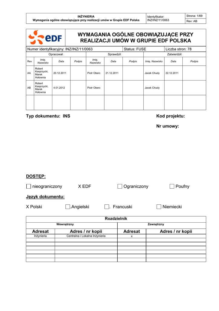 INŻYNIERIA Wymagania ogólne obowiązujące przy realizacji umów w Grupie EDF Polska Strona: 1/69 Identyfikator: INZ/INZ/11/0063 Rev: AB WYMAGANIA OGÓLNE OBOWIĄZUJĄCE PRZY REALIZACJI UMÓW W GRUPIE EDF POLSKA Numer identyfikacyjny: INZ/INZ/11/0063 Status: FUSE Opracował: Rev Imię, Nazwisko Liczba stron: 78 Sprawdził: Data Imię, Nazwisko Podpis AA Robert Kasprzycki, Marek Hołownia 20.12.2011 Piotr Oberc AB Robert Kasprzycki, Marek Hołownia 4.01.2012 Piotr Oberc Zatwierdził: Data Podpis 21.12.2011 Imię, Nazwisko Data Jacek Chudy Podpis 22.12.2011 Jacek Chudy Typ dokumentu: INS Kod projektu: Nr umowy: DOSTĘP: nieograniczony X EDF Ograniczony Poufny Język dokumentu: X Polski .Angielski . Francuski Niemiecki Rozdzielnik Wewnętrzny Zewnętrzny Adresat Adres / nr kopii Adresat Inżynieria Centralna i Lokalna Inżynieria x Adres / nr kopii INŻYNIERIA Wymagania ogólne obowiązujące przy realizacji umów w Grupie EDF Polska Identyfikator: INZ/INZ/11/0063 I. DOSTĘP DO DOKUMENTU Miejsce przechowywania oryginału: Centrum Usług Wspólnych EDF Polska / Inżynieria / Ścieżka dostępu do wersji elektronicznej: II. REJESTR ZMIAN Numer zmienionej strony Revision Data zmiany AA 20/12/2011 _________ Utworzenie AB 04/01/2012 10 Usunięto w całości treść punktu 2.4 o następującej treści: „Dopuszczać do Opis zmian pracy przy urządzeniach elektroenergetycznych tylko i wyłącznie pracowników, posiadających wymagane Zaświadczenia kwalifikacyjne typu E, D. Dotyczy to zarówno pracowników Wykonawcy jak i ewentualnych pracowników Podwykonawcy za, których odpowiada Wykonawca. Strona: 2/69 Rev: AB INŻYNIERIA Wymagania ogólne obowiązujące przy realizacji umów w Grupie EDF Polska Identyfikator: INZ/INZ/11/0063 Strona: 3/69 Rev: AB Niniejszy dokument opracowany został jako zbiór wymagań obowiązujących przy realizacji umów w Grupie EDF Polska. Zawiera: 1. wymagania z obszaru BHP opracowane przez Sieć BHP do stosowania przy realizacji prac prowadzonych na terenie i na rzecz Grupy EDF Polska, 2. zalecenia poawaryjne sporządzone w związku z wystąpieniem zdarzeń awaryjnych w Spółkach Grupy EDF Polska, 3. zapisy zawiązane z zasadami zarządzania dokumentacją, które określają ogólne i szczegółowe wymagania dotyczące dokumentacji tworzonej na potrzeby Grupy EDF Polska, 4. NIE DOTYCZY 5. wymagania techniczne wynikające ze specyfiki branż. Dokument Został podzielony na pięć działów. W pierwszym dziale zawarto dokumenty związane z wymaganiami BHP. W dziale drugim zawarto zalecenia poawaryjne związane ze zdarzeniami awaryjnymi w Spółkach Grupy EDF Polska. W dziale trzecim przedstawiono wymagania stawiane dokumentacji tworzonej na rzecz Grupy EDF Polska. Dział czwarty- nie dotyczy. Dział piąty określa specyficzne branżowe wymagania techniczne. Poszczególne działy oznaczono kolejnymi rzymskimi numerami INŻYNIERIA Wymagania ogólne obowiązujące przy realizacji umów w Grupie EDF Polska Identyfikator: INZ/INZ/11/0063 DZIAŁ I WYMAGANIA BHP DLA WYKONAWCÓW Strona: 4/69 Rev: AB INŻYNIERIA Wymagania ogólne obowiązujące przy realizacji umów w Grupie EDF Polska Identyfikator: INZ/INZ/11/0063 Strona: 5/69 Rev: AB 1. WYMAGANIA BHP DLA WYKONAWCÓW SPIS TREŚCI 1. CEL ............................................................................................................................ 6 2. ZAKRES ..................................................................................................................... 6 3. TREŚĆ ZAŁĄCZNIKA................................................................................................ 6 3.1. Fundamentalne zasady BHP ........................................................................... 6 3.2. Ogólne zasady BHP ......................................................................................... 6 3.3. Specyficzne wymagania BHP w poszczególnych spółkach.......................... 7 3.4. Wymagania dotyczące realizacji prac............................................................78 3.5. Specyficzne wymagania BHP dotyczące wybranych prac ............................ 8 PRACE NA WYSOKOŚCI .......................................................................................... 8 3.6. Inne wymagania ............................................................................................... 8 3.7. Załączniki .......................................................................................................... 8 INŻYNIERIA Wymagania ogólne obowiązujące przy realizacji umów w Grupie EDF Polska 1. Identyfikator: INZ/INZ/11/0063 Strona: 6/69 Rev: AB CEL Celem niniejszego dokumentu jest określenie wymagań w obszarze BHP dla Wykonawców pracujących na rzecz spółek Grupy EDF w Polsce. 2. ZAKRES Ten dokument ma zastosowanie dla wszystkich projektów realizowanych na rzecz spółek Grupy EDF w Polsce. 3. TREŚĆ ZAŁĄCZNIKA 3.1. Fundamentalne zasady BHP Sporządzający specyfikację techniczną musi załączyć niniejsze fundamentalne zasady BHP opracowane przez Sieć BHP EDF Polska, do każdej specyfikacji technicznej: a. Stosuj zawsze środki ochrony indywidualnej zgodnie z obowiązującymi zasadami, poleceniem na pracę oraz oznaczeniami Upewnij się, że masz właściwe przystąpieniem do wykonywania pracy dokumenty i uprawnienia przed Nie pal poza miejscami do tego wyznaczonymi Nie możesz być pod wpływem alkoholu lub środków odurzających na terenie spółki Nie usuwaj samowolnie jakichkolwiek zabezpieczeń i środków ochrony zbiorowej umieszczonych na terenie spółki Nie blokuj dostępu do sprzętu ppoż. 3.2. Ogólne zasady BHP Sporządzający specyfikację techniczną musi załączyć niniejsze ogólne zasady BHP opracowane przez Sieć BHP EDF Polska, do każdej specyfikacji technicznej: a) zawsze reaguj, gdy ktoś łamie przepisy lub pracuje w niebezpiecznych warunkach, INŻYNIERIA Wymagania ogólne obowiązujące przy realizacji umów w Grupie EDF Polska Identy