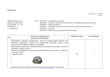 Pakiet Nr 12 Załącznik Nr 1 do SIWZ część 12 Szkoła Podstawowa Nr 2 Dyrektor: Dorota Piękoś tel. (0-14) 681 – 34 – 40 39-200 Dębica ul. Ogrodowa 22 Lp. 1 PCV: 29711210 – 1 Rozdrabniacze żywności 28512000 – 4 Metalowe wyroby stołowe, kuchenne lub artykuły gospodarstwa domowego 28520000 – 3 Wyroby metalowe 25243120 – 3 Pojemniki do przechowywania żywności w gospodarstwie domowym 26212120 – 4 Naczynia 29710000 – 9 Elektryczny sprzęt gospodarstwa domowego Nazwa i szczegółowy opis przedmiotu zamówienia Rozdrabniacz odpadów organicznych służy do mielenia takich odpadów jak: obierzyny ziemniaków, kawałki ryb, skorupki jaj, wyciśnięte cytryny i inne owoce oraz inne miękkie odpady po posiłkach. Rozdrabniacz montowany bezpośrednio pod otworem zlewu (między zlewem a syfonem) o średnicy 90 mm. Obudowa rozdrabniacza wykonana ze stali nierdzewnej „chromowo – niklowej” - moc min. 1 KM - zasilanie 230 V preferowany model np. katalog internetowy www.robin.com.pl lub równoważny Jednostka miary Ilość jednostek szt 1 Lp. Nazwa i szczegółowy opis przedmiotu zamówienia Jednostka miary Ilość jednostek 2 Syfon zlewozmywakowy do montażu rozdrabniacza wymienionego w pozycji nr 1 preferowany model np. katalog internetowy www.robin.com.pl lub równoważny szt 1 3 Stół ze zlewem i otworem pod rozdrabniacz odpadów (specjalny zlew z otworem o średnicy 90 mm do podłączenia rozdrabniacza odpadów) Wymiary: szerokość 600 mm x głębokość 600 mm x wysokość 850 mm preferowane wzornictwo np. katalog STALGAST 1/2007 (nr kat. 959061) lub równoważny szt 1 szt 1 szt 2 szt 4 Pirometr – 30 0 – 250 0 C – bezkontaktowy termometr na podczerwień pozwala na łatwy i szybki pomiar temperatury żywności. 4 preferowane wzornictwo równoważny 5 6 np. katalog internetowy – www.robin.com.pl lub Termometr lodówkowy wykonany ze stali nierdzewnej. Posiada uchwyt umożliwiający zawieszenie. Zakres temperaturowy termometru od – 40 0 C do + 40 0 C. Wymiary około: wysokość 6 - 7 cm, szerokość 5 - 6 cm preferowane wzornictwo np. katalog STALGAST 1/2007 (nr kat. 620110) lub równoważny Stół do pracy ze stali nierdzewnej z szafką – drzwi przesuwane; rant tylni Lp. Nazwa i szczegółowy opis przedmiotu zamówienia Jednostka miary Ilość jednostek szt 1 wymiary stołu: długość 80 cm, szerokość 70 cm, wysokość 85 cm stół przeznaczony do eksploatacji w trakcie przygotowywania i obróbki artykułów spożywczych; blaty robocze wykonane ze stali nierdzewnej o grubości 0,8 – 1,0 mm; wygłuszone płytą wiórową o grubości 18 mm. preferowane wzornictwo np. katalog internetowy www.robin.com.pl lub równoważny 7 Zmywarka do naczyń - pojemność: 12 zestawów - programy - Zmywanie wstępne - Program szybki 40° - Bio 50° - Antybakteria - Program nocny - Turbo Clean - (system samoczyszczących filtrów) - zabezpieczenie przed zalaniem - regulowany górny kosz na naczynia - klasa energetyczna: min A - klasa skuteczności zmywania: A - klasa skuteczności suszenia: A - wymiary produktu [W x Sz x Gł] około: 80 - 85 x 60 x 60 cm Lp. Nazwa i szczegółowy opis przedmiotu zamówienia Jednostka miary Ilość jednostek - kolor do uzgodnienia z zamawiającym preferowane wzornictwo np. Whirpool ADP 6946 IX lub równoważny 8 Wiadro ze stali nierdzewnej bez pierścienia – 7 L preferowane wzornictwo np. katalog STALGAST 1/2007 – (nr kat. 091060) lub równoważny szt 3 9 Wiadro ze stali nierdzewnej z pierścieniem - 10 L preferowane wzornictwo np. katalog STALGAST 1/2007– (nr kat. 092100) lub równoważny szt 4 Pokrywa ze stali nierdzewnej do wiadra - 10 L 10 preferowane wzornictwo np. katalog STALGAST 1/2007 – (nr kat. 093100) lub równoważny szt 3 Porcjoner do ryżu i puree – wykonany ze stali nierdzewnej - gramatura ok. 70 g; długość około 25 - 30 cm 11 preferowane wzornictwo np. katalog STALGAST 1/2007 – (nr kat. 531120) lub równoważny szt 3 Łopatka (długa) pełna do przewracania, stal chromowo – molibdenowa z rękojeścią wykonaną z tworzywa miękkiego w kolorze zielonym 12 - długość około 26 cm preferowane wzornictwo np. katalog STALGAST 1/2007 – (nr kat. 270260) lub równoważny szt 2 Łopatka do smażenia stal chromowo – molibdenowa z rękojeścią wykonaną z tworzywa miękkiego w kolorze zielonym 13 - długość około 17 cm preferowane wzornictwo np. katalog STALGAST 1/2007 – (nr kat. 264170) lub równoważny szt 2 Pojemnik gastronomiczny do bemara GN 1/1 o podwyższonej wytrzymałości z uchwytami szt 1 14 Jednostka miary Ilość jednostek Pojemnik gastronomiczny do bemara GN 1/2 o podwyższonej wytrzymałości z uchwytami 15 Wymiary około: (320 x 260); 9 L preferowane wzornictwo np. katalog STALGAST wyd. XVIII; X 2006 r. (nr kat.132151) lub równoważny szt 2 Pokrywa z uszczelką silikonową GN 1/1 do poz. Nr 14 16 preferowane wzornictwo np. katalog STALGAST wyd. XVIII; X 2006 r. (nr kat.131001) lub równoważny szt 1 Pokrywa z uszczelką silikonową GN 1/2 do poz. Nr 15 17 preferowane wzornictwo np. katalog STALGAST wyd. XVIII; X 2006 r. (nr kat.132001) lub równoważny szt 2 Bateria ze spryskiwaczem - bateria zlewozmywakowa stojąca, jednootworowa ze spryskiwaczem z wylewką - głowice baterii ceramiczne, ćwierć obrotowe 18 - możliwość regulacji dystansu baterii od ściany i wysokość położenia zaczepu spryskiwacza - łokciowe głowice baterii zgodne z normami higieny HACCP preferowany model np. katalog STALGAST 1/2007 – (nr kat. 651521) lub równoważny szt 1 Miska ze stali nierdzewnej Wymiary około: Ø 36; 19 preferowane wzornictwo np. katalog STALGAST 1/2007– (nr kat. 082360) lub równoważny szt 3 Lp. Nazwa i szczegółowy opis przedmiotu zamówienia Wymiary około: (325 x 530); 20 L preferowane wzornictwo np. katalog STALGAST wyd. XVIII; X 2006 r. (nr kat. 131151) lub równoważny Jednostka miary Ilość jednostek Miska ze stali nierdzewnej Wymiary około: Ø 50; 20 preferowane wzornic