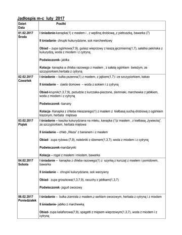 Jadłospis m-c luty 2017 Dzień Data 01.02.2017 Środa Posiłki I śniadanie-kanapka(1) z masłem i , z wędliną drobiową ,z pietruszką, bawarka (7) II śniadanie- chrupki kukurydziane, sok marchewkowy Obiad – zupa ogórkowa(7,9), gulasz wieprzowy z kaszą jęczmienną(1,7), sałatka pekińska z kukurydzą, woda z miodem i z cytryną Podwieczorek- jabłka Kolacja- kanapka a chleba razowego z masłem , z sałatą ogórkiem świeżym, ze szczypiorkiem,herbata z cytryną 02.02.2017 Czwartek I śniadanie – bułka pszenna(1) z masłem, z jajkiem(1,7) i ze szczypiorkiem, kakao II śniadanie – ciasto domowe – woda z sokiem i z cytryną Obiad-krupnik(1,3,7,9), podudzie z kurczaka-pieczone, ziemniaki, marchewka z jabłkiem, woda z miodem i z cytryną Podwieczorek -banany Kolacja- Kanapka z chleba mieszanego(1) z masłem z kiełbasą suchą-drobiową z ogórkiem kiszonym, herbata miętowa 03.02.2017 Piątek I śniadanie – kaszka kukurydziana na mleku, kanapka (1)z masłem , z kiełbasą „żywiecką”, ze szczypiorkiem, herbata miętowa II śniadanie – chleb „Waza” z bananem i z masłem Obiad- zupa ryżowa (7,9), naleśniki z dżemem(1,3,7), woda z miodem i z cytryną Podwieczorek-mandarynki Kolacja – rogal z masłem i miodem, bawarka 04.02.2017 Sobota I śniadanie – kanapka z chleba razowego(1) z szynką z kurcząt z masłem i pomidorem, bawarka II śniadanie – chrupki kukurydziane, sok warzywny Obiad- zupa groszkowa(1,3,7,9), racuchy z jabłkami(1,3,7) Podwieczorek- jogurt owocowy 06.02.2017 I śniadanie – bułka ziarnista z masłem,z serkiem owocowym, herbata z cytryną i z miodem Poniedziałek II śniadanie- jabłko z marchewką Obiad- zupa kalafiorowa(7,9), spagetti z mięsem wieprzowym(1,3,7), woda z miodem i z cytryną Podwieczorek-mandarynki Kolacja – chleb razowy z masłem z szynką z indyka, z sałatą, herbata owocowa 07.02.2017 Wtorek I śniadanie – kanapka z chleba razowego(1) z masłem z pasztetem pieczonym,z pomidorem, pietruszką zieloną, herbata owocowa II śniadanie- ciasto drożdżowe, mleko Obiad- zupa pomidorowa z makaronem(1,3,7,9), kotlet schabowy, ziemniakami, sałatka „Colesław”, woda z miodem i z cytryną Podwieczorek-jabłka Kolacja- kanapka z chleba mieszanego(1) z pastą z makreli, herbata z owoców leśnych 08.02.2017 Środa I śniadanie – Parówka z indyka, chleb (1)razowy z masłem, bawarka II śniadanie –kisiel cytrynowy z jabłkiem tartym Obiad- zupa groszkowa(7,9), kluski śląskie w sosie pieczeniowym(1,3,7,9), marchew z jabłkiem, woda z miodem i z cytryną Podwieczorek- banany Kolacja – chałka z masłem z dżemem wiśniowym, herbata miętowa 09.02.2017 Czwartek I śniadanie – zacierka na mleku, kanapka z chleba mieszanego (1)z serkiem naturalnym z bazylią herbata owocowa II śniadanie- wafle suche, sok warzywny Obiad – zupa jarzynowa(7,9), kotlet mielony(1,3), ryż, buraczki czerwone, woda z miodem i z cytryną Podwieczorek- jogurt owocowy Kolacja-kanapka z pieczywa razowego,(1) z Delmą , z makrelą w pomidorach, ze szczypiorkiem, herbata miętowa 10.02.2017 Piątek I śniadanie – kasza kukurydziana na mleku(7), kanapka (1)z Delmą z polędwicą sopocką, ogórkiem świeżym , herbata miętowa II śniadanie – marchewka tarta, chrupki kukurydziane Obiad-kapuśniak(9), ryba panierowana,ziemniaki, kapusta kiszona, woda z miodem i z cytryną Podwieczorek- jabłka Kolacja- kanapka a chleba razowego z masłem , z miodem, herbata z cytryną 11.02.2017 Sobota I śniadanie- bułka pszenna (1)z masłem z pastą z suszonych pomidorów, z bazylią, bawarka II śniadanie- sok owocowy , jabłka Obiad- zupa pieczarkowa z makaronem(1,3,7,9), kotlet drobiowy z ziemniakami(1,3), kapusta czerwona, woda z miodem i z cytryną Podwieczorek-pomarańcze 13.02.2017 I śniadanie – kanapka z chleba mieszanego (1)z masłem, z rzodkiewką i ze szczypiorkiem, Poniedziałek kakao II śniadanie –mandarynki Obiad- rosół z makaronem(1,3,7,9), łazanki z mięsem(1,3), woda z miodem i z cytryną Podwieczorek-banany Kolacja- bułka razowa(1) z masłem z kiełbasą wieprzową z pietruszką zieloną, herbata z cytryną i z miodem 14.02.2017 Wtorek I śniadanie – kasza manna (7), kanapka (1)z Delmą, z serem żółtym, sałatą masłową II śniadanie – gofry, herbata owocowa Obiad- zupa kalafiorowa(7,9), kotlet pożarski , kasza gryczana(1,3), kapusta czerwona, woda z miodem i z cytryną Podwieczorek-jabłka Kolacja – kanapka z szynką prasowaną, z ogórkiem kiszonym, herbata z miodem 15.02.2017 Środa I śniadanie- bułka pszenna(1) z masłem i z polędwicą z indyka, herbata owocowa II śniadanie – ciasto jogurtowe, woda z miodem Obiad- barszcz biały(3,7,9), pierogi ruskie(1,3,7), woda z miodem i z cytryną Podwieczorek- mandarynki Kolacja- kanapka z pastą rybną, ze szczypiorkiem, herbata z cytryną 16.02.2017 Czwartek I śniadanie – kanapka(1) z masłem z pomidorem, rzodkiewką, sałatą kawa Inka II śniadanie – galaretka owocowa Obiad- zupa groszkowa(7,9), gołąbki w formie kotlecików,marchew z jabłkiem, woda z miodem i z cytryną Podwieczorek- banany Kolacja- kanapka z chleba mieszanego(1) z masłem i z serem śmietankowym, z papryką herbata owocowa 17.01.2017 Piątek I śniadanie – bułka pszenna(1) z masłem, z szynką drobiową i ze szczypiorkiem, bawarka II śniadanie – kisiel malinowy, herbatniki Obiad- zupa ogórkowa(7,9), racuchy z jabłkami(1,3,7), woda z miodem i z cytryną Podwieczorek –jogurt owocowy Kolacja- kanapka z chleba razowego(1) z masłem, z jajkiem gotowanym, ze szczypiorkiem, herbata z cytryną i z miodem 18.02.2017 Sobota I śniadanie – bułka ziemniaczana z masłem , jajecznica, ze szczypiorkiem, bawarka II śniadanie –biszkopty, woda niegazowana Obiad- rosół z makaronem(1,3,9), kotlet schabowy z ziemniakami(1,3,7), woda z miodem i z cytryną Podwieczorek- pomarańcze 20.02.2017 I śniadanie-chleb mieszany(1) z masłem, z pasztetem drobiowym-pieczonym, ze Poniedziałek szczypi