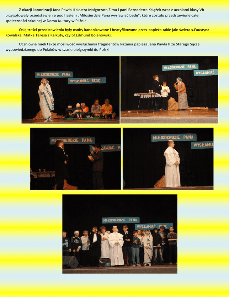 Z okazji kanonizacji Jana Pawła II siostra Małgorzata Zima i pani Bernadetta Książek wraz z uczniami klasy Vb przygotowały przedstawienie pod hasłem „Miłosierdzie Pana wysławiać będę”, które zostało przedstawione całej społeczności szkolnej w Domu Kultury w Pilźnie. Osią treści przedstawienia były osoby kanonizowane i beatyfikowane przez papieża takie jak: świeta s.Faustyna Kowalska, Matka Teresa z Kalkuty, czy bł.Edmund Bojanowski. Uczniowie mieli także możliwość wysłuchania fragmentów kazania papieża Jana Pawła II ze Starego Sącza wypowiedzianego do Polaków w czasie pielgrzymki do Polski
