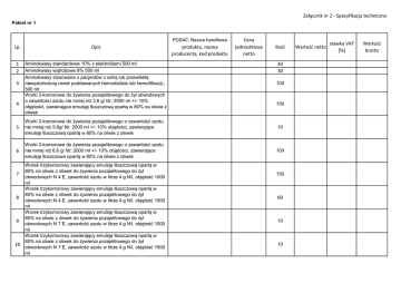 Załącznik nr 2 - Specyfikacja techniczna Pakiet nr 1 Lp. Opis 1 2 Aminokwasy standardowe 10% z elektrolitami 500 ml Aminokwasy wątrobowe 8% 500 ml Aminokwasy stosowane u pacjentów z ostrą lub przewlekłą niewydolnością nerek poddawanych hemodializie lub hemofiltracji.; 500 ml Worki 3-komorowe do żywienia pozajelitowego do żył obwodowych o zawartości azotu nie mniej niż 3,6 g/ litr; 2000 ml +/- 10% objętości, zawierające emulsję tłuszczową opartą w 80% na oliwie z oliwek 3 4 PODAĆ: Nazwa handlowa produktu, nazwa producenta, kod produktu Cena jednostkowa netto Ilość 40 30 100 150 5 Worki 3-komorowe do żywienia pozajelitowego o zawartości azotu nie mniej niż 5,6g/ litr; 2000 ml +/- 10% objętości, zawierające emulsję tłuszczową opartą w 80% na oliwie z oliwek 10 6 Worki 3-komorowe do żywienia pozajelitowego o zawartości azotu nie mniej niż 6,6 g/ litr; 2000 ml +/- 10% objętości, zawierające emulsję tłuszczowa opartą w 80% na oliwie z oliwek 100 Worek trzykomorowy zawierający emulsję tłuszczową opartą w 80% na oliwie z oliwek do żywienia pozajelitowego do żył 7 obwodowych N 4 E, zawartość azotu w litrze 4 g N/l, objętość 1000 ml Worek trzykomorowy zawierający emulsję tłuszczową opartą w 80% na oliwie z oliwek do żywienia pozajelitowego do żył 8 obwodowych N 4 E, zawartość azotu w litrze 4 g N/l, objętość 1500 ml Worek trzykomorowy zawierający emulsję tłuszczową opartą w 80% na oliwie z oliwek do żywienia pozajelitowego do żył 9 obwodowych N 7 E, zawartość azotu w litrze 4 g N/l, objętość 1000 ml Worek trzykomorowy zawierający emulsję tłuszczową opartą w 80% na oliwie z oliwek do żywienia pozajelitowego do żył 10 obwodowych N 7 E, zawartość azotu w litrze 4 g N/l, objętość 1500 ml 150 60 10 10 Wartość netto stawka VAT [%] Wartość brutto Worek trzykomorowy zawierający emulsję tłuszczową opartą w 80% na oliwie z oliwek do żywienia pozajelitowego do żył 11 obwodowych N 9 E, zawartość azotu w litrze 9 g N/l, objętość 1000 ml Emulsja tłuszczowa 20% 500 ml oparta w 80% na oliwie z oliwek 12 13 Aminokwasy pediatryczne 10% 100 ml oparte wzorem na krwi pępowinowej 20 20 200 RAZEM