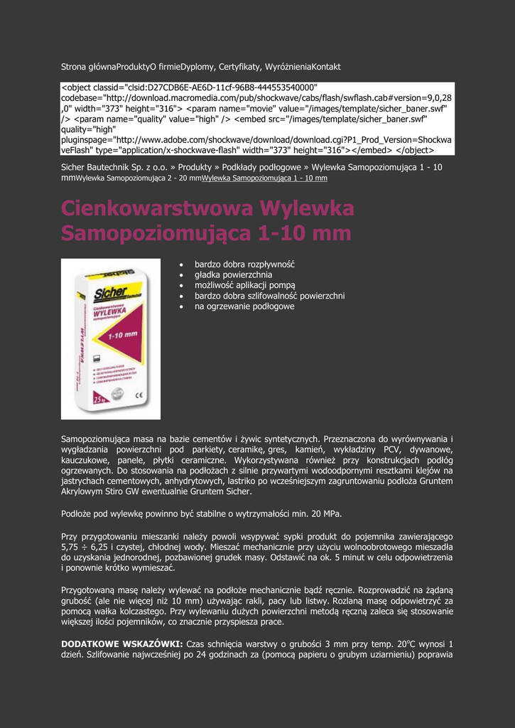 Strona głównaProduktyO firmieDyplomy, Certyfikaty, WyróżnieniaKontakt <object classid="clsid:D27CDB6E-AE6D-11cf-96B8-444553540000" codebase="http://download.macromedia.com/pub/shockwave/cabs/flash/swflash.cab#version=9,0,28 ,0" width="373" height="316"> <param name="movie" value="/images/template/sicher_baner.swf" /> <param name="quality" value="high" /> <embed src="/images/template/sicher_baner.swf" quality="high" pluginspage="http://www.adobe.com/shockwave/download/download.cgi?P1_Prod_Version=Shockwa veFlash" type="application/x-shockwave-flash" width="373" height="316"></embed> </object> Sicher Bautechnik Sp. z o.o. » Produkty » Podkłady podłogowe » Wylewka Samopoziomująca 1 - 10 mmWylewka Samopoziomująca 2 - 20 mmWylewka Samopoziomująca 1 - 10 mm Cienkowarstwowa Wylewka Samopoziomująca 1-10 mm bardzo dobra rozpływność gładka powierzchnia możliwość aplikacji pompą bardzo dobra szlifowalność powierzchni na ogrzewanie podłogowe Samopoziomująca masa na bazie cementów i żywic syntetycznych. Przeznaczona do wyrównywania i wygładzania powierzchni pod parkiety, ceramikę, gres, kamień, wykładziny PCV, dywanowe, kauczukowe, panele, płytki ceramiczne. Wykorzystywana również przy konstrukcjach podłóg ogrzewanych. Do stosowania na podłożach z silnie przywartymi wodoodpornymi resztkami klejów na jastrychach cementowych, anhydrytowych, lastriko po wcześniejszym zagruntowaniu podłoża Gruntem Akrylowym Stiro GW ewentualnie Gruntem Sicher. Podłoże pod wylewkę powinno być stabilne o wytrzymałości min. 20 MPa. Przy przygotowaniu mieszanki należy powoli wsypywać sypki produkt do pojemnika zawierającego 5,75 ÷ 6,25 i czystej, chłodnej wody. Mieszać mechanicznie przy użyciu wolnoobrotowego mieszadła do uzyskania jednorodnej, pozbawionej grudek masy. Odstawić na ok. 5 minut w celu odpowietrzenia i ponownie krótko wymieszać. Przygotowaną masę należy wylewać na podłoże mechanicznie bądź ręcznie. Rozprowadzić na żądaną grubość (ale nie więcej niż 10 mm) używając rakli, pacy lub listwy. Rozlaną masę odpowietrzyć za pomocą wałka kolczastego. Przy wylewaniu dużych powierzchni metodą ręczną zaleca się stosowanie większej ilości pojemników, co znacznie przyspiesza prace. DODATKOWE WSKAZÓWKI: Czas schnięcia warstwy o grubości 3 mm przy temp. 20oC wynosi 1 dzień. Szlifowanie najwcześniej po 24 godzinach za (pomocą papieru o grubym uziarnieniu) poprawia jakość powierzchni i zwiększa jej chłonność. Okres przydatności do użycia wynosi 9 miesięcy od daty produkcji. Przechowywać w oryginalnie zamkniętym opakowaniu, w suchym pomieszczeniu. DANE TECHNICZNE I WYKONAWCZE: Temperatura stosowania (powietrza, podłoża, od +5°C do +25°C materiałów) Proporcja mieszania ok. 5,75 ÷ 6,25 l wody/25 kg zaprawy Czas przydatności do użycia po zarobieniu wodą ok. 30 min. w temperaturze +20°C i wilgotność względna powietrza ok. 60% Postać szary proszek Zużycie ok. 1,5 kg/m2 na 1 mm grubości warstwy zaprawy Możliwość użytkowania ruch pieszy po 12 godz. Możliwość układania dalszych warstw wykończeniowych po ok. 7 dniach od wylania (przy temp. +20°C) Grubość warstwy 1 - 10 mm Wytrzymałość na zginanie F7 Wytrzymałość na ściskanie C35 Odporność na ścieranie A22 Przyczepność do podłoża B1,0 OPAKOWANIA: Jednostkowe: worki papierowe 25 kg Zbiorcze: paleta 48 szt x 25 kg = 1200 kg WYRÓB ZGODNY Z: EN 13813:2003 Pliki do pobrania: Karta Charakterystyki Deklaracja Właściwości Użytkowych Karta Techniczna Copyright © 2016 Sicher Bautechnik Sp. z o.o. - Wszelkie prawa zastrzeżone ul. Milenijna 12/14, 97-200 Tomaszów Mazowiecki tel./fax (44) 734-67-91 - 93; (44) 734-63-99 Realizacja: Dianthus Dokument wydrukowany ze strony: www.sicher-bautechnik.com/produkty/podkladypodlogowe/wylewka-samopoziomujaca-1-10-mm/