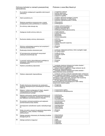 Ochrona ludności w ramach powszechnej samoobrony Pobrane z www.Bez-Nauki.pl 1. Do środków zastępczych sygnałów alarmowych zaliczamy: 2. Alarm powietrzny to: 3. Skażone powietrze oczyszcza się w czasie przepływania przez pochłaniacz w maskach: [ [ [ [ [ [ [ [ [ ] rozgłośnie radiowe ] syreny alarmowe ] akustyczne sygnały ] optyczne sygnały ] szybkie uderzenia trwające 3 minuty ] szybkie uderzenia 10 sekundowe ] powolne uderzenia przez 3 minuty ] filtracyjnych ] izolacyjnych 4. Do ochrony ciała stosuje się: 5. Zastępcze środki ochrony skóry to: 6. Ruchome obiekty ochrony zbiorowej to: 7. Schrony wolnostojące powinny być przykryte 2 metrową warstwą ziemi [ [ [ [ [ [ [ [ [ [ [ [ [ [ [ [ ] odzież ochronną lekką L-1 ] maskę przeciwgazową ] płaszcz ochronny OP-1 ] izolacyjną odzież gazoszczelną ] maski gazowe ] odzież ochronna ] gumowce ] kominiarki ] okulary pływackie ] schrony ] wozy bojowe ] samoloty ] okręty marynarki wojennej ] ukrycia ] Prawda ] Fałsz 8. Ewakuacja doraźna stosowana jest: 9. W hermetycznie zamykanych naczyniach szklanych przechowuje się: 10. Ł»ywność można zdezynfekować poddając ją procesowi naświetlania promieniami ultrafioletowymi [ [ [ [ [ [ [ [ [ ] podczas niebezpieczeństwa, które wystąpiło nagle ] w czasie wojny ] wodę do picia ] produkty sypkie ] masło ] mięso ] marynaty ] Prawda ] Fałsz 11. Wybierz prawidłową odpowiedź: 12. Wybierz odpowiedź nieprawidłową: 13. Środki chemiczne stosowane do zwalczania grzybów pasożytniczych powodujacych choroby roślin to: 14. Miejsce i rodzaj występujących klęsk, stopień i rodzaj skażenia oraz miejsce skupisk poszkodowanych podaje: [ ] rozpoznanie ogólne [ ] rozpoznanie specjalistyczne 15. Metoda wykrywania skażeń promieniotwórczych polegająca na świeceniu określonych substancji pod wpływem promieniowania to metoda: 16. Do pomiaru jonizacji powietrza pod wpływem promieniowania służy dawka: 17. Zmniejszanie szkodliwości opadu radioaktywnego to: 18. Wody nie wolno używać do gaszenia eksponatów muzealnych, sodu, karbidu i instalacji elektrycznych. [ [ [ [ [ [ [ [ [ [ [ [ ] chemiczna ] fotograficzna ] jonizująca ] scyntylacyjna ] promieniowania ] pochłonięta ] ekspozycyjna ] dezaktywacja ] dezynfekcja ] dezynsekcja ] Prawda ] Fałsz 19. Zabieg specjalny stosowany do likwidacji środków biologicznych to: 20. Zabiegi sanitarne mogą być: [ [ [ [ [ [ [ ] dezynsekcja ] deratyzacja ] odkażanie ] stałe ] okresowe ] całkowite ] częściowe [ ] produkty skażone biologicznie trzeba zbadać i zdezynfekować przez gotowanie [ ] pasze skażone wąglikiem mogą nadawać się do spożycia po zdezynfekowaniu [ ] produkty skażone biologicznie trzeba zbadać i zdezynfekować przez parowanie [ ] podczas ochrony zwierząt zwierzęta stare umieszcza się w miejscach osłoniętych, a młode na dalszym miejscu [ ] stopień skażenia promieniotwórczego można zmniejszyć myjąc ziemniaki, marchew nad wcześniej przygotowanymi dołami ściekowymi [ ] w celu ograniczenia ilości substancji promieniotwórczej przenikającej do roślin należy zwapnować skażone gleby [ ] fungicydy [ ] pestycydy Poprawne odpowiedzi 1. 3. 5. 7. 9. 11. 13. 15. 17. 19. akustyczne sygnały, optyczne sygnały filtracyjnych 2. szybkie uderzenia trwające 3 minuty 4. gumowce, kominiarki, okulary pływackie Fałsz wodę do picia, produkty sypkie, masło, mięso, marynaty produkty skażone biologicznie trzeba zbadać i zdezynfekować przez gotowanie, produkty skażone biologicznie trzeba zbadać i zdezynfekować przez parowanie fungicydy scyntylacyjna dezaktywacja dezynsekcja, deratyzacja 6. odzież ochronną lekką L-1, płaszcz ochronny OP-1, izolacyjną odzież gazoszczelną wozy bojowe, samoloty, okręty marynarki wojennej podczas niebezpieczeństwa, które wystąpiło nagle Prawda 8. 10. 12. podczas ochrony zwierząt zwierzęta stare umieszcza się w miejscach osłoniętych, a młode na dalszym miejscu 14. 16. 18. 20. rozpoznanie ogólne ekspozycyjna Prawda całkowite, częściowe