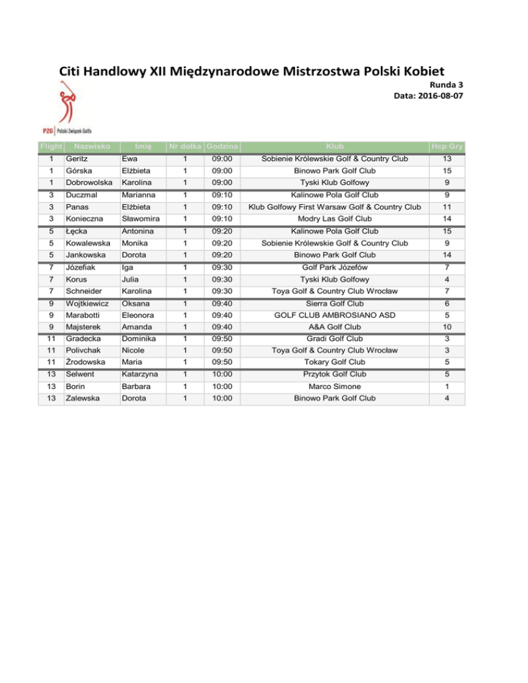 Citi Handlowy XII Międzynarodowe Mistrzostwa Polski Kobiet Runda 3 Data: 2016-08-07 Flight Imię Nazwisko Nr dołka Godzina Klub Hcp Gry 1 Geritz Ewa 1 09:00 Sobienie Królewskie Golf & Country Club 13 1 Górska Elżbieta 1 09:00 Binowo Park Golf Club 15 1 Dobrowolska Karolina 1 09:00 Tyski Klub Golfowy 9 3 Duczmal Marianna 1 09:10 Kalinowe Pola Golf Club 9 3 Panas Elżbieta 1 09:10 Klub Golfowy First Warsaw Golf & Country Club 11 3 Konieczna Sławomira 1 09:10 Modry Las Golf Club 14 5 Łęcka Antonina 1 09:20 Kalinowe Pola Golf Club 15 5 Kowalewska Monika 1 09:20 Sobienie Królewskie Golf & Country Club 9 5 Jankowska Dorota 1 09:20 Binowo Park Golf Club 14 7 Józefiak Iga 1 09:30 Golf Park Józefów 7 7 Korus Julia 1 09:30 Tyski Klub Golfowy 4 7 Schneider Karolina 1 09:30 Toya Golf & Country Club Wrocław 7 9 Wojtkiewicz Oksana 1 09:40 Sierra Golf Club 6 9 Marabotti Eleonora 1 09:40 GOLF CLUB AMBROSIANO ASD 5 9 Majsterek Amanda 1 09:40 A&A Golf Club 10 11 Gradecka Dominika 1 09:50 Gradi Golf Club 3 11 Polivchak Nicole 1 09:50 Toya Golf & Country Club Wrocław 3 11 Żrodowska Maria 1 09:50 Tokary Golf Club 5 13 Selwent Katarzyna 1 10:00 Przytok Golf Club 5 13 Borin Barbara 1 10:00 Marco Simone 1 13 Zalewska Dorota 1 10:00 Binowo Park Golf Club 4