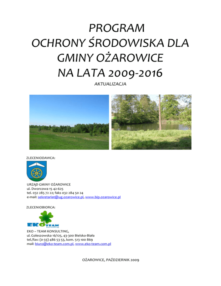 PROGRAM OCHRONY ŚRODOWISKA DLA GMINY OŻAROWICE NA LATA 2009-2016 AKTUALIZACJA ZLECENIODAWCA: URZĄD GMINY OŻAROWICE ul. Dworcowa 15 42-625 tel. 032 285 72 22; faks 032 284 50 24 e-mail: [email protected], www.bip.ozarowice.pl ZLECENIOBIORCA: EKO – TEAM KONSULTING, ul. Goleszowska 16/125, 43-300 Bielsko-Biała tel./fax: (0-33) 486 53 53, kom. 513 100 869 mail: [email protected], www.eko-team.com.pl OŻAROWICE, PAŹDZIERNIK 2009 AKTUALIZACJA PROGRAMU OCHRONY ŚRODOWISKA DLA GMINY OŻAROWICE AUTORZY OPRACOWANIA: Agnieszka Chylak, Andrzej Blarowski, Tomasz Giza, Piotr Kukla, Konsultacja merytoryczna: Joanna Dzikoń, Elżbieta Wrężlewicz. Osoby i instytucje współpracujące przy opracowaniu niniejszego dokumentu: 1. Rozalia Farnicka – Urząd Gminy Ożarowice, 2. Zakład Gospodarki Komunalnej w Pyrzowicach, Zdjęcia na okładce: www.mapy.eholiday.pl/galeria-ozarowice 2 AKTUALIZACJA PROGRAMU OCHRONY ŚRODOWISKA DLA GMINY OŻAROWICE SPIS TREŚCI 1 WSTĘP ................................................................................................................................................................. 8 1.1 PODSTAWA OPRACOWANIA ................................................................................................................................... 8 1.2 METODOLOGIA OPRACOWANIA, ZAWARTOŚĆ DOKUMENTU I JEGO PODSTAWY PRAWNE ...................................................... 8 2 UWARUNKOWANIE ZEWNĘTRZNE................................................................................................................... 10 2.1 POLITYKA EKOLOGICZNA PAŃSTWA .........................................................................................................................10 2.2 STRATEGIA ROZWOJU WOJEWÓDZTWA ŚLĄSKIEGO NA LATA 2000-2020 ...................................................................... 11 2.3 PROGRAM OCHRONY ŚRODOWISKA WOJEWÓDZTWA ŚLĄSKIEGO DO ROKU 2004 ORAZ CELE DŁUGOTERMINOWE DO ROKU 2015.. ....................................................................................................................................................................... 12 2.4 STRATEGIA ROZWOJU POWIATU TARNOGÓRSKIEGO................................................................................................... 13 2.5 PROGRAM ZRÓWNOWAŻONEGO ROZWOJU I OCHRONY ŚRODOWISKA POWIATU TARNOGÓRSKIEGO .................................... 14 2.6 STUDIUM UWARUNKOWAŃ I KIERUNKÓW ZAGOSPODAROWANIA PRZESTRZENNEGO GMINY OŻAROWICE ............................. 15 3 OGÓLNA CHARAKTERYSTYKA GMINY OŻAROWICE ..........................................................................................16 3.1 POŁOŻENIE ........................................................................................................................................................16 3.2 UKSZTAŁTOWANIE TERENU I BUDOWA GEOLOGICZNA..................................................................................................18 3.3 KLIMAT .............................................................................................................................................................18 3.4 OTOCZENIE SPOŁECZNO GOSPODARCZE ....................................................................................................................18 3.5 INWESTYCJE GMINNE............................................................................................................................................ 21 4 OCHRONA DZIEDZICTWA PRZYRODNICZEGO ................................................................................................... 22 4.1 OCHRONA PRZYRODY I KRAJOBRAZU .......................................................................................................................22 4.1.1 Charakterystyka i ocena stanu aktualnego ..........................................................................................22 4.1.1.2 Siedliska przyrodnicze .........................................................................................................................22 4.1.1.3 Chronione i ginące elementy flory i fauny .......................................................................................... 23 4.1.1.4 Formy ochrony przyrody na terenie Gminy ........................................................................................ 24 4.1.1.5 Zieleń urządzona .................................................................................................................................25 4.1.2 Identyfikacja potrzeb ................................................................................................................................ 26 4.1.3 Cele i zadania środowiskowe do roku 2012 i do roku 2016 ........................................................................ 28 4.1.4 Harmonogram zadań................................................................................................................................. 29 4.1.5. Wnioski ...................................................................................................................................................... 31 4.2 OCHRONA I ZRÓWNOWAŻONY ROZWÓJ LASÓW......................................................................................................... 31 4.2.1 Charakterystyka i ocena stanu aktualnego .......................................................................................... 31 4.2.1.1 Obszary leśne ................................................................................................................................... 31 4.2.1.2 Racjonalne gospodarowanie zasobami leśnymi .................................................................................. 31 4.2.1.3 Ustalenia w zakresie prognozowania zalesiania gruntów porolnych i rekultywacji zdegradowanych terenów poeksploatacyjnych ....................................................................................................................... 33 4.2.2 Ide