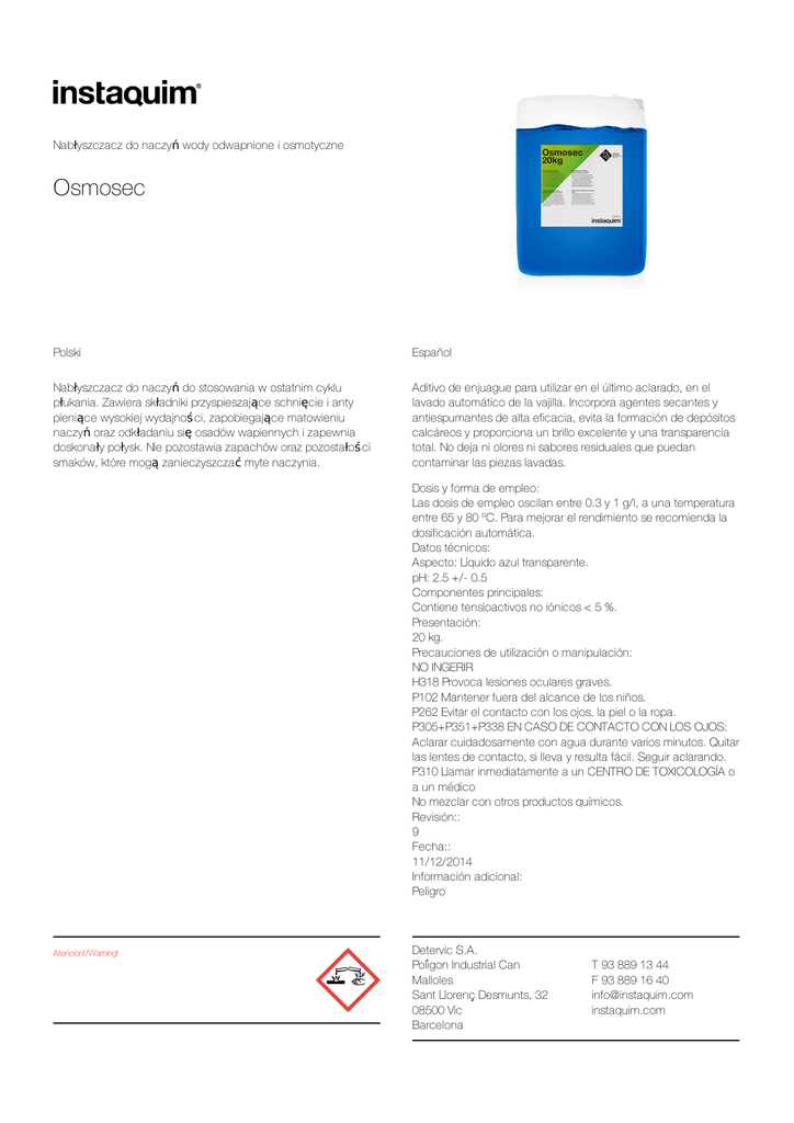 Nabłyszczaczdonaczyńwodyodwapnioneiosmotyczne Osmosec Polski Español Nabłyszczaczdonaczyńdostosowaniawostatnimcyklu płukania.Zawieraskładnikiprzyspieszająceschnięcieianty pieniącewysokiejwydajnoś ci,zapobiegającematowieniu naczyńorazodkładaniusięosadówwapiennychizapewnia doskonałypołysk.Niepozostawiazapachóworazpozostałoś ci smaków,któremogązanieczyszczaćmytenaczynia. Aditivodeenjuagueparautilizarenelúltimoaclarado,enel lavadoautomáticodelavajilla.Incorporaagentessecantesy antiespumantesdealtaeficacia,evitalaformacióndedepósitos calcáreosyproporcionaunbrilloexcelenteyunatransparencia total.Nodejanioloresnisaboresresidualesquepuedan contaminarlaspiezaslavadas. Dosisyformadeempleo: Lasdosisdeempleooscilanentre0.3y1g/l,aunatemperatura entre65y80ºC.Paramejorarelrendimientoserecomiendala dosificaciónautomática. Datostécnicos: Aspecto:Líquidoazultransparente. pH:2.5+/-0.5 Componentesprincipales: Contienetensioactivosnoiónicos<5%. Presentación: 20kg. Precaucionesdeutilizaciónomanipulación: NOINGERIR H318Provocalesionesocularesgraves. P102Mantenerfueradelalcancedelosniños. P262Evitarelcontactoconlosojos,lapielolaropa. P305+P351+P338ENCASODECONTACTOCONLOSOJOS: Aclararcuidadosamenteconaguadurantevariosminutos.Quitar laslentesdecontacto,sillevayresultafácil.Seguiraclarando. P310LlamarinmediatamenteaunCENTRODETOXICOLOGÍAo aunmédico Nomezclarconotrosproductosquímicos. Revisión:: 9 Fecha:: 11/12/2014 Informaciónadicional: Peligro Atención!/Warning! DetervicS.A. PolígonIndustrialCan Malloles SantLlorençDesmunts,32 08500Vic Barcelona T938891344 F938891640 [email protected] instaquim.com