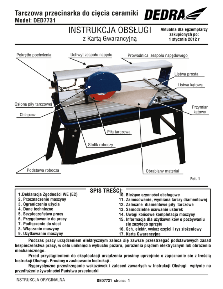 Tarczowa przecinarka do cięcia ceramiki Model: DED7731 INSTRUKCJA OBSŁUGI z Kart¹ Gwarancyjną Pokrętło pochylenia Uchwyt zespołu napędu Aktualna dla egzemplarzy zakupionych po: 1 stycznia 2012 r Prowadnica zespołu napędowego Listwa prosta Listwa kątowa Osłona piły tarczowej Przymiar kątowy Chlapacz Piła tarczowa Stolik roboczy Podstawa robocza Obrabiany materiał Fot. 1 1.Deklaracja Zgodności WE (EC) 2. Przeznaczenie maszyny 3. Ograniczenia użycia 4. Dane techniczne 5. Bezpieczeństwo pracy 6. Przygotowanie do pracy 7. Podłączenie do sieci 8. Włączanie maszyny 9. Użytkowanie maszyny SPIS TREŚCI: 10. Bieżące czynności obsługowe 11. Zamocowanie, wymiana tarczy diamentowej 12. Zalecane diamentowe piły tarczowe 13. Samodzielne usuwanie usterek 14. Uwagi końcowe kompletacja maszyny 15. Informacja dla użytkowników o pozbywaniu się zuzytego sprzętu 16. Sch. elektr, wykaz części i rys złożeniowy 17. Karta Gwarancyjna Podczas pracy urządzeniem elektrycznym zaleca się zawsze przestrzegać podstawowych zasad bezpieczeństwa pracy, w celu uniknięcia wybuchu pożaru, porażenia prądem elektrycznym lub obrażenia mechanicznego. Przed przystąpieniem do eksploatacji urządzenia prosimy uprzejmie o zapoznanie się z treścią Instrukcji Obsługi. Prosimy o zachowanie Instrukcji. Rygorystyczne przestrzeganie wskazówek i zaleceń zawartych w Instrukcji Obsługi wpłynie na przedłużenie żywotności Państwa przecinarki INSTRUKCJA ORYGINALNA DED7731 strona: 1 1. DEKLARACJA ZGODNOŚCI WE dla partii: 11200001-11200700 DEDRA EXIM Sp z o.o. 05-800 Pruszków ul. 3-go Maja 8, deklaruje z pełną odpowiedzialnością, że: Maszyna: Tarczowa przecinarka do ciêcia ceramiki Nr katalogowy: DED7731 Funkcja: Patrz Instrukcja Obsługi Rok produkcji: 2012 do której odnosi się niniejsza deklaracja spełnia wymagania Dyrektyw WE (EC): 2004/108/EC 2006/42/EC w sprawie zbliżenia przepisów państw członkowskich dotyczących kompatybilności elektromagnetycznej (Electromagnetic compatibility) co potwierdzono testem zgodności nr. E8N 110855256219 wydanym przez TÜV SÜD RIDLERSTRASSE 65 80339 MUNCHEN GERMANY w sprawie zbliżenia przepisów państw członkowskich dotyczących maszyn (Machinery safety) co potwierdza test zgodności nr. M8A 100755256180, wydany przez TÜV SÜD RIDLERSTRASSE 65 80339 MUNCHEN GERMANY oraz wymagania zasadnicze w RP: Ustawa z dnia 13.04.2007 r. o kompatybilności elektromagnetycznej Dz. U.2007 nr 82 poz. 556 Dz. U.2008 nr 199 poz. 1228 Rozporządzenie Ministra Gospodarki z dnia 21.10.2008 r. w sprawie zasadniczych wymagań dla maszyn Zastosowane normy zharmonizowane: EN 55014-1/A1:2009 ; EN 55014-2/A2:2008 ; EN 61000-3-2/A2:2009 ; EN 61000-3-3:2008 ; EN 61029-1:2009 ; EN 12418/A1:2009 09 Pruszków 2012-01 01 Deklaracja zgodności WE traci swoją ważność, jeżeli maszyna zostanie zmieniona,przebudowana lub jest użytkowana niezgodnie z Instrukcją Obsługi. Dyrektor Techniczny mgr inż Waldemar Łabudzki Osoba upoważniona do sporządzania deklaracji zgodności: kierownik działu technicznego i serwisu: Grzegorz Ratyński DEDRA EXIM Sp. z o.o. 05-800 Pruszków ul. 3-go Maja 2. Przeznaczenie maszyny Przecinarka z tarczową piłą diamentową jest produktem przeznaczonym do cięcia wszelkiego rodzaju płytek okładzinowych, zarówno ściennych jak i podłogowych oraz kamienia, cegły, cegły klinkierowej i innych materiałów ceramicznych o wymiarach z zakresu użytkowego . Zastosowano tutaj system obróbki na mokro z użyciem wody jako czynnika chłodzącego i przeciwpyłowego, podawanego bezpośrednio na tarczę diamentową. Dzięki temu w czasie pracy znacznie ograniczono rozprzestrzenianie się urobku. Maszyna pozwala wykonać podstawowe operacje cięcia elementów ceramicznych: cięcie wzdłużne pasków, cięcie poprzeczne, cięcie wzdłuż przekątnej oraz ukosowanie krawędzi. Wszystkie wymienione operacje cięcia opisano szczegółowo w dalszej części instrukcji. 3. Ograniczenia użycia Przecinarki z tarczą diamentową do cięcia ceramik modele DED7731 mogą być użytkowane tylko zgodnie z zamieszczonymi poniżej “Dopuszczalnymi warunkami pracy”. Maszyna może być użytkowana tylko i wyłącznie z tarczowymi piłami diamentowymi, opisanymi w części. “Zalecane diamentowe piły tarczowe”. Niedopuszczalne jest także montowanie pił tarczowych przeznaczonych do cięcia innych materiałów (metale, drewno, płyty gipsowo-kartonowe, tworzywa sztuczne itp.). Zabronione jest również cięcie innych materiałów, które nie są szeroko pojętą ceramiką, kamieniem itp. Zabronione jest cięcie na sucho. Waga obrabianego detalu powinna być tak dobrana by nie powodować braku stabilności maszyny. W konstrukcji i budowie przecinarki nie przewidziano zastosowań urządzenia do celów profesjonalnych. Przecinarki przeznaczone są dla majsterkowiczów lub do użytku domowego. Samowolne zmiany w budowie mechanicznej i elektrycznej, wszelkie modyfikacje, i czynności obsługowe nie opisane w Instrukcji Obsługi będą traktowane za bezprawne i powodują natychmiastową utratę Praw Gwarancyjnych. Użytkowanie niezgodnie z przeznaczeniem bądź z Instrukcją Obsługi oraz przekraczanie dopuszczalnych parametrów pracy spowoduje natychmiastową utratę Praw Gwarancyjnych. Przecinarka tarczowa może być użytkowana tylko w pomieszczeniach zamkniętych. W czasie pracy diamentowa piła tarczowa rozpryskuje niewielkie ilości wody, zwłaszcza przy cięciu elementów wystających poza gabaryt stołu roboczego. Dlatego też przy urządzaniu miejsca pracy należy na ten fakt zwrócić uwagę(poslizgnięcie się operatora maszyny) oraz należy systematycznie uzupełniać poziom wody w zbiorniku by pompka mogła funkcjonować a sam proces cięcia przebiegał prawidłowo. DED7731 strona: 2 4. Dane techniczne Przecinarka tarczowa - modele: DED7731 Silnik elektryczny indukcyjny Napięcie pracy 230 V 50 Hz Moc znamionowa silnika 800 W Narzędzie klasy I 