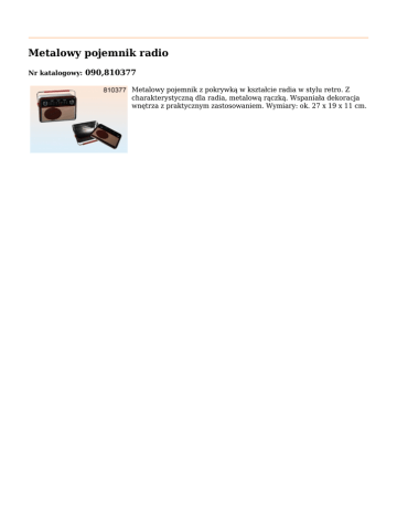 Metalowy pojemnik radio Nr katalogowy: 090,810377 Metalowy pojemnik z pokrywką w kształcie radia w stylu retro. Z charakterystyczną dla radia, metalową rączką. Wspaniała dekoracja wnętrza z praktycznym zastosowaniem. Wymiary: ok. 27 x 19 x 11 cm.