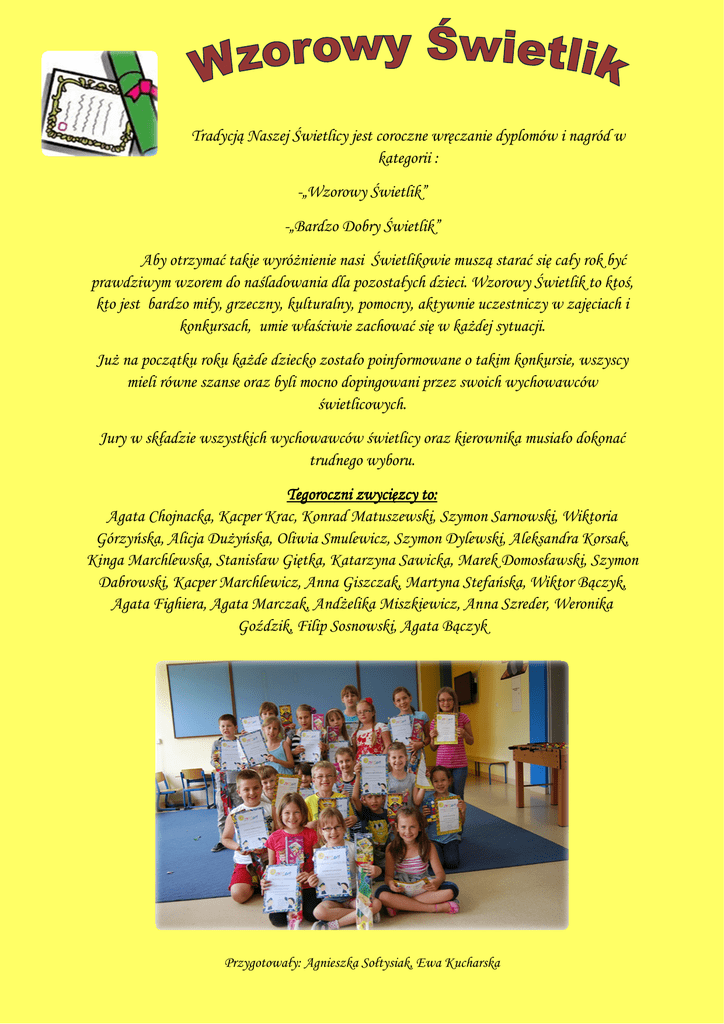 Tradycją Naszej Świetlicy jest coroczne wręczanie dyplomów i nagród w kategorii : -„Wzorowy Świetlik” -„Bardzo Dobry Świetlik” Aby otrzymać takie wyróŜnienie nasi Świetlikowie muszą starać się cały rok być prawdziwym wzorem do naśladowania dla pozostałych dzieci. Wzorowy Świetlik to ktoś, kto jest bardzo miły, grzeczny, kulturalny, pomocny, aktywnie uczestniczy w zajęciach i konkursach, umie właściwie zachować się w kaŜdej sytuacji. JuŜ na początku roku kaŜde dziecko zostało poinformowane o takim konkursie, wszyscy mieli równe szanse oraz byli mocno dopingowani przez swoich wychowawców świetlicowych. Jury w składzie wszystkich wychowawców świetlicy oraz kierownika musiało dokonać trudnego wyboru. Tegoroczni zwycięzcy to: Agata Chojnacka, Kacper Krac, Konrad Matuszewski, Szymon Sarnowski, Wiktoria Górzyńska, Alicja DuŜyńska, Oliwia Smulewicz, Szymon Dylewski, Aleksandra Korsak, Kinga Marchlewska, Stanisław Giętka, Katarzyna Sawicka, Marek Domosławski, Szymon Dabrowski, Kacper Marchlewicz, Anna Giszczak, Martyna Stefańska, Wiktor Bączyk, Agata Fighiera, Agata Marczak, AndŜelika Miszkiewicz, Anna Szreder, Weronika Goździk, Filip Sosnowski, Agata Bączyk Przygotowały: Agnieszka Sołtysiak, Ewa Kucharska