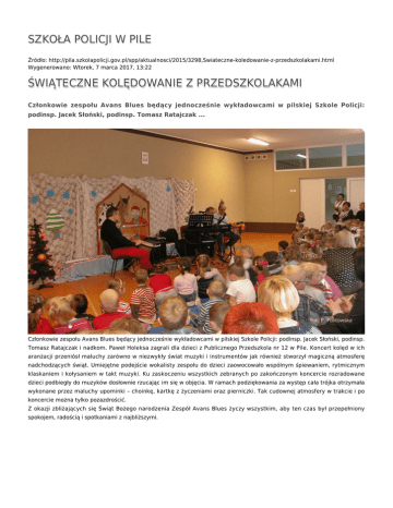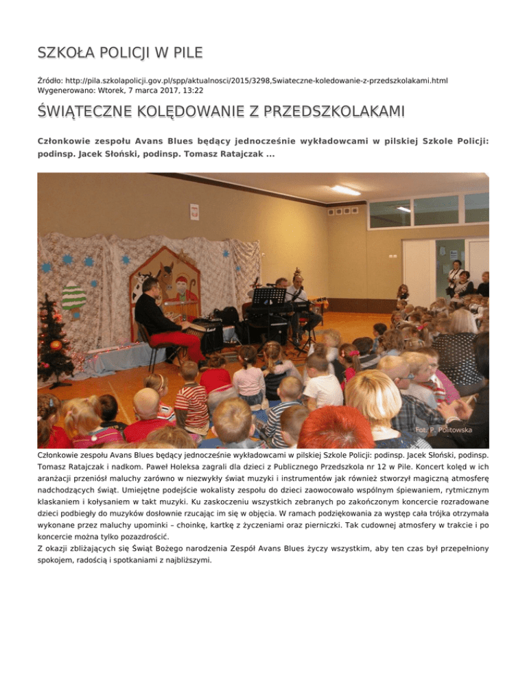 SZKOŁA POLICJI W PILE Źródło: http://pila.szkolapolicji.gov.pl/spp/aktualnosci/2015/3298,Swiateczne-koledowanie-z-przedszkolakami.html Wygenerowano: Wtorek, 7 marca 2017, 13:22 ŚWIĄTECZNE KOLĘDOWANIE Z PRZEDSZKOLAKAMI Członkowie zespołu Avans Blues będący jednocześnie wykładowcami w pilskiej Szkole Policji: podinsp. Jacek Słoński, podinsp. Tomasz Ratajczak ... Członkowie zespołu Avans Blues będący jednocześnie wykładowcami w pilskiej Szkole Policji: podinsp. Jacek Słoński, podinsp. Tomasz Ratajczak i nadkom. Paweł Holeksa zagrali dla dzieci z Publicznego Przedszkola nr 12 w Pile. Koncert kolęd w ich aranżacji przeniósł maluchy zarówno w niezwykły świat muzyki i instrumentów jak również stworzył magiczną atmosferę nadchodzących świąt. Umiejętne podejście wokalisty zespołu do dzieci zaowocowało wspólnym śpiewaniem, rytmicznym klaskaniem i kołysaniem w takt muzyki. Ku zaskoczeniu wszystkich zebranych po zakończonym koncercie rozradowane dzieci podbiegły do muzyków dosłownie rzucając im się w objęcia. W ramach podziękowania za występ cała trójka otrzymała wykonane przez maluchy upominki – choinkę, kartkę z życzeniami oraz pierniczki. Tak cudownej atmosfery w trakcie i po koncercie można tylko pozazdrościć. Z okazji zbliżających się Świąt Bożego narodzenia Zespół Avans Blues życzy wszystkim, aby ten czas był przepełniony spokojem, radością i spotkaniami z najbliższymi. autor: Paulina Politowska (23.12.15) Ocena: 0/5 (0) Tweetnij