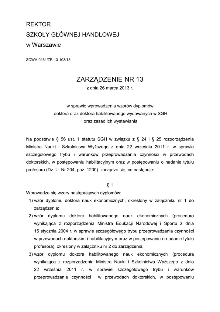 REKTOR SZKOŁY GŁÓWNEJ HANDLOWEJ w Warszawie ZOWA-0161/ZR-13-103/13 ZARZĄDZENIE NR 13 z dnia 26 marca 2013 r. w sprawie wprowadzenia wzorów dyplomów doktora oraz doktora habilitowanego wydawanych w SGH oraz zasad ich wystawiania Na podstawie § 56 ust. 1 statutu SGH w związku z § 24 i § 25 rozporządzenia Ministra Nauki i Szkolnictwa WyŜszego z dnia 22 września 2011 r. w sprawie szczegółowego trybu i warunków przeprowadzania czynności w przewodach doktorskich, w postępowaniu habilitacyjnym oraz w postępowaniu o nadanie tytułu profesora (Dz. U. Nr 204, poz. 1200) zarządza się, co następuje: §1 Wprowadza się wzory następujących dyplomów: 1) wzór dyplomu doktora nauk ekonomicznych, określony w załączniku nr 1 do zarządzenia; 2) wzór dyplomu doktora habilitowanego nauk ekonomicznych (procedura wynikająca z rozporządzenia Ministra Edukacji Narodowej i Sportu z dnia 15 stycznia 2004 r. w sprawie szczegółowego trybu przeprowadzania czynności w przewodach doktorskim i habilitacyjnym oraz w postępowaniu o nadanie tytułu profesora), określony w załączniku nr 2 do zarządzenia; 3) wzór dyplomu doktora habilitowanego nauk ekonomicznych (procedura wynikająca z rozporządzenia Ministra Nauki i Szkolnictwa WyŜszego z dnia 22 września 2011 r. w przeprowadzania czynności sprawie szczegółowego trybu i warunków w przewodach doktorskich, w postępowaniu habilitacyjnym oraz w postępowaniu o nadanie tytułu profesora), określony w załączniku nr 3 do zarządzenia. §2 1. Osoba, której nadano stopień doktora nauk ekonomicznych otrzymuje dyplom, którego sposób wypełniania określa załącznik nr 4 do zarządzenia. 2. Osoba, której nadano stopień doktora habilitowanego nauk ekonomicznych, o którym mowa w § 1 pkt 2, otrzymuje dyplom, którego sposób wypełniania określa załącznik nr 5 do zarządzenia. 3. Osoba, której nadano stopień doktora habilitowanego nauk ekonomicznych, o którym mowa w § 1 pkt 3, otrzymuje dyplom, którego sposób wypełniania określa załącznik nr 6 do zarządzenia. §3 1. Dyplom doktora nauk ekonomicznych wystawia się w 3 egzemplarzach: oryginał, odpis i odpis do akt. 2. Dyplom doktora habilitowanego nauk ekonomicznych wystawia się w 3 egzemplarzach: oryginał, odpis i odpis do akt. §4 1. Do podpisania dyplomu doktora upowaŜnieni są: Rektor, dziekan właściwej jednostki organizacyjnej Uczelni , promotor lub współpromotor. 2. Do podpisania dyplomu doktora habilitowanego, o którym mowa w § 1 pkt 2 upowaŜnieni są: Rektor i dziekan właściwej jednostki organizacyjnej Uczelni. 3. Do podpisania dyplomu doktora habilitowanego, o którym mowa w § 1 pkt 3 upowaŜnieni są: Rektor, dziekan właściwej jednostki organizacyjnej Uczelni oraz przewodniczący komisji habilitacyjnej. §5 Dyplomy doktora oraz doktora habilitowanego wydawane są w następujących formatach: oryginały – format A3, odpisy i odpisy do akt – format A4. §6 1. Odbiór oryginału i odpisu osoba otrzymująca dyplom kwituje odpowiednio w Księdze dyplomów doktorskich lub w Księdze dyplomów habilitacyjnych, które znajdują się w Dziale Nauki. 2. Odpis do akt przekazywany jest przez Dział Nauki do jednostki organizacyjnej Uczelni, w której wszczęty był przewód doktorski, habilitacyjny lub postępowanie habilitacyjne, w terminie 14 dni od dnia uroczystego wręczenia dyplomów w czasie Święta SGH. §7 Wydawane dyplomy powinny być opatrzone numerem (liczba porządkowa w Księdze dyplomów doktorskich lub Księdze dyplomów habilitacyjnych). §8 Dyplomy są drukami ścisłego zarachowania. Obowiązek ich rozliczenia spoczywa na kierowniku Działu Nauki. §9 Na odpisie dyplomu umieszcza się z prawej strony nazwy druku odpowiednio informację „Odpis” lub „Odpis do akt”. § 10 Nadzór nad realizacją zarządzenia sprawuje prorektor ds. nauki i współpracy z zagranicą. § 11 Zarządzenie wchodzi w Ŝycie z dniem podpisania. REKTOR prof. dr hab. Tomasz Szapiro