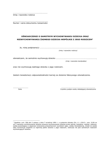 ......................................................... Imię i nazwisko rodzica .................................................... Numer i seria dokumentu tożsamości OŚWIADCZENIE O SAMOTNYM WYCHOWYWANIU DZIECKA ORAZ NIEWYCHOWYWANIU ŻADNEGO DZIECKA WSPÓLNIE Z JEGO RODZICEM 1 Ja, niżej podpisana/y …………………………………………………………………………………………………. (imię i nazwisko rodzica) oświadczam, że samotnie wychowuję dziecko ..........................................................................., (imię i nazwisko kandydata) oraz nie wychowuję żadnego dziecka z jego rodzicem. Jestem świadoma/y odpowiedzialności karnej za złożenie fałszywego oświadczenia. ………………………… Data ……………..…………………………………………. Czytelny podpis osoby składającej oświadczenie Zgodnie z art. 20b pkt 2 ustawy z dnia 7 września 1991 r. o systemie oświaty (Dz. U. z 2015 r. poz. 2156 ze zm.) samotne wychowywanie dziecka oznacza wychowywanie dziecka przez pannę, kawalera, wdowę, wdowca, osobę pozostającą w separacji orzeczonej prawomocnym wyrokiem sądu, osobę rozwiedzioną, chyba że osoba taka wychowuje wspólnie co najmniej jedno dziecko z jego rodzicem, wówczas nie jest samotnym rodzicem wychowującym dziecko. 1