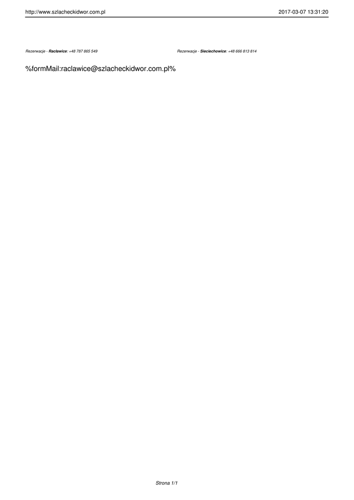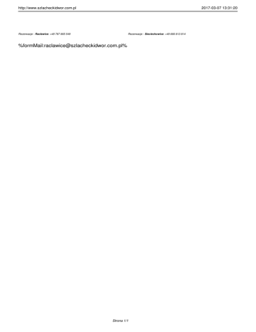 http://www.szlacheckidwor.com.pl Rezerwacje - Racławice: +48 787 865 549 2017-03-07 13:31:20 Rezerwacje - Sieciechowice: +48 666 813 814 %formMail:[email protected]% Strona 1/1