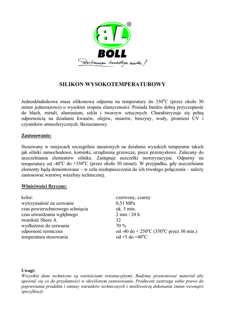 SILIKON WYSOKOTEMPERATUROWY Jednoskładnikowa masa silikonowa odporna na temperatury do 350oC (przez około 30 minut jednorazowo) o wysokim stopniu elastyczności. Posiada bardzo dobrą przyczepność do blach, metali, aluminium, szkła i tworzyw sztucznych. Charakteryzuje się pełną odpornością na działanie kwasów, olejów, smarów, benzyny, wody, promieni UV i czynników atmosferycznych. Bezoctanowy. Zastosowanie: Stosowany w miejscach szczególnie narażonych na działanie wysokich temperatur takich jak silniki samochodowe, kominki, urządzenia grzewcze, piece przemysłowe. Zalecany do uszczelniania elementów silnika. Zastępuje uszczelki motoryzacyjne. Odporny na temperatury od -40oC do +350oC (przez około 30 minut). W przypadku, gdy uszczelniane elementy będą demontowane – w celu niedopuszczenia do ich trwałego połączenia – należy zastosować warstwę wazeliny technicznej. Właściwości fizyczne: kolor: wytrzymałość na zerwanie czas powierzchniowego schnięcia czas utwardzania wgłębnego twardość Shore A wydłużenie do zerwania odporność termiczna temperatura stosowania czerwony, czarny 0,51 MPa ok. 5 min. 2 mm / 24 h 32 70 % od -40 do + 250oC (350oC przez 30 min.) od +5 do +40oC Uwagi: Wszystkie dane techniczne są wartościami orientacyjnymi. Radzimy przetestować materiał aby upewnić się co do przydatności w określonym zastosowaniu. Producent zastrzega sobie prawo do poprawiania produktu i zmiany warunków technicznych z możliwością dokonania zmian wewnątrz specyfikacji.