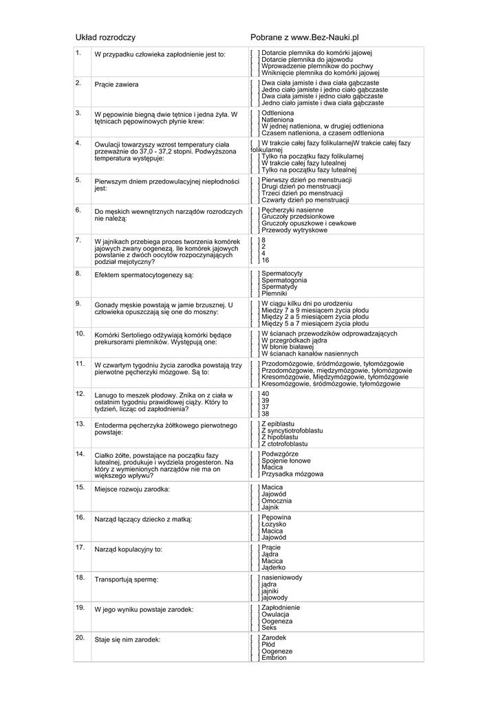 Układ rozrodczy Pobrane z www.Bez-Nauki.pl 1. W przypadku człowieka zapłodnienie jest to: 2. Prącie zawiera 3. W pępowinie biegną dwie tętnice i jedna żyła. W tętnicach pępowinowych płynie krew: 4. Owulacji towarzyszy wzrost temperatury ciała przeważnie do 37,0 - 37,2 stopni. Podwyższona temperatura występuje: 5. Pierwszym dniem przedowulacyjnej niepłodności jest: 6. Do męskich wewnętrznych narządów rozrodczych nie należą: 7. W jajnikach przebiega proces tworzenia komórek jajowych zwany oogenezą. Ile komórek jajowych powstanie z dwóch oocytów rozpoczynających podział mejotyczny? [ ] Dotarcie plemnika do komórki jajowej [ ] Dotarcie plemnika do jajowodu [ ] Wprowadzenie plemnikow do pochwy [ ] Wniknięcie plemnika do komórki jajowej [ ] Dwa ciała jamiste i dwa ciała gąbczaste [ ] Jedno ciało jamiste i jedno ciało gąbczaste [ ] Dwa ciała jamiste i jedno ciało gąbczaste [ ] Jedno ciało jamiste i dwa ciała gąbczaste [ ] Odtleniona [ ] Natleniona [ ] W jednej natleniona, w drugiej odtleniona [ ] Czasem natleniona, a czasem odtleniona [ ] W trakcie całej fazy folikularnejW trakcie całej fazy folikularnej [ ] Tylko na początku fazy folikularnej [ ] W trakcie całej fazy lutealnej [ ] Tylko na początku fazy lutealnej [ ] Pierwszy dzień po menstruacji [ ] Drugi dzień po menstruacji [ ] Trzeci dzień po menstruacji [ ] Czwarty dzień po menstruacji [ ] Pęcherzyki nasienne [ ] Gruczoły przedsionkowe [ ] Gruczoły opuszkowe i cewkowe [ ] Przewody wytryskowe [ ]8 [ ]2 [ ]4 [ ] 16 8. Efektem spermatocytogenezy są: 9. Gonady męskie powstają w jamie brzusznej. U człowieka opuszczają się one do moszny: 10. Komórki Sertoliego odżywiają komórki będące prekursorami plemników. Występują one: 11. W czwartym tygodniu życia zarodka powstają trzy pierwotne pęcherzyki mózgowe. Są to: 12. Lanugo to meszek płodowy. Znika on z ciała w ostatnim tygodniu prawidłowej ciąży. Który to tydzień, licząc od zapłodnienia? 13. Entoderma pęcherzyka żółtkowego pierwotnego powstaje: 14. Ciałko żółte, powstające na początku fazy lutealnej, produkuje i wydziela progesteron. Na który z wymienionych narządów nie ma on większego wpływu? 15. Miejsce rozwoju zarodka: 16. Narząd łączący dziecko z matką: 17. Narząd kopulacyjny to: 18. Transportują spermę: 19. W jego wyniku powstaje zarodek: 20. Staje się nim zarodek: [ [ [ [ [ [ [ [ [ [ [ [ [ [ [ [ [ [ [ [ [ [ [ [ [ [ [ [ ] Spermatocyty ] Spermatogonia ] Spermatydy ] Plemniki ] W ciągu kilku dni po urodzeniu ] Miedzy 7 a 9 miesiącem życia płodu ] Między 2 a 5 miesiącem życia płodu ] Między 5 a 7 miesiącem życia płodu ] W ścianach przewodzików odprowadzających ] W przegródkach jądra ] W błonie białawej ] W ścianach kanałów nasiennych ] Przodomózgowie, śródmózgowie, tyłomózgowie ] Przodomózgowie, międzymózgowie, tyłomózgowie ] Kresomózgowie, Międzymózgowie, tyłomózgowie ] Kresomózgowie, śródmózgowie, tyłomózgowie ] 40 ] 39 ] 37 ] 38 ] Z epiblastu ] Z syncytiotrofoblastu ] Z hipoblastu ] Z ctotrofoblastu ] Podwzgórze ] Spojenie łonowe ] Macica ] Przysadka mózgowa [ [ [ [ [ [ [ [ [ [ [ [ [ [ [ [ [ [ [ [ [ [ [ [ ] Macica ] Jajowód ] Omocznia ] Jajnik ] Pępowina ] Łozysko ] Macica ] Jajowód ] Prącie ] Jądra ] Macica ] Jąderko ] nasieniowody ] jądra ] jajniki ] jajowody ] Zapłodnienie ] Owulacja ] Oogeneza ] Seks ] Zarodek ] Płód ] Oogeneze ] Embrion Poprawne odpowiedzi 1. 3. 5. 7. 9. 11. 13. 15. 17. 19. Wniknięcie plemnika do komórki jajowej Odtleniona Pierwszy dzień po menstruacji 2 Miedzy 7 a 9 miesiącem życia płodu Przodomózgowie, śródmózgowie, tyłomózgowie Z hipoblastu Macica Prącie Zapłodnienie 2. 4. 6. 8. 10. 12. 14. 16. 18. 20. Dwa ciała jamiste i jedno ciało gąbczaste W trakcie całej fazy lutealnej Gruczoły przedsionkowe Spermatydy W ścianach kanałów nasiennych 38 Spojenie łonowe Łozysko nasieniowody Płód