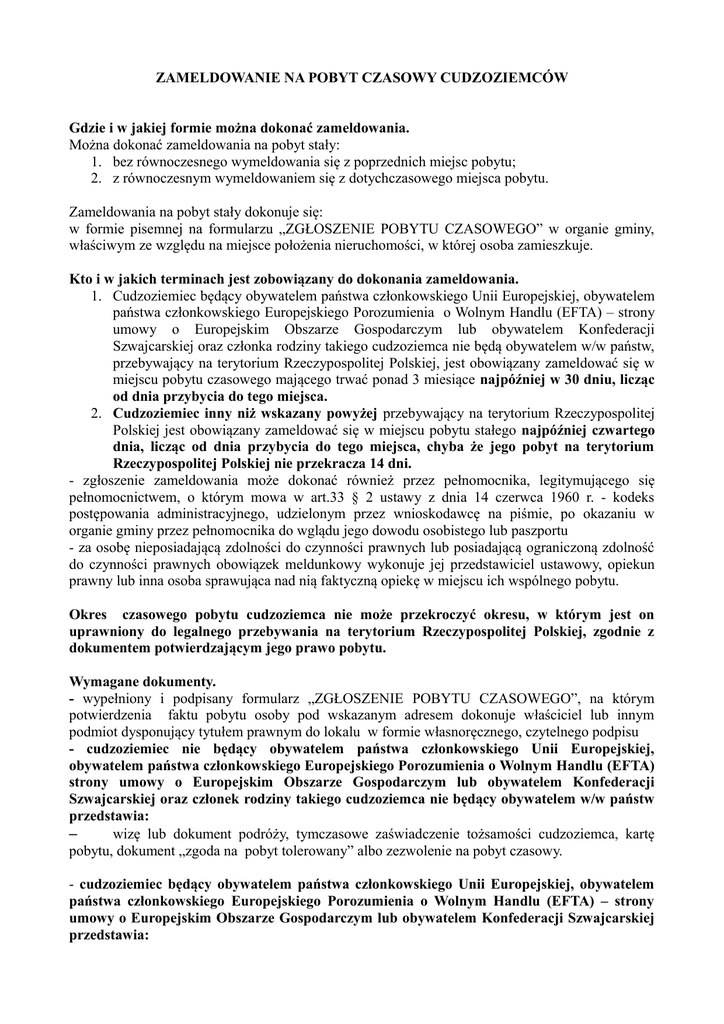 ZAMELDOWANIE NA POBYT CZASOWY CUDZOZIEMCÓW Gdzie i w jakiej formie można dokonać zameldowania. Można dokonać zameldowania na pobyt stały: 1. bez równoczesnego wymeldowania się z poprzednich miejsc pobytu; 2. z równoczesnym wymeldowaniem się z dotychczasowego miejsca pobytu. Zameldowania na pobyt stały dokonuje się: w formie pisemnej na formularzu „ZGŁOSZENIE POBYTU CZASOWEGO” w organie gminy, właściwym ze względu na miejsce położenia nieruchomości, w której osoba zamieszkuje. Kto i w jakich terminach jest zobowiązany do dokonania zameldowania. 1. Cudzoziemiec będący obywatelem państwa członkowskiego Unii Europejskiej, obywatelem państwa członkowskiego Europejskiego Porozumienia o Wolnym Handlu (EFTA) – strony umowy o Europejskim Obszarze Gospodarczym lub obywatelem Konfederacji Szwajcarskiej oraz członka rodziny takiego cudzoziemca nie będą obywatelem w/w państw, przebywający na terytorium Rzeczypospolitej Polskiej, jest obowiązany zameldować się w miejscu pobytu czasowego mającego trwać ponad 3 miesiące najpóźniej w 30 dniu, licząc od dnia przybycia do tego miejsca. 2. Cudzoziemiec inny niż wskazany powyżej przebywający na terytorium Rzeczypospolitej Polskiej jest obowiązany zameldować się w miejscu pobytu stałego najpóźniej czwartego dnia, licząc od dnia przybycia do tego miejsca, chyba że jego pobyt na terytorium Rzeczypospolitej Polskiej nie przekracza 14 dni. - zgłoszenie zameldowania może dokonać również przez pełnomocnika, legitymującego się pełnomocnictwem, o którym mowa w art.33 § 2 ustawy z dnia 14 czerwca 1960 r. - kodeks postępowania administracyjnego, udzielonym przez wnioskodawcę na piśmie, po okazaniu w organie gminy przez pełnomocnika do wglądu jego dowodu osobistego lub paszportu - za osobę nieposiadającą zdolności do czynności prawnych lub posiadającą ograniczoną zdolność do czynności prawnych obowiązek meldunkowy wykonuje jej przedstawiciel ustawowy, opiekun prawny lub inna osoba sprawująca nad nią faktyczną opiekę w miejscu ich wspólnego pobytu. Okres czasowego pobytu cudzoziemca nie może przekroczyć okresu, w którym jest on uprawniony do legalnego przebywania na terytorium Rzeczypospolitej Polskiej, zgodnie z dokumentem potwierdzającym jego prawo pobytu. Wymagane dokumenty. - wypełniony i podpisany formularz „ZGŁOSZENIE POBYTU CZASOWEGO”, na którym potwierdzenia faktu pobytu osoby pod wskazanym adresem dokonuje właściciel lub innym podmiot dysponujący tytułem prawnym do lokalu w formie własnoręcznego, czytelnego podpisu - cudzoziemiec nie będący obywatelem państwa członkowskiego Unii Europejskiej, obywatelem państwa członkowskiego Europejskiego Porozumienia o Wolnym Handlu (EFTA) strony umowy o Europejskim Obszarze Gospodarczym lub obywatelem Konfederacji Szwajcarskiej oraz członek rodziny takiego cudzoziemca nie będący obywatelem w/w państw przedstawia: – wizę lub dokument podróży, tymczasowe zaświadczenie tożsamości cudzoziemca, kartę pobytu, dokument „zgoda na pobyt tolerowany” albo zezwolenie na pobyt czasowy. - cudzoziemiec będący obywatelem państwa członkowskiego Unii Europejskiej, obywatelem państwa członkowskiego Europejskiego Porozumienia o Wolnym Handlu (EFTA) – strony umowy o Europejskim Obszarze Gospodarczym lub obywatelem Konfederacji Szwajcarskiej przedstawia: – ważny dokument podróży lub inny ważny dokument potwierdzający jego tożsamość i obywatelstwo oraz ważny dokument potwierdzający prawo stałego pobytu, albo zaświadczenie o zarejestrowaniu pobytu obywatela Unii Europejskiej lub w przypadku braku zaświadczenia, składa oświadczenie o zarejestrowaniu pobytu, na terytorium Rzeczypospolitej Polskiej. do wglądu – dokument potwierdzający tytuł prawny do lokalu, np. umowa cywilno-prawna, wypis z księgi wieczystej, decyzja administracyjna, orzeczenie sądu lub inny dokument poświadczający tytuł prawny do lokalu. Miejsce i termin złożenia dokumentów. - Wypełniony i podpisany formularz „ZGŁOSZNIE POBYTU SCZASOWEGO” należy złożyć w Urzędzie Miasta i Gminy w Swarzędzu, Referat Spraw Obywatelskich w Swarzędzu, ul. Poznańska 25 II p. pok. 209, tel. 61 65-12-310. Termin i sposób załatwienia sprawy. 1. Niezwłocznie – w chwili przyjęcia przez organ gminy zgłoszenia meldunkowego Organ gminy wydaje takiej osobie z urzędu „ZAŚWIADCZENIE O ZAMEDLOWANIU NA POBYT CZASOWY”, ważne do chwili zmiany miejsca zameldowania jednak nie dłużej niż do upływu terminu zameldowania. Opłaty. Czynność zameldowania jest wolna od opłat. Wydanie „ ZAŚWIADCZENIA O ZAMELDOWANIU NA POBYT CZASOWY” podlega opłacie skarbowej określonej w ustawie o opłacie skarbowej.
