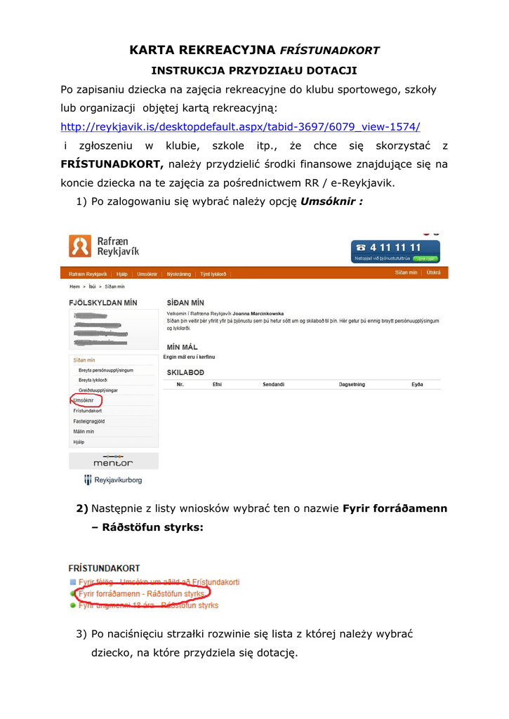 KARTA REKREACYJNA FRÍSTUNADKORT INSTRUKCJA PRZYDZIAŁU DOTACJI Po zapisaniu dziecka na zajęcia rekreacyjne do klubu sportowego, szkoły lub organizacji objętej kartą rekreacyjną: http://reykjavik.is/desktopdefault.aspx/tabid-3697/6079_view-1574/ i zgłoszeniu w klubie, szkole itp., że chce się skorzystać z FRÍSTUNADKORT, należy przydzielić środki finansowe znajdujące się na koncie dziecka na te zajęcia za pośrednictwem RR / e-Reykjavik. 1) Po zalogowaniu się wybrać należy opcję Umsóknir : 2) Następnie z listy wniosków wybrać ten o nazwie Fyrir forráðamenn – Ráðstöfun styrks: 3) Po naciśnięciu strzałki rozwinie się lista z której należy wybrać dziecko, na które przydziela się dotację. 4) Wyświetli się następująca strona: Ráðstofun styrks – oznacza przydział dotacji 5) W tym miejscu powinna pojawić się nazwa organizacji, kursu, okres jego trwania, cena itp. Pod Ráðstofun znajdować powinna się wielkość dostępnej dotacji. W tym miejscu należy wpisać wielkość, którą chce się przydzielić (z dostępnych 25.000). Dotację można rodzielać, ale nie na więcej niż trzy organizacje w semestrze. 6) Operację należy zatwierdzić.