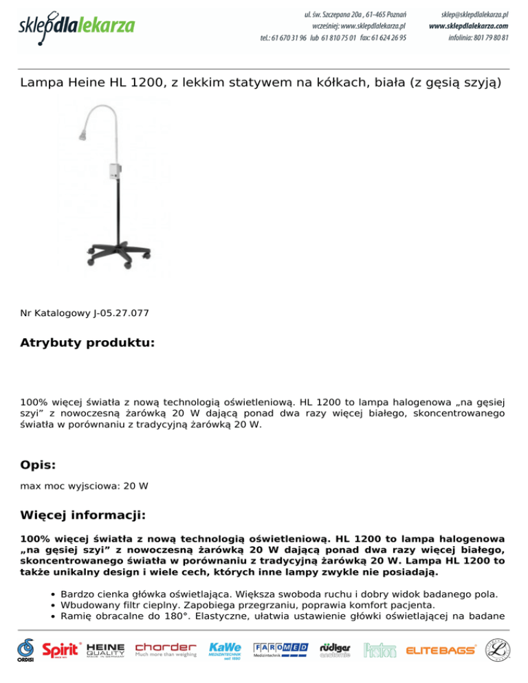 Lampa Heine HL 1200, z lekkim statywem na kółkach, biała (z gęsią szyją) Nr Katalogowy J-05.27.077 Atrybuty produktu: 100% więcej światła z nową technologią oświetleniową. HL 1200 to lampa halogenowa „na gęsiej szyi” z nowoczesną żarówką 20 W dającą ponad dwa razy więcej białego, skoncentrowanego światła w porównaniu z tradycyjną żarówką 20 W. Opis: max moc wyjsciowa: 20 W Więcej informacji: 100% więcej światła z nową technologią oświetleniową. HL 1200 to lampa halogenowa „na gęsiej szyi” z nowoczesną żarówką 20 W dającą ponad dwa razy więcej białego, skoncentrowanego światła w porównaniu z tradycyjną żarówką 20 W. Lampa HL 1200 to także unikalny design i wiele cech, których inne lampy zwykle nie posiadają. Bardzo cienka główka oświetlająca. Większa swoboda ruchu i dobry widok badanego pola. Wbudowany filtr cieplny. Zapobiega przegrzaniu, poprawia komfort pacjenta. Ramię obracalne do 180°. Elastyczne, ułatwia ustawienie główki oświetlającej na badane pole. Najwyższa jakość wykonania. Gwarantowane bezpieczeństwo pacjenta i badającego. Stabilne, giętkie ramię. Ustawiane na dowolnej pozycji, nie opada, zawsze zostaje na ustawionej pozycji. Metalowy statyw na kółkach, Bezpieczny w szpitalu i praktyce lekarskiej. Żarówka 12 V/ 20 WAT. Żywotność 4000 godzin. Jasne, białe światło do 90 000 luksów w odległości 30cm. Powered by TCPDF (www.tcpdf.org)