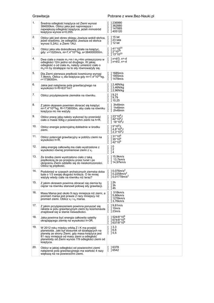 Grawitacja Pobrane z www.Bez-Nauki.pl 1. Średnia odległość księżyca od Ziemi wynosi 384000km. Oblicz jaka jest najmniejsza i największą odległość księżyca, jeżeli mimośród księżyca wynosi e=0,055. [ [ [ [ 2. Oblicz jaki jest okres obiegu Jowisza wokół słońca, [ ] 15 lat [ ] 23 lata jeżeli wiadomo, że odległość Jowisza od słońca [ ] 12 lat wynosi 5,2AU, a Ziemi 1AU. 3. Oblicz jaka siła dośrodkowa działa na księżyc, gdy: v=1020m/s, m=7,4*1022kg, a=384000000m. 4. Dwa ciała o masie m1=m i m2=4m umieszczono w odległości 12m jedno od drugiego. W jakiej odległość o od ciała m1 należy umieścić ciało o m3=m by działające na to siły równoważyły się. 5. Dla Ziemi pierwsza prędkość kosmiczna wynosi 7,9km/s. Oblicz vI dla księżyca gdy m=7,4*1022kg, r=1738000m. 6. Jakie jest natężenie pola grawitacyjnego na wysokości h=R=6371m? 7. 8. Oblicz pracę jaką należy wykonać by przenieść ciało o masie 50kg z powierzchni ziemi na h=R. 10. Oblicz energie potencjalną dokładnie w środku ziemi. 11. Oblicz potencjał grawitacyjny w pobliżu ziemi na wysokości h=R. 12. Jaką energię całkowitą ma ciało wystrzelone z wysokości równej promieniowi ziemi z vI. 13. Ze środka ziemi wystrzelono ciało z taką prędkością że po przejściu przez tunel i po okręceniu Ziemi oddaliło się do nieskończoności. Oblicz tą prędkość. 14. Podobnież w czasach archaicznych ziemska doba była o 1/3 swojej długości krótsza. O ile mniej ważyły wtedy ciała na równiku niż teraz? 15. Z jakim okresem powinna obracać się ziemia by ciężar na równiku stanowił połowę siły grawitacji. 17. ] 41*1020 ] 2*1020 ] 13*1020 ] x=d/3, x=-d ] x=d/2, x=-d [ ] 1685m/s [ ] 1955m/s [ ] 1478m/s [ [ [ [ Oblicz przyśpieszenie ziemskie na równiku. [ [ [ Z jakim okresem powinien obracać się księżyc m=7,4*1022kg, R=1738000m, aby ciała na równiku [ [ księżyca nic nie ważyły. 9. 16. [ [ [ [ [ ] 236990 ] 362880 ] 147885 ] 405120 [ [ [ [ [ [ [ [ [ [ [ [ [ [ [ ] 2,46N/kg ] 3,46N/kg ] 2,96N/kg ] 9,21 ] 9,79 ] 10,25 ] 3h48min ] 1h48min ] 2h48min ] 23*108J ] 42*108J ] 16*108J ] 5*109J ] 4,8*109J ] 2,3*109J ] 31*106 ] 35*106 ] 42*106 ]0 ]2 ]4 ] 15,9km/s ] 13,7km/s ] 14,97km/s [ ] 0,076m/s2 [ ] 0,2258m/s2 [ ] 0,01778m/s2 [ [ [ Masa Marsa jest około 9 razy mniejsza niż ziemi, a [ [ promień marsa jest prawie 2 razy mniejszy niż [ promień ziemi. Oblicz vI i vII marsa. [ [ Z jakim przyśpieszeniem powinna poruszać się rakieta w polu grawitacyjnym ziemi by kosmonauta [ [ znajdował się w stanie nieważkości. ] 2h ] 3h ] 4h ] 518km/s ] 5,66km/s ] 1276km/s ] 3,76km/s ] 9,81m/s ] 10m/s ] 23m/s [ [ [ [ [ [ ] 524/8*106 ] 674/8*106 ] 637/8*106 ] 3,3 ] 6,6 ] 5,5 18. Jaka powinna być energia całkowita satelity okrążającego ziemię na wysokości h=3R. 19. W 2012 roku miedzy orbitą Z i K ma przejść planetoida. Jaki był stosunek sił działających na planetę ze strony Ziemi, gdy masa księżyca jest 81 razy mniejsza od masy ziemi a odległość planetoidy od Ziemi wynosi 7/9 odległości ziemi od księżyca. 20. Oblicz w jakiej odległości od powierzchni ziemi natężenie pola grawitacyjnego ma wartość 4 razy większą niż na powierzchni ziemi. [ ] 6378 [ ] 6542 Poprawne odpowiedzi 1. 2. 12 lat 3. 5. 7. 9. 11. 13. 15. 362880, 405120 2*1020 1685m/s 9,79 16*108J 31*106 13,7km/s 2h 4. 6. 8. 10. 12. 14. 16. 17. 19. 10m/s 6,6 18. 20. x=d/3, x=-d 2,46N/kg 1h48min 4,8*109J 0 0,076m/s2 518km/s, 3,76km/s 637/8*106 6378