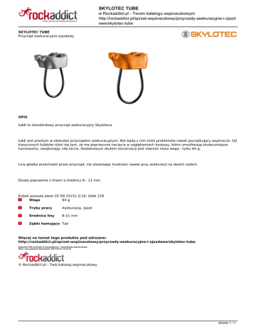 SKYLOTEC TUBE w Rockaddict.pl - Twoim katalogu wspinaczkowym http://rockaddict.pl/sprzet-wspinaczkowy/przyrzady-asekuracyjne-i-zjazd owe/skylotec-tube SKYLOTEC TUBE Przyrząd asekuracyjno-zjazdowy OPIS tubE to standardowy przyrząd asekuracyjny Skyloteca. tubE jest prostym w obsłudze przyrządem asekuracyjnym. Nie będą z nim mieli problemów nawet początkujący wspinacze. Od klasycznych kubków różni się tym, że ma poprzeczne nacięcia w zagłębieniach korpusu, które umożliwiają skuteczniejsze hamowanie, zwiększając siłę tarcia. Dodatkowym atutem konstrukcji jest również niska waga - tylko 64 g. Lina gładko przechodzi przez przyrząd, nie stwarzając trudności nawet przy asekuracji na dwóch żyłach. Działa poprawnie z linami o średnicy 8 - 11 mm. Kubek posiada atest CE EN 15151-2:10, UIAA 129 Waga 64 g Tryby pracy Asekuracja, zjazd Średnica liny 8-11 mm Ząbki hamujące Tak Więcej na temat tego produktu pod adresem: http://rockaddict.pl/sprzet-wspinaczkowy/przyrzady-asekuracyjne-i-zjazdowe/skylotec-tube Dokument PDF pochodzi ze Rockaddict.pl - Twój katalog wspinaczkowy Data i czas pobrania dokumentu: 2017-03-07 13:31:35 © Rockaddict.pl - Twój katalog wspinaczkowy strona 1 / 1 Powered by TCPDF (www.tcpdf.org)