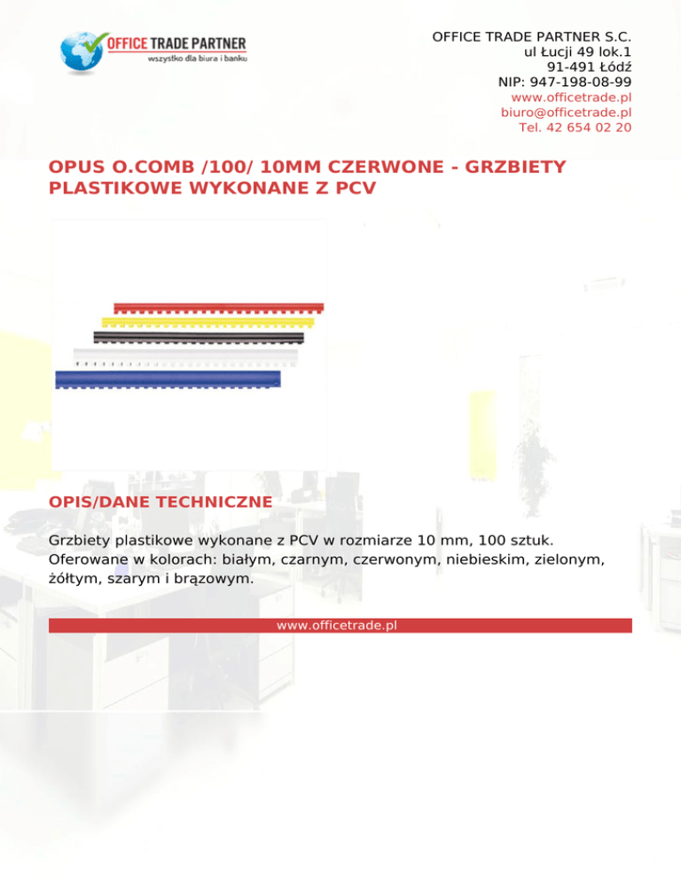 OFFICE TRADE PARTNER S.C. ul Łucji 49 lok.1 91-491 Łódź NIP: 947-198-08-99 www.officetrade.pl [email protected] Tel. 42 654 02 20 OPUS O.COMB /100/ 10MM CZERWONE - GRZBIETY PLASTIKOWE WYKONANE Z PCV OPIS/DANE TECHNICZNE Grzbiety plastikowe wykonane z PCV w rozmiarze 10 mm, 100 sztuk. Oferowane w kolorach: białym, czarnym, czerwonym, niebieskim, zielonym, żółtym, szarym i brązowym. www.officetrade.pl Powered by TCPDF (www.tcpdf.org)