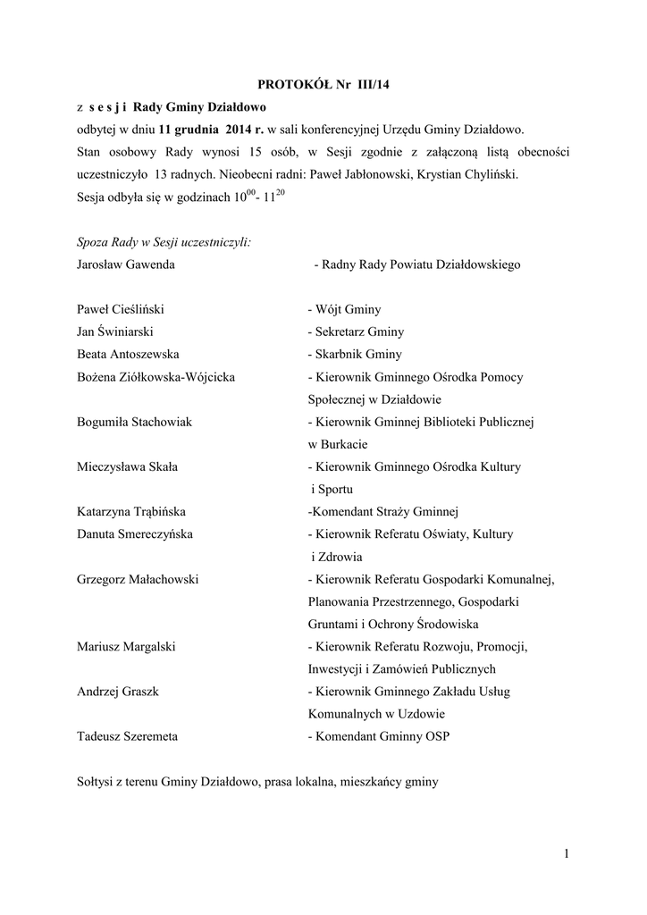 PROTOKÓŁ Nr III/14 z s e s j i Rady Gminy Działdowo odbytej w dniu 11 grudnia 2014 r. w sali konferencyjnej Urzędu Gminy Działdowo. Stan osobowy Rady wynosi 15 osób, w Sesji zgodnie z załączoną listą obecności uczestniczyło 13 radnych. Nieobecni radni: Paweł Jabłonowski, Krystian Chyliński. Sesja odbyła się w godzinach 1000- 1120 Spoza Rady w Sesji uczestniczyli: Jarosław Gawenda - Radny Rady Powiatu Działdowskiego Paweł Cieśliński - Wójt Gminy Jan Świniarski - Sekretarz Gminy Beata Antoszewska - Skarbnik Gminy Bożena Ziółkowska-Wójcicka - Kierownik Gminnego Ośrodka Pomocy Społecznej w Działdowie Bogumiła Stachowiak - Kierownik Gminnej Biblioteki Publicznej w Burkacie Mieczysława Skała - Kierownik Gminnego Ośrodka Kultury i Sportu Katarzyna Trąbińska -Komendant Straży Gminnej Danuta Smereczyńska - Kierownik Referatu Oświaty, Kultury i Zdrowia Grzegorz Małachowski - Kierownik Referatu Gospodarki Komunalnej, Planowania Przestrzennego, Gospodarki Gruntami i Ochrony Środowiska Mariusz Margalski - Kierownik Referatu Rozwoju, Promocji, Inwestycji i Zamówień Publicznych Andrzej Graszk - Kierownik Gminnego Zakładu Usług Komunalnych w Uzdowie Tadeusz Szeremeta - Komendant Gminny OSP Sołtysi z terenu Gminy Działdowo, prasa lokalna, mieszkańcy gminy 1 Ad. pkt 1 Przewodniczący M.Zieliński dokonał otwarcia III sesji Rady Gminy, powitał uczestników sesji i na podstawie listy obecności stwierdził prawomocność obrad. Ad.pkt 2 Przewodniczący M.Zieliński wnioskował o wprowadzenie do porządku obrad dwóch dodatkowych projektów uchwał: - projekt uchwały w sprawie zmian w składach osobowych Stałych Komisji Rady Gminy Działdowo, - projekt uchwały w sprawie powołania Komisji Rewizyjnej oraz wyboru Przewodniczącego i Zastępcy Przewodniczącego Komisji Rewizyjnej Rady Gminy Działdowo. Przewodniczący Rady zaproponował wprowadzenie ww. punktów do porządku obrad jako pkt 13. Podjęcie uchwały w sprawie zmian w składach osobowych Stałych Komisji Rady Gminy Działdowo oraz pkt 14 Podjęcie uchwały w sprawie powołania Komisji Rewizyjnej oraz wyboru Przewodniczącego i Zastępcy Przewodniczącego Komisji Rewizyjnej Rady Gminy Działdowo. Następnie kolejno pkt 15. Sprawy bieżące oraz pkt 16. Zamknięcie obrad. Rada jednogłośnie przyjęła proponowane zmiany, przyjmując następnie jednogłośnie porządek obrad po uwzględnieniu wprowadzonych zmian w brzmieniu: 1. Otwarcie i stwierdzenie prawomocności obrad. 2. Rozpatrzenie wniosków do porządku obrad. 3. Przyjęcie protokołu z II Sesji Rady Gminy. 4. Wolne wnioski i zapytania. 5. Informacja Wójta z działalności w okresie międzysesyjnym. 6. Podjęcie uchwały w sprawie zmiany w budżecie gminy Działdowo na 2014 r. 7. Podjęcie uchwały w sprawie opłaty targowej. 8. Podjęcie uchwały w sprawie określenia wysokości stawek podatku od nieruchomości. 9. Podjęcie uchwały w sprawie określenia wysokości stawek podatku od środków transportowych. 10. Podjęcie uchwały w sprawie opłaty od posiadania psów. 11. Podjęcie uchwały w sprawie obniżenia średniej ceny sprzedaży drewna dla celów wymiaru podatku leśnego. 2 12. Podjęcie uchwały w sprawie wynagrodzenia Wójta Gminy Działdowo. 13. Podjęcie uchwały w sprawie zmian w składach osobowych Stałych Komisji Rady Gminy Działdowo. 14. Podjęcie uchwały w sprawie powołania Komisji Rewizyjnej oraz wyboru Przewodniczącego i Zastępcy Przewodniczącego Komisji Rewizyjnej Rady Gminy Działdowo. 15. Sprawy bieżące. 16. Zamknięcie obrad. Ad.pkt 3 Protokół z ostatniej sesji został przyjęty jednogłośnie bez odczytania. Ad. pkt 4-5 Radny P.Stańczak zapytał czy prowadzono rozmowy w sprawie przekształcenia planu zagospodarowania przestrzennego gminy w odniesieniu do kwestii budowy kurników. Sołtys B.Jaroszewski zapytał czy rozpatrzono już wniosek dotyczący planowanej termomodernizacji budynków gminnych. Sołtys Sołectwa Pierławki W.Płocharczyk zapytał czy będzie remontowana droga w kierunku Skurpia (dojazd przez tory do wiatraków). Sołtys Sołectwa Niestoja W.Nadwodny zwrócił się z prośbą o niedokonywanie zmian w planie, pozostawienie terenów rolnych, z uwagi na planowany wykup gruntów prawdopodobnie pod wysypisko. Wójt Gminy P.Cieśliński poinformował o wstępnie przeprowadzonej rozmowie z przedstawicielem firmy BDK, zajmującej się opracowywaniem zmian w planie. Wyjaśnił, że pracownicy firmy mają rozeznać się jaką drogą postępować w tym zakresie. Prawdopodobnie w styczniu przystąpimy do zmian planu. W odpowiedzi na pytanie dotyczące rozpatrzenia wniosku o dofinansowanie termomodernizacji budynków gminnych Wójt P.Cieślinski przekazał, że wniosek został pozytywnie zaopiniowany. Czekamy na ostateczne podjęcie decyzji. Możliwe, że na ostatniej sesji będziemy posiadali już informację. Nawiązując do pytania Sołtysa W.Płocharczyk Wójt Gminy poinformował, że droga w kierunku Skurpia będzie modernizowana. W styczniu mają być transportowane turbiny wiatrowe do miejscowości Skurpie. Mamy podpisane porozumienie, że w razie zniszczeń 3 firma ponosi koszty. W grudniu powinni ją przebudować, jeśli chcą przewozić turbiny w miesiącu styczniu. Wójt Gminy odpowiadając na pytanie sołtysa W.Nadwodnego wspomniał o braku możliwości przywożenia na teren gminy, powiatu i związku śmieci z innych terenów. Występują dwa składowiska w Ciechanówku i w Zakrzewie. Inne nie są planowane przez najbliższe 20 lat. Wszystkie śmieci przewożone są na sortownię, skąd te, których nie można odzyskać trafiają na wysypisko. Nie są planowane zmiany w planie. Następnie Wójt P.Cieśliński nawiązał do bieżących spraw. Przekazał, że radni i sołtysi otrzymali informacje dotyczące akcji zimowej, która zawiera również dane dotyczące firm obsługujących. Wspomniał o tym, aby wszelkie uwagi zgłaszać do pracowników. Radny P.Stańczak odwołał się do os