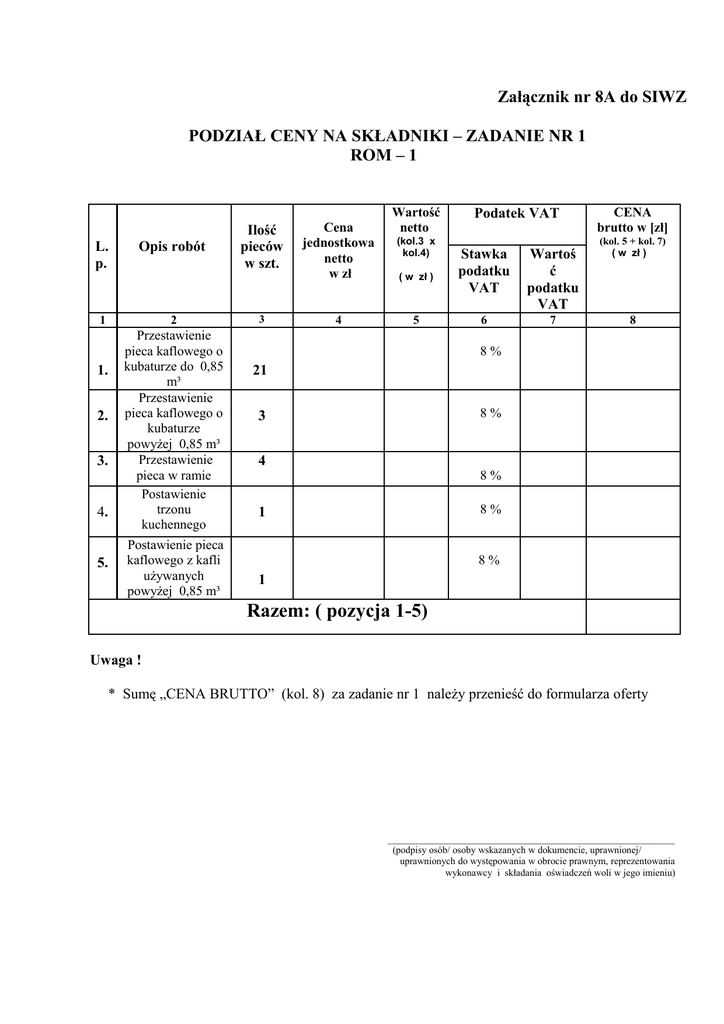 Załącznik nr 8A do SIWZ PODZIAŁ CENY NA SKŁADNIKI – ZADANIE NR 1 ROM – 1 L. p. Opis robót 1 2 1. Przestawienie pieca kaflowego o kubaturze do 0,85 m³ Przestawienie pieca kaflowego o kubaturze powyżej 0,85 m³ Przestawienie pieca w ramie Postawienie trzonu kuchennego 2. 3. 4. 5. Postawienie pieca kaflowego z kafli używanych powyżej 0,85 m³ Ilość pieców w szt. Cena jednostkowa netto w zł 3 4 Wartość netto (kol.3 x kol.4) ( w zł ) 5 Podatek VAT Stawka podatku VAT Wartoś ć podatku VAT 6 7 CENA brutto w [zł] (kol. 5 + kol. 7) ( w zł ) 8 8% 21 8% 3 4 8% 8% 1 8% 1 Razem: ( pozycja 1-5) Uwaga ! * Sumę „CENA BRUTTO” (kol. 8) za zadanie nr 1 należy przenieść do formularza oferty ___________________________________________________________ (podpisy osób/ osoby wskazanych w dokumencie, uprawnionej/ uprawnionych do występowania w obrocie prawnym, reprezentowania wykonawcy i składania oświadczeń woli w jego imieniu) Załącznik nr 8B do SIWZ PODZIAŁ CENY NA SKŁADNIKI – ZADANIE NR 2 ROM – 2 L .p . Opis robót 1 2 1. Przestawienie pieca kaflowego o kubaturze do 0,85 m³ 2. 3. 4. 5. Przestawienie pieca kaflowego o kubaturze powyżej 0,85 m³ Przestawienie pieca zabytkowego o kubaturze 1,16 m³ Postawienie pieca kaflowego z kafli używanych o kubaturze do 0,85 m³ Postawienie pieca w ramie Ilość pieców w szt. Cena jednostkowa netto w zł 3 4 Wartość netto (kol.3 x kol.4) ( w zł ) 5 Podatek VAT Stawka podatku VAT Wart ość podat ku VAT 6 7 CENA brutto w [zł] (kol. 5 + kol. 7) ( w zł ) 8 8% 20 7 8% 1 8% 6 8% 2 8% Razem: ( pozycja 1-5) Uwaga ! * Sumę „CENA BRUTTO” (kol. 8) za zadanie nr 2 należy przenieść do formularza oferty ___________________________________________________________ (podpisy osób/ osoby wskazanych w dokumencie, uprawnionej/ uprawnionych do występowania w obrocie prawnym, reprezentowania wykonawcy i składania oświadczeń woli w jego imieniu)
