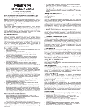 Po wyjęciu paska testowego z pojemnika, należy niezwłocznie nałożyć pokrywkę i dokładnie zamknąć opakowanie. Nie należy zginać, przecinać czy w jakikolwiek inny sposób modyfikować INSTRUKCJA UŻYCIA Pasków testowych ABRA Do testowania glukozy w pełnej krwi kapilarnej Wyrób do samodzielnego stosowania. Wyrób do diagnostyki in vitro. Nie należy podejmować żadnych działań o charakterze medycznym bez uprzedniej konsultacji z lekarzem. WAŻNE: Przed rozpoczęciem używania pasków testowych ABRA prosimy o zapoznanie się z poniższymi informacjami i instrukcją użycia zestawu ABRA. Jeśli instrukcja lub wyniki pomiaru są dla Państwa niejasne, prosimy o kontakt z działem obsługi klienta Diagnosis. ZASTOSOWANIE Paski testowe ABRA do pomiaru poziomu glukozy należy stosować z glukometrem ABRA w celu ilościowego pomiaru glukozy (cukru) w pełnej krwi pobranej z opuszki palca, dłoni lub przedramienia. System pomiaru poziomu glukozy we krwi ABRA jest przeznaczony dla użytkowników nieprofesjonalnych i powinien być używany przez jedną osobę. Paski testowe ABRA służą do użytku zewnętrznego (diagnostyka in vitro). ZASADA TESTOWANIA Każdy pasek testowy posiada obszar testowy zawierający reaktywne substancje chemiczne. Aplikacja próbki krwi w tym obszarze powoduje reakcję chemiczną, a następnie wytworzenie prądu elektrycznego. Stężenie glukozy we krwi obliczane jest na podstawie odnotowanego przez glukometr prądu elektrycznego, a uzyskany wynik zostaje pokazany na wyświetlaczu. Test mierzy poziom glukozy w zakresie od 20 mg/dL (1.1mmol/L) do 600 mg/dL (33.3 mmol/L). Pasek testowy ABRA jest skalibrowany tak, aby wyświetlał równowartość wartości glukozy w osoczu, co ułatwia porównanie z wynikami otrzymanymi metodami laboratoryjnymi. ŚRODKI OSTROŻNOŚCI Paski testowe przeznaczone są jedynie do celów diagnostyki in vitro (do użytku zewnętrznego). Paski testowe są jednorazowego użytku. Nie należy używać pasków testowych po upływie daty ważności wydrukowanej na opakowaniu, ponieważ może to spowodować uzyskanie niedokładnych wyników. Należy wyrzucić pojemnik i wszystkie niezużyte paski testowe po upływie 3 miesięcy od otwarcia opakowania. Zbyt długie działanie powietrza na paski testowe może zniszczyć umieszczone na nich substancje chemiczne, a w następstwie spowodować uzyskanie niedokładnych wyników. Próbka krwi jest zasysana przez krótką krawędź paska testowego. Aplikacja krwi lub płynu kontrolnego na wierzch, prawą lub lewą krawędź paska testowego może spowodować uzyskanie niedokładnych wyników. Pojemnik z paskami testowymi należy przechowywać poza zasięgiem dzieci. Pokrywka stwarza ryzyko zadławienia. Pokrywka i pojemnik zawierają substancje osuszające chroniące paski testowe. Substancje te mogą być szkodliwe, jeśli dostaną się do dróg oddechowych lub zostaną połknięte, mogą też powodować podrażnienie skóry lub oczu. Nie zaleca się wprowadzania zmian w stosowaniu leków w oparciu o wyniki pomiarów poziomu glukozy we krwi wykonanych przy pomocy glukometru ABRA bez zgody i zalecenia lekarza. Przed wprowadzeniem zmian w planie leczenia bazujących na wynikach pomiaru poziomu glukozy, skonsultuj się z lekarzem. Poważne odwodnienie i duża utrata wody może spowodować fałszywie zaniżony wynik testu. Jeśli uważasz, że cierpisz na odwodnienie, niezwłocznie skontaktuj się z lekarzem. Wszelkie przedmioty zanieczyszczone krwią należy ostrożnie usunąć zgodnie z obowiązującymi przepisami. Jeśli wyniki testu płynu kontrolnego ABRA nie mieszczą się w zakresie wydrukowanym na opakowaniu pasków testowych, powtórz test przy użyciu nowego paska. Jeśli powtórnie uzyskasz wynik poza zakresem wydrukowanym na opakowaniu, może to oznaczać, że glukometr ABRA działa nieprawidłowo. NIE UŻYWAJ zestawu do pomiaru glukozy we krwi jeżeli wynik testu z płynem kontrolnym przekracza zakres wydrukowany na opakowaniu pasków testowych PRZECHOWYWANIE I CZYSZCZENIE Przechowywać w temperaturze pokojowej 4-30°C (39-86°F). Nie przechowywać w lodówce lub zamrażalniku. Należy unikać ekspozycji pasków na wysokie i niskie temperatury. Przechowywać z dala od bezpośredniego nasłonecznienia i źródła ciepła. Zużyj każdy pasek bezpośrednio po wyjęciu go z opakowania. Przechowuj paski testowe jedynie w oryginalnym opakowaniu. Pokrywka lub pojemnik zawierają substancje osuszające chroniące paski testowe. Nie należy przekładać pasków testowych do nowego pojemnika lub innego opakowania. paska testowego. Wyjmując pasek testowy z pojemnika lub wkładając go do glukometru należy czystymi suchymi dłońmi delikatnie uchwycić pasek w dowolnym miejscu. JAK PRZEPROWADZIĆ TEST? Szczegółowy opis sposobu przeprowadzenia testu zawarty jest w instrukcji użycia zestawu ABRA . Ostrzeżenie Glukometr i nakłuwacz przeznaczone są do użytku przez jedną osobę. NIE NALEŻY ich pożyczać innym osobom, nawet członkom rodziny! Urządzenie nie może być stosowane przez kilka osób! Wszystkie części zestawu należy traktować jako zagrożenie biologiczne, które może potencjalnie przenosić choroby zakaźne, nawet po jego wyczyszczeniu i zdezynfekowaniu. Informacje dotyczące czyszczenia glukometru i nakłuwacza zawarte są w rozdziale „Procedura czyszczenia i dezynfekowania" w instrukcji użycia zestawu. 1. Wybierz miejsce wkłucia, z którego pobierzesz krew. Standardowym miejscem pobrania próbki krwi jest opuszka palca. Istnieje również możliwość pobierania próbki krwi z miejsc alternatywnych (AST). Szczegóły dotyczące pobierania próbki krwi znajdują się w instrukcji użycia zestawu ABRA. 2. Testowanie poziomu glukozy we krwi Włóż pasek testowy do glukometru. Glukometr włączy się automatycznie. Użyj nakłuwacza, aby pobrać kroplę krwi odpowiedniej wielkości. Instrukcje odnośnie nakłucia opisano w instrukcji użycia dołączonej do nakłuwacza. Po