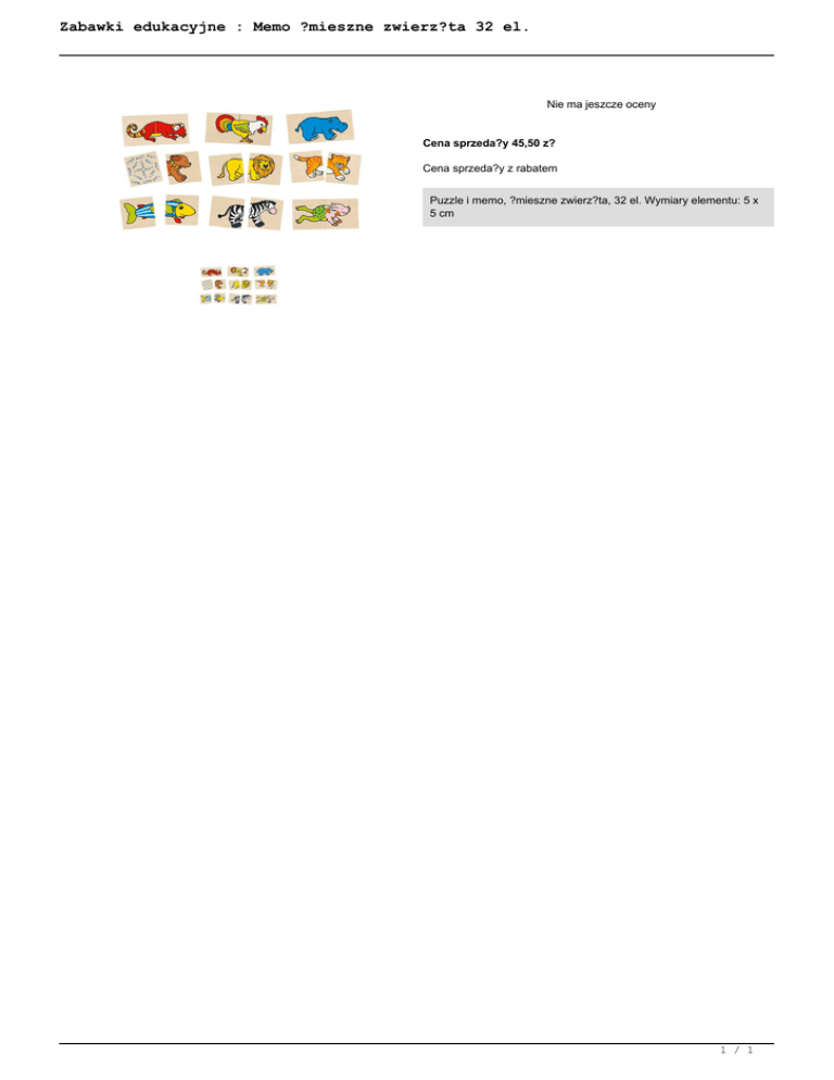 Zabawki edukacyjne : Memo ?mieszne zwierz?ta 32 el. Nie ma jeszcze oceny Cena sprzeda?y 45,50 z? Cena sprzeda?y z rabatem Puzzle i memo, ?mieszne zwierz?ta, 32 el. Wymiary elementu: 5 x 5 cm 1 / 1 Powered by TCPDF (www.tcpdf.org)
