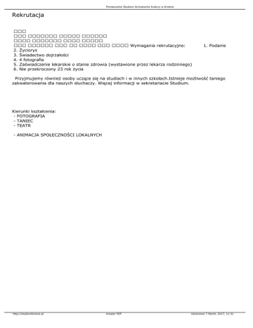 Pomaturalne Studium Animatorów Kultury w Krośnie Rekrutacja Wymagania rekrutacyjne: 2. Życiorys 3. Świadectwo dojrzałości 4. 4 fotografie 5. Zaświadczenie lekarskie o stanie zdrowia (wystawione przez lekarza rodzinnego) 6. Nie przekroczony 23 rok życia 1. Podanie Przyjmujemy również osoby uczące się na studiach i w innych szkołach.Istnieje możliwość taniego zakwaterowania dla naszych słuchaczy. Więcej informacji w sekretariacie Studium. Kierunki kształcenia: - FOTOGRAFIA - TANIEC - TEATR - ANIMACJA SPOŁECZNOŚCI LOKALNYCH http://studiumkrosno.pl Kreator PDF Utworzono 7 March, 2017, 11:31