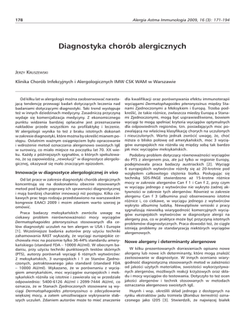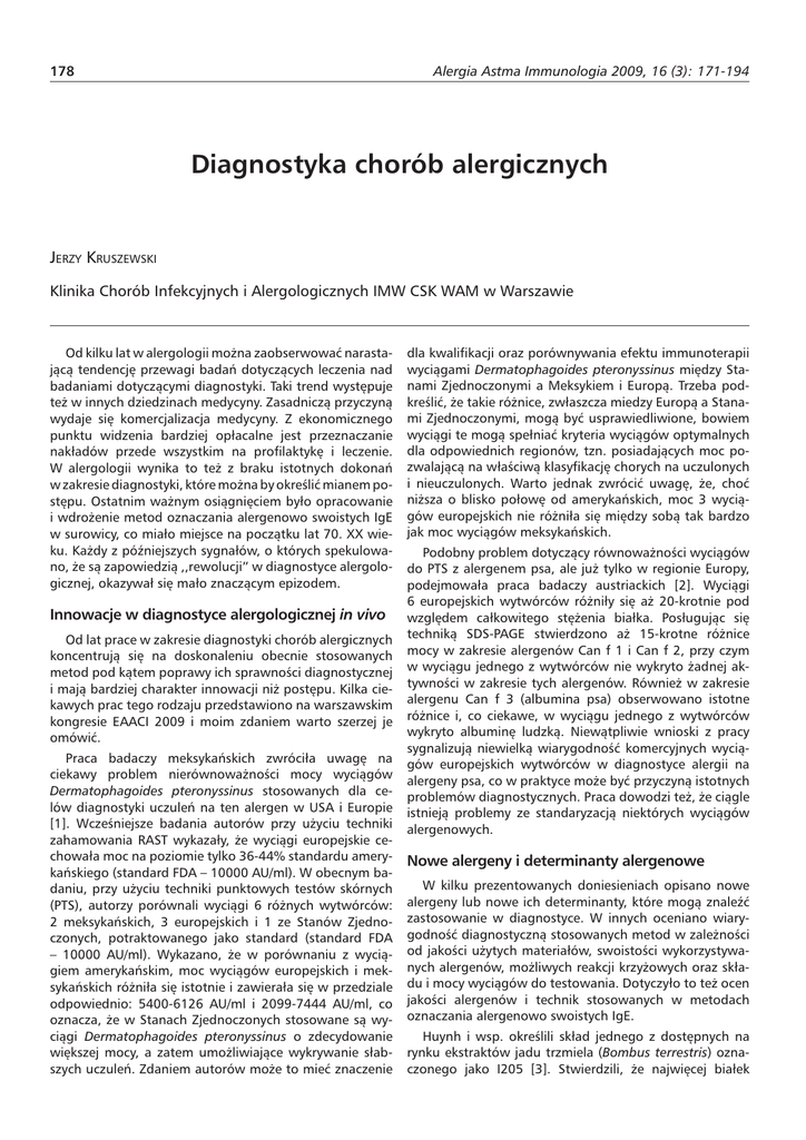 178 Alergia Astma Immunologia 2009, 16 (3): 171-194 Diagnostyka chorób alergicznych JERZY KRUSZEWSKI Klinika Chorób Infekcyjnych i Alergologicznych IMW CSK WAM w Warszawie Od kilku lat w alergologii można zaobserwować narastającą tendencję przewagi badań dotyczących leczenia nad badaniami dotyczącymi diagnostyki. Taki trend występuje też w innych dziedzinach medycyny. Zasadniczą przyczyną wydaje się komercjalizacja medycyny. Z ekonomicznego punktu widzenia bardziej opłacalne jest przeznaczanie nakładów przede wszystkim na profilaktykę i leczenie. W alergologii wynika to też z braku istotnych dokonań w zakresie diagnostyki, które można by określić mianem postępu. Ostatnim ważnym osiągnięciem było opracowanie i wdrożenie metod oznaczania alergenowo swoistych IgE w surowicy, co miało miejsce na początku lat 70. XX wieku. Każdy z późniejszych sygnałów, o których spekulowano, że są zapowiedzią ,,rewolucji” w diagnostyce alergologicznej, okazywał się mało znaczącym epizodem. Innowacje w diagnostyce alergologicznej in vivo Od lat prace w zakresie diagnostyki chorób alergicznych koncentrują się na doskonaleniu obecnie stosowanych metod pod kątem poprawy ich sprawności diagnostycznej i mają bardziej charakter innowacji niż postępu. Kilka ciekawych prac tego rodzaju przedstawiono na warszawskim kongresie EAACI 2009 i moim zdaniem warto szerzej je omówić. Praca badaczy meksykańskich zwróciła uwagę na ciekawy problem nierównoważności mocy wyciągów Dermatophagoides pteronyssinus stosowanych dla celów diagnostyki uczuleń na ten alergen w USA i Europie [1]. Wcześniejsze badania autorów przy użyciu techniki zahamowania RAST wykazały, że wyciągi europejskie cechowała moc na poziomie tylko 36-44% standardu amerykańskiego (standard FDA – 10000 AU/ml). W obecnym badaniu, przy użyciu techniki punktowych testów skórnych (PTS), autorzy porównali wyciągi 6 różnych wytwórców: 2 meksykańskich, 3 europejskich i 1 ze Stanów Zjednoczonych, potraktowanego jako standard (standard FDA – 10000 AU/ml). Wykazano, że w porównaniu z wyciągiem amerykańskim, moc wyciągów europejskich i meksykańskich różniła się istotnie i zawierała się w przedziale odpowiednio: 5400-6126 AU/ml i 2099-7444 AU/ml, co oznacza, że w Stanach Zjednoczonych stosowane są wyciągi Dermatophagoides pteronyssinus o zdecydowanie większej mocy, a zatem umożliwiające wykrywanie słabszych uczuleń. Zdaniem autorów może to mieć znaczenie dla kwalifikacji oraz porównywania efektu immunoterapii wyciągami Dermatophagoides pteronyssinus między Stanami Zjednoczonymi a Meksykiem i Europą. Trzeba podkreślić, że takie różnice, zwłaszcza miedzy Europą a Stanami Zjednoczonymi, mogą być usprawiedliwione, bowiem wyciągi te mogą spełniać kryteria wyciągów optymalnych dla odpowiednich regionów, tzn. posiadających moc pozwalającą na właściwą klasyfikację chorych na uczulonych i nieuczulonych. Warto jednak zwrócić uwagę, że, choć niższa o blisko połowę od amerykańskich, moc 3 wyciągów europejskich nie różniła się między sobą tak bardzo jak moc wyciągów meksykańskich. Podobny problem dotyczący równoważności wyciągów do PTS z alergenem psa, ale już tylko w regionie Europy, podejmowała praca badaczy austriackich [2]. Wyciągi 6 europejskich wytwórców różniły się aż 20-krotnie pod względem całkowitego stężenia białka. Posługując się techniką SDS-PAGE stwierdzono aż 15-krotne różnice mocy w zakresie alergenów Can f 1 i Can f 2, przy czym w wyciągu jednego z wytwórców nie wykryto żadnej aktywności w zakresie tych alergenów. Również w zakresie alergenu Can f 3 (albumina psa) obserwowano istotne różnice i, co ciekawe, w wyciągu jednego z wytwórców wykryto albuminę ludzką. Niewątpliwie wnioski z pracy sygnalizują niewielką wiarygodność komercyjnych wyciągów europejskich wytwórców w diagnostyce alergii na alergeny psa, co w praktyce może być przyczyną istotnych problemów diagnostycznych. Praca dowodzi też, że ciągle istnieją problemy ze standaryzacją niektórych wyciągów alergenowych. Nowe alergeny i determinanty alergenowe W kilku prezentowanych doniesieniach opisano nowe alergeny lub nowe ich determinanty, które mogą znaleźć zastosowanie w diagnostyce. W innych oceniano wiarygodność diagnostyczną stosowanych metod w zależności od jakości użytych materiałów, swoistości wykorzystywanych alergenów, możliwych reakcji krzyżowych oraz składu i mocy wyciągów do testowania. Dotyczyło to też ocen jakości alergenów i technik stosowanych w metodach oznaczania alergenowo swoistych IgE. Huynh i wsp. określili skład jednego z dostępnych na rynku ekstraktów jadu trzmiela (Bombus terrestris) oznaczonego jako I205 [3]. Stwierdzili, że najwięcej białek 179 Alergia Astma Immunologia 2009, 16 (3): 171-194 wiążących się ze swoistymi IgE występowało we frakcjach o ciężarze od 10 do 100 kDa. Posługując się techniką IMMULITE® 2000 3gAllergy™, wykazali, że ponad 90% surowic pacjentów uczulonych na jad pszczoły reagowało również z ekstraktem jadu trzmiela. Badany ekstrakt praktycznie w jednakowym stopniu, ponad 90%, hamował swoiste reakcje z jadem pszczoły i jadem trzmiela. Moim zdaniem badania te potwierdziły słuszność dotychczasowych zaleceń o możliwości diagnozowania uczulenia na jad trzmiela przy użyciu jadu pszczoły i odwrotnie. Standardyzacji składu wyciągów do badania uczulenia na pyłek drzewa oliwnego poświęcona była praca badaczy hiszpańskich [4]. Autorzy oceniali 3 alergeny pyłków: Ole e 1, Ole e 2 i Ole e 9 otrzymywane z pyłków oliwki europejskiej (Olea europaea) przy użyciu filtracji w żelu oraz różnych metod chromatograficznych. Do oceny ich zawartości w wyciągach stosowano metodę ELISA i przeciwciała monoklonalne: 5A3 mAb dla Ole e 1, dwa rodzaje mAbs 5F2 i 3H8 dla Ole e 2 i 8D5 mAb dla Ole e