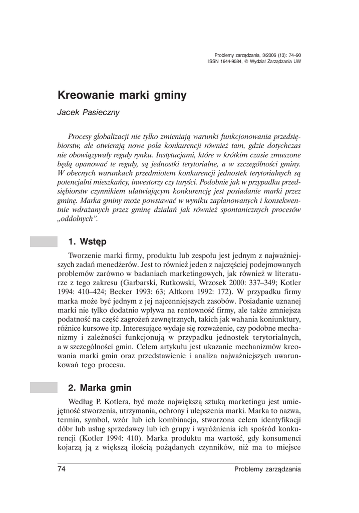 Problemy zarządzania, 3/2006 (13): 74–90 ISSN 1644-9584, © Wydział Zarządzania UW Kreowanie marki gminy Jacek Pasieczny Procesy globalizacji nie tylko zmieniają warunki funkcjonowania przedsiębiorstw, ale otwierają nowe pola konkurencji również tam, gdzie dotychczas nie obowiązywały reguły rynku. Instytucjami, które w krótkim czasie zmuszone będą opanować te reguły, są jednostki terytorialne, a w szczególności gminy. W obecnych warunkach przedmiotem konkurencji jednostek terytorialnych są potencjalni mieszkańcy, inwestorzy czy turyści. Podobnie jak w przypadku przedsiębiorstw czynnikiem ułatwiającym konkurencję jest posiadanie marki przez gminę. Marka gminy może powstawać w wyniku zaplanowanych i konsekwentnie wdrażanych przez gminę działań jak również spontanicznych procesów „oddolnych”. 1. Wstęp Tworzenie marki firmy, produktu lub zespołu jest jednym z najważniejszych zadań menedżerów. Jest to również jeden z najczęściej podejmowanych problemów zarówno w badaniach marketingowych, jak również w literaturze z tego zakresu (Garbarski, Rutkowski, Wrzosek 2000: 337–349; Kotler 1994: 410–424; Becker 1993: 63; Altkorn 1992: 172). W przypadku firmy marka może być jednym z jej najcenniejszych zasobów. Posiadanie uznanej marki nie tylko dodatnio wpływa na rentowność firmy, ale także zmniejsza podatność na część zagrożeń zewnętrznych, takich jak wahania koniunktury, różnice kursowe itp. Interesujące wydaje się rozważenie, czy podobne mechanizmy i zależności funkcjonują w przypadku jednostek terytorialnych, a w szczególności gmin. Celem artykułu jest ukazanie mechanizmów kreowania marki gmin oraz przedstawienie i analiza najważniejszych uwarunkowań tego procesu. 2. Marka gmin Według P. Kotlera, być może największą sztuką marketingu jest umiejętność stworzenia, utrzymania, ochrony i ulepszenia marki. Marka to nazwa, termin, symbol, wzór lub ich kombinacja, stworzona celem identyfikacji dóbr lub usług sprzedawcy lub ich grupy i wyróżnienia ich spośród konkurencji (Kotler 1994: 410). Marka produktu ma wartość, gdy konsumenci kojarzą ją z większą ilością pożądanych czynników, niż ma to miejsce 74 Problemy zarządzania