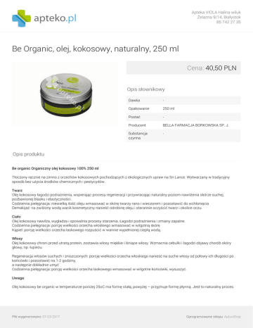 Apteka VIOLA Halina wiluk Żelazna 9/14, Białystok 85 742 27 35 Be Organic, olej, kokosowy, naturalny, 250 ml Cena: 40,50 PLN Opis słownikowy Dawka - Opakowanie 250 ml Postać - Producent BELLA FARMACJA BORKOWSKA SP. J. Substancja czynna - Opis produktu Be organic Organiczny olej kokosowy 100% 250 ml Tłoczony ręcznie na zimno z orzechów kokosowych pochodzących z ekologicznych upraw na Sri Lance. Wytwarzany w tradycyjny sposób bez użycia środków chemicznych i pestycydów. Twarz Olej kokosowy łagodzi podrażnienia, wspierając procesy regeneracji i przywracając naturalny poziom nawilżenia skórze suchej, pozbawionej blasku i elastyczności. Codzienna pielęgnacja: niewielką ilość oleju wmasować w skórę twarzy rano i wieczorem i pozostawić do wchłonięcia Demakijaż: na zwilżony wodą wacik kosmetyczny nanieść odrobinę oleju i starannie oczyścić twarz i okolice oczu. Ciało Olej kokosowy nawilża, wygładza i spowalnia procesy starzenia. Łagodzi podrażnienia i zmiany zapalne. Codzienna pielęgnacja: porcję wielkości orzecha włoskiego wmasować w wilgotną skórę Kąpiel: porcję wielkości orzecha laskowego rozpuścić w wannie wypełnionej ciepłą wodą. Włosy Olej kokosowy chroni przed utratą protein, zostawia włosy miękkie i lśniące włosy. Wzmacnia cebulki i łagodzi objawy chorób skóry głowy, np. łupieżu. Regeneracja włosów suchych i zniszczonych: porcję wielkości orzecha włoskiego nanieść na suche włosy od połowy ich długości po końcówki i pozostawić na 1-2 godziny, a następnie dokładnie umyć Codzienna pielęgnacja: porcję wielkości orzecha laskowego wmasować w wilgotne końcówki, wysuszyć. Uwaga: Olej kokosowy be organic w temperaturze poniżej 25oC ma formę stałą, powyżej – przyjmuje formę płynną. Jest to naturalny proces. Plik wygenerowano: 07-03-2017 Oprogramowanie sklepu: AptusShop Apteka VIOLA Halina wiluk Żelazna 9/14, Białystok 85 742 27 35 Opakowania kosmetyków be organic są w 100% biodegradowalne Składniki: ORGANICZNY OLEJ KOKOSOWY 100% Plik wygenerowano: 07-03-2017 Powered by TCPDF (www.tcpdf.org) Oprogramowanie sklepu: AptusShop