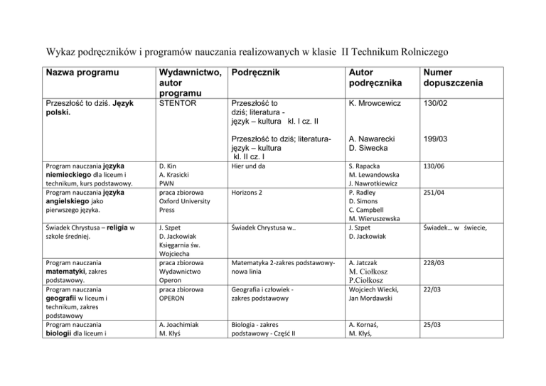 Wykaz podręczników i programów nauczania realizowanych w klasie II Technikum Rolniczego Nazwa programu Wydawnictwo, autor programu Podręcznik Autor podręcznika Numer dopuszczenia Przeszłość to dziś. Język polski. STENTOR Przeszłość to dziś; literatura język – kultura kl. I cz. II K. Mrowcewicz 130/02 Przeszłość to dziś; literaturajęzyk – kultura kl. II cz. I A. Nawarecki D. Siwecka 199/03 S. Rapacka M. Lewandowska J. Nawrotkiewicz P. Radley D. Simons C. Campbell M. Wieruszewska J. Szpet D. Jackowiak 130/06 Matematyka 2-zakres podstawowynowa linia A. Jatczak 228/03 Program nauczania języka niemieckiego dla liceum i technikum, kurs podstawowy. Program nauczania języka angielskiego jako pierwszego języka. D. Kin A. Krasicki PWN praca zbiorowa Oxford University Press Hier und da Świadek Chrystusa – religia w szkole średniej. J. Szpet D. Jackowiak Księgarnia św. Wojciecha praca zbiorowa Wydawnictwo Operon praca zbiorowa OPERON Świadek Chrystusa w.. Geografia i człowiek zakres podstawowy Wojciech Wiecki, Jan Mordawski 22/03 A. Joachimiak M. Kłyś Biologia - zakres podstawowy - Część II A. Kornaś, M. Kłyś, 25/03 Program nauczania matematyki, zakres podstawowy. Program nauczania geografii w liceum i technikum, zakres podstawowy Program nauczania biologii dla liceum i Horizons 2 251/04 Świadek… w świecie, M. Ciołkosz P.Ciołkosz technikum. A. Kornaś Nowa Era R. Konieczny, L.. Śliwa, A. Joachimiak M. Fiałkowska K. Fiałkowski Sagnowska Fizyka i astronomia dla każdego. Program nauczania w zakresie podstawowym. praca zbiorowa ZAMKOR Fizyka dla szkoł ponadgimnazjalnych. Poznać przeszłość, zrozumieć dziś. Program nauczania historii w liceum i technikum. Program nauczania przysposobienia obronnego dla szkół ponadgimnazjalnych. Program nauczania chemii dla liceum i technikum zakres podstawowy. Grzegorz Szczepaoski, STENTOR Poznać przeszłość, zrozumieć dziś. Michał Kopczyoski 118/06 WSiP Przysposobienie obronne. B. Breitkopf M. Marciniak Z. Worwa 107/02 praca zbiorowa Operon Chemia 3 S. Hejwowska R. Marcinkowski J. Staluszka 313/03 Nazwa przedmiotu Podręcznik Autor podręcznika Produkcja roślinna Produkcja roślinna cz. III Hortpress Ekonomika i zarządzanie przedsiębiorstwem w agrobiznesie Praca zbiorowa pod red. Witolda Grzebisza Bogdan Klepacki Anna Grontkowska Dębski Praca zbiorowa pod red. dr Teresy Nałęcz-Tarwackiej Czesław Waszkiewicz 46/02 Przedmioty zawodowe Ekonomika i zarządzanie przedsiębiorstwem w agrobiznesie Produkcja zwierzęca Mechanizacja rolnictwa Produkcja zwierzęca cz.II Hortpress Maszyny rolnicze – produkcja zwierzęca Numer dopuszczenia 2009 13/2007 28/2006 17/95