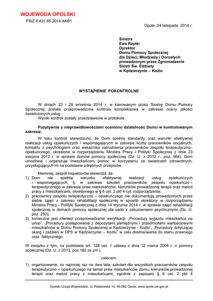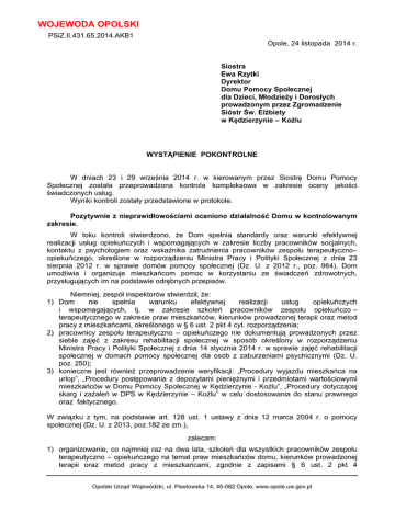 WOJEWODA OPOLSKI PSiZ.II.431.65.2014.AKB1 Opole, 24 listopada 2014 r. Siostra Ewa Rzytki Dyrektor Domu Pomocy Społecznej dla Dzieci, Młodzieży i Dorosłych prowadzonym przez Zgromadzenie Sióstr Św. Elżbiety w Kędzierzynie – Koźlu WYSTĄPIENIE POKONTROLNE W dniach 23 i 29 września 2014 r. w kierowanym przez Siostrę Domu Pomocy Społecznej została przeprowadzona kontrola kompleksowa w zakresie oceny jakości świadczonych usług. Wyniki kontroli zostały przedstawione w protokole. Pozytywnie z nieprawidłowościami oceniono działalność Domu w kontrolowanym zakresie. W toku kontroli stwierdzono, że Dom spełnia standardy oraz warunki efektywnej realizacji usług opiekuńczych i wspomagających w zakresie liczby pracowników socjalnych, kontaktu z psychologiem oraz wskaźnika zatrudnienia pracowników zespołu terapeutyczno– opiekuńczego, określone w rozporządzeniu Ministra Pracy i Polityki Społecznej z dnia 23 sierpnia 2012 r. w sprawie domów pomocy społecznej (Dz. U. z 2012 r., poz. 964). Dom umożliwia i organizuje mieszkańcom pomoc w korzystaniu ze świadczeń zdrowotnych, przysługujących im na podstawie odrębnych przepisów. Niemniej, zespół inspektorów stwierdził, że: 1) Dom nie spełnia warunku efektywnej realizacji usług opiekuńczych i wspomagających, tj. w zakresie szkoleń pracowników zespołu opiekuńczo – terapeutycznego w zakresie praw mieszkańców, kierunków prowadzonej terapii oraz metod pracy z mieszkańcami, określonego w § 6 ust. 2 pkt 4 cyt. rozporządzenia; 2) pracownicy zespołu terapeutyczno – opiekuńczego nie dokumentują prowadzonych przez siebie zajęć z zakresu rehabilitacji społecznej w sposób określony w rozporządzeniu Ministra Pracy i Polityki Społecznej z dnia 14 stycznia 2014 r. w sprawie zajęć rehabilitacji społecznej w domach pomocy społecznej dla osób z zaburzeniami psychicznymi (Dz. U. poz. 250); 3) konieczne jest również przeprowadzenie weryfikacji: „Procedury wyjazdu mieszkańca na urlop”, „Procedury postępowania z depozytami pieniężnymi i przedmiotami wartościowymi mieszkańców w Domu Pomocy Społecznej w Kędzierzynie - Koźlu”, „Procedury dotyczącej skarg i zażaleń w DPS w Kędzierzynie – Koźlu” w celu dostosowania do stanu prawnego oraz faktycznego. W związku z tym, na podstawie art. 128 ust. 1 ustawy z dnia 12 marca 2004 r. o pomocy społecznej (Dz. U. z 2013, poz.182 ze zm.), zalecam: 1) organizowanie, co najmniej raz na dwa lata, szkoleń dla wszystkich pracowników zespołu terapeutyczno – opiekuńczego na temat praw mieszkańców domu, kierunków prowadzonej terapii oraz metod pracy z mieszkańcami, zgodnie z zapisami § 6 ust. 2 pkt 4 Opolski Urząd Wojewódzki, ul. Piastowska 14, 45-082 Opole, www.opole.uw.gov.pl rozporządzenia Ministra Pracy i Polityki Społecznej z dnia 23 sierpnia 2012 r. w sprawie domów pomocy społecznej (Dz. U. z 2012 r., poz. 964); 2) dokumentowanie przez pracowników zespołu terapeutyczno–opiekuńczego prowadzonych przez siebie zajęć z zakresu rehabilitacji społecznej, w sposób określony w rozporządzeniu Ministra Pracy i Polityki Społecznej z dnia 14 stycznia 2014 r. w sprawie zajęć rehabilitacji społecznej w domach pomocy społecznej dla osób z zaburzeniami psychicznymi (Dz. U. poz. 250); 3) dostosowanie zapisów: „Procedury wyjazdu mieszkańca na urlop”, „Procedury postępowania z depozytami pieniężnymi i przedmiotami wartościowymi mieszkańców w Domu Pomocy Społecznej w Kędzierzynie - Koźlu”, „Procedury dotyczącej skarg i zażaleń w DPS w Kędzierzynie – Koźlu” do stanu prawnego oraz faktycznego. Informację o sposobie wykonania zaleceń należy przedłożyć w terminie 30 dni od dnia otrzymania niniejszego wystąpienia. Zgodnie z art. 128 ust. 2 ustawy o pomocy społecznej jednostka kontrolowana może w terminie 7 dni od dnia otrzymania zaleceń pokontrolnych, zgłosić do nich zastrzeżenia. Z up. Wojewody Opolskiego Joanna Chmura Zastępca Dyrektora Wydziału Polityki Społecznej i Zdrowia Opolski Urząd Wojewódzki, ul. Piastowska 14, 45-082 Opole, www.opole.uw.gov.pl
