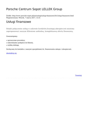 Porsche Centrum Sopot LELLEK Group Źródło: http://www.porsche-sopot.pl/pos/uslugi/uslugi-finansowe/29,Uslugi-finansowe.html Wygenerowano: Wtorek, 7 marca 2017, 13:31 Usługi finansowe Dzięki połączeniu usług w zakresie kredytów,leasingu,ubezpieczeń możemy zaproponować naszym Klientom unikalną, kompleksową ofertę finansową. Gwarantujemy: ● uproszczone procedury, ● indywidualne podejście do Klienta, ● szybką obsługę. Zachęcamy do kontaktu z naszymi specjalistami ds. finansowania zakupu i ubezpieczeń. skontaktuj się Tweetnij